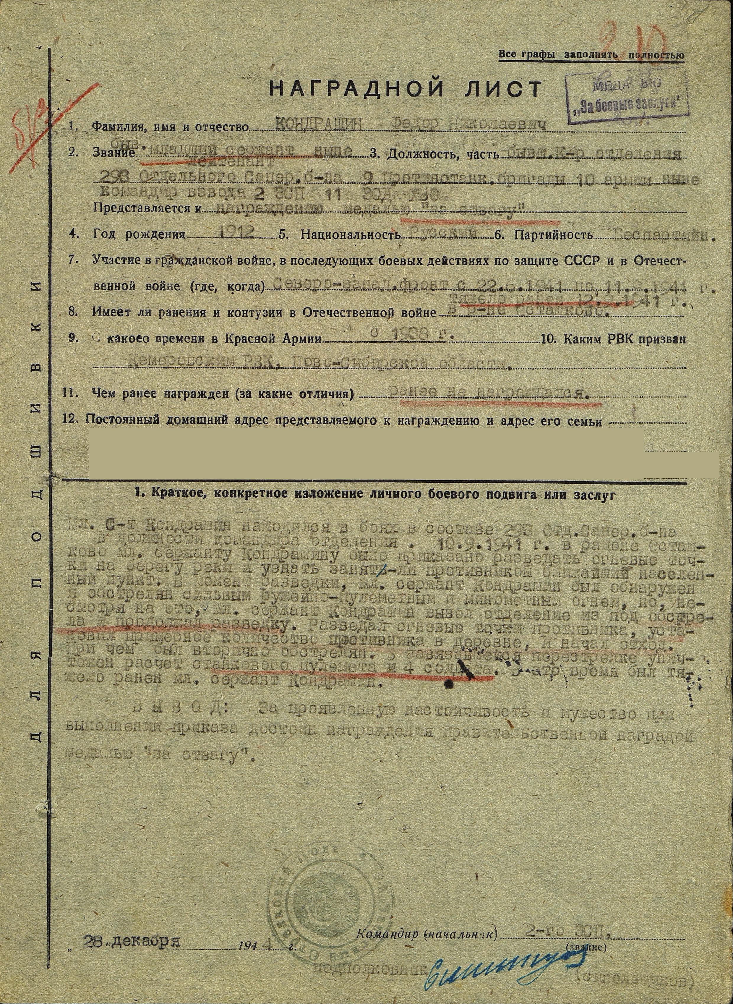 Кондрашин Фёдор Николаевич в 1938 году закончил лесной техникум и был призван в армию в декабре 1938 года в род войск - пехота в должности - стрелок. Воевал на Финской и в начале ВОВ. В районе села Осташково в звании мл. сержанта получил приказ разведать огневые точки противника. Задание группа под его руководством выполнила, хотя и была обнаружена и обстрелена минометным огнем. При возвращении группа была обстреляна повторно. В завязавшейся перестрелке был уничтожен расчет станкового пулемета. В это время Кондрашин Ф.Н. был тяжело ранен осколком мины. Задание было выполнено в связи с чем его предоставили к награде. Это видно из наградного листа. Ранение было тяжелое. Осколок попал в легкое, но врачи спасли жизнь, но осколок так и остался в легком, с ним и был похоронен. Четыре месяца был в эвакогоспитале, затем окончил Одесское пехотное училище курсантом и по его окончании был переведен по состоянию здоровья в запасной стрелковый полк в должности командира взвода и занимался подготовкой бойцов и отправкой их на фронт. Приказом Юж. УРВО № 360 от 18.07.1942 года присвоено звание - лейтенант. После войны женился и у него родились три дочери.