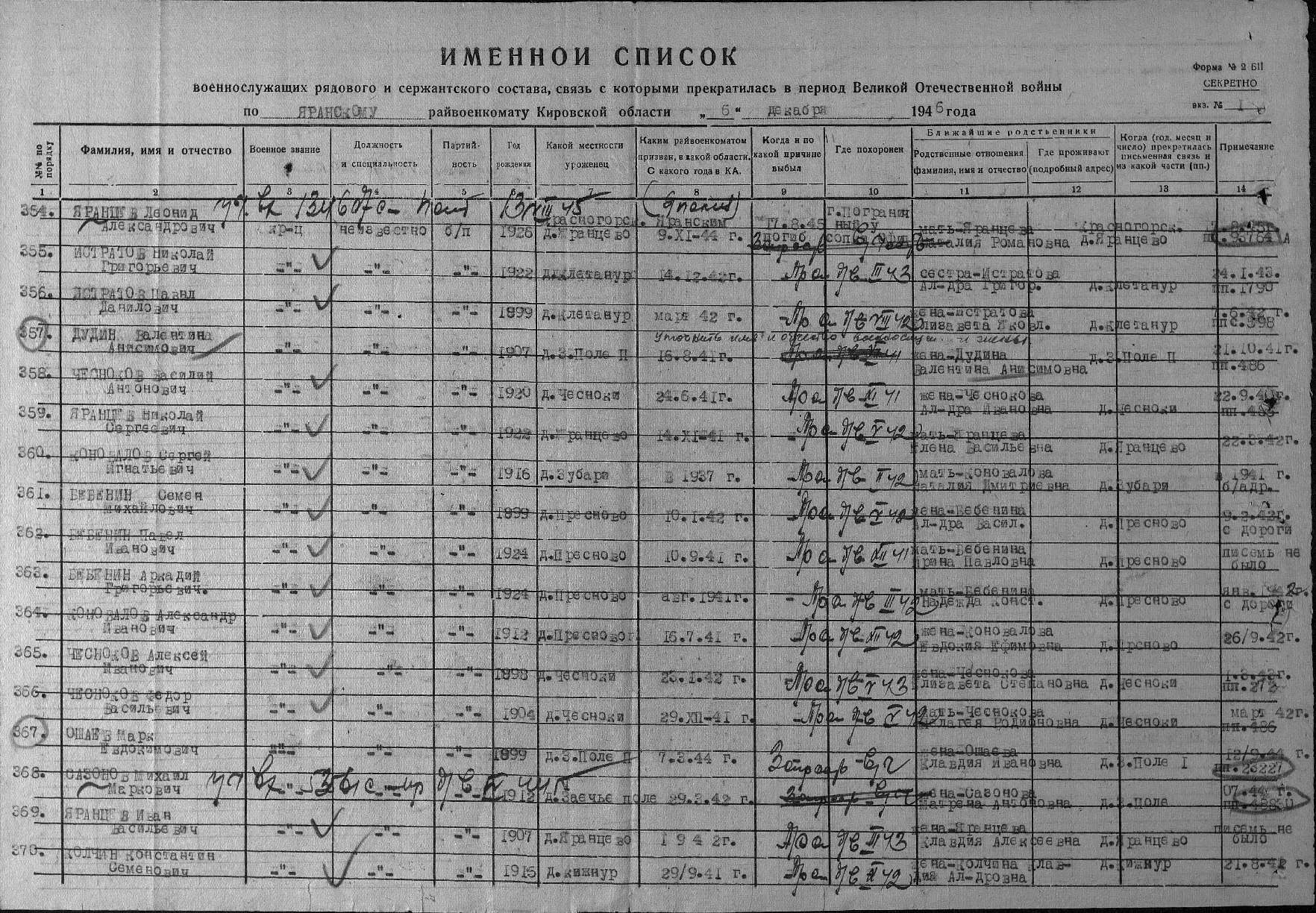В именном списке военнослужащих по Яранскому райвоенкомату Кировской области под № 364