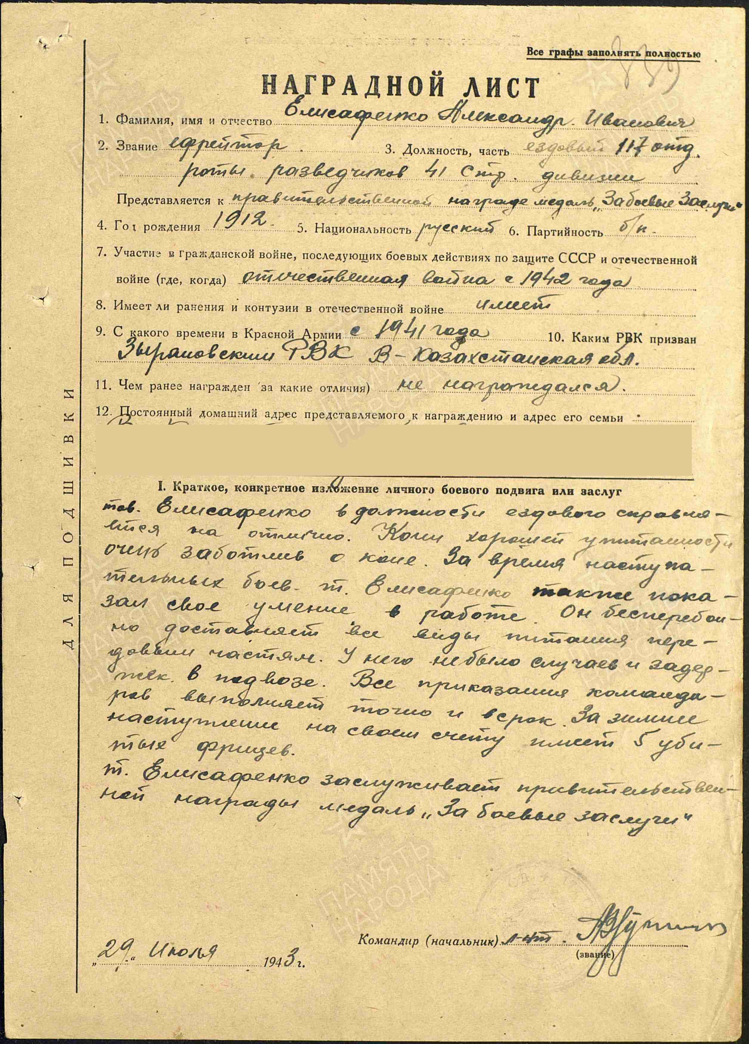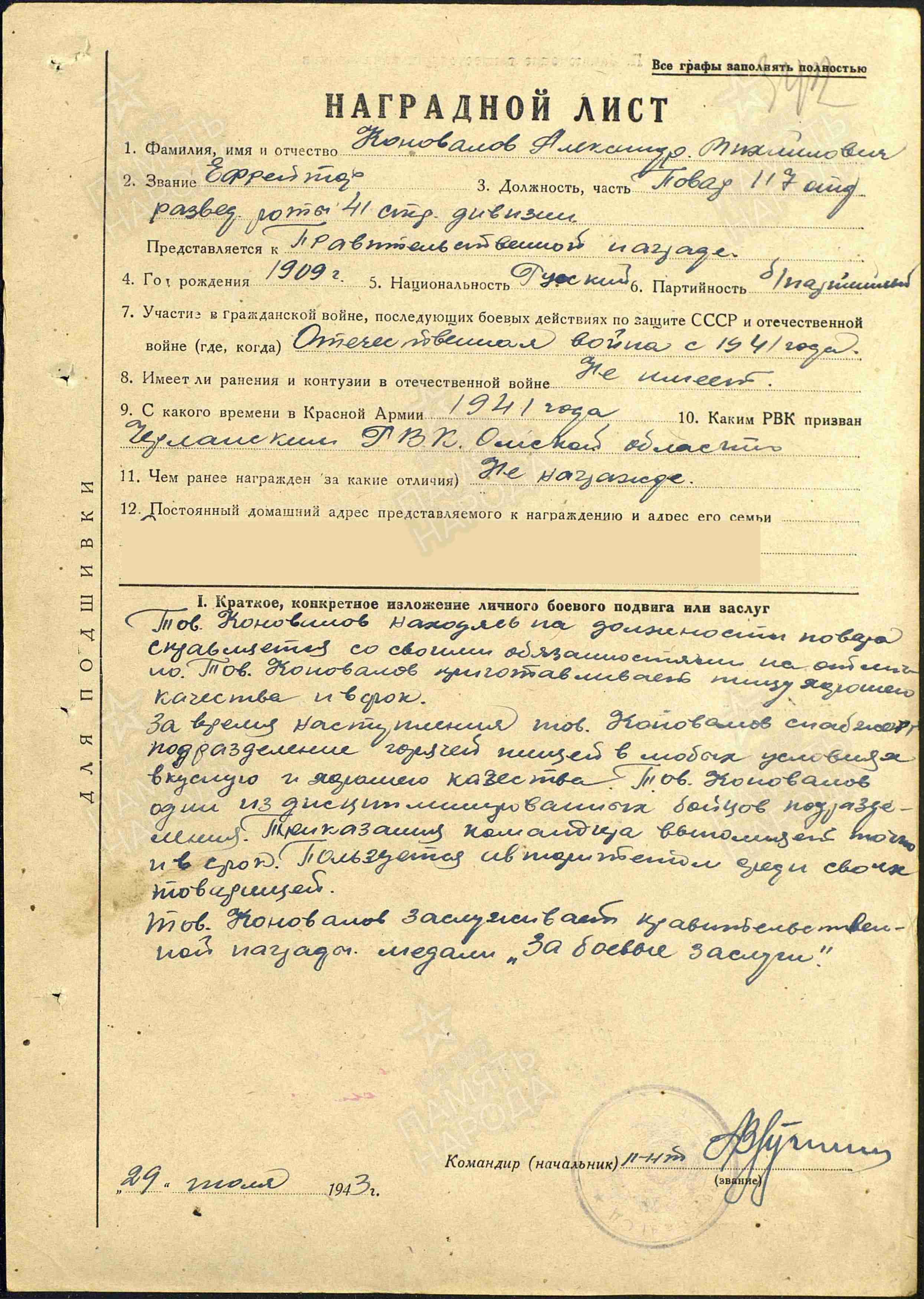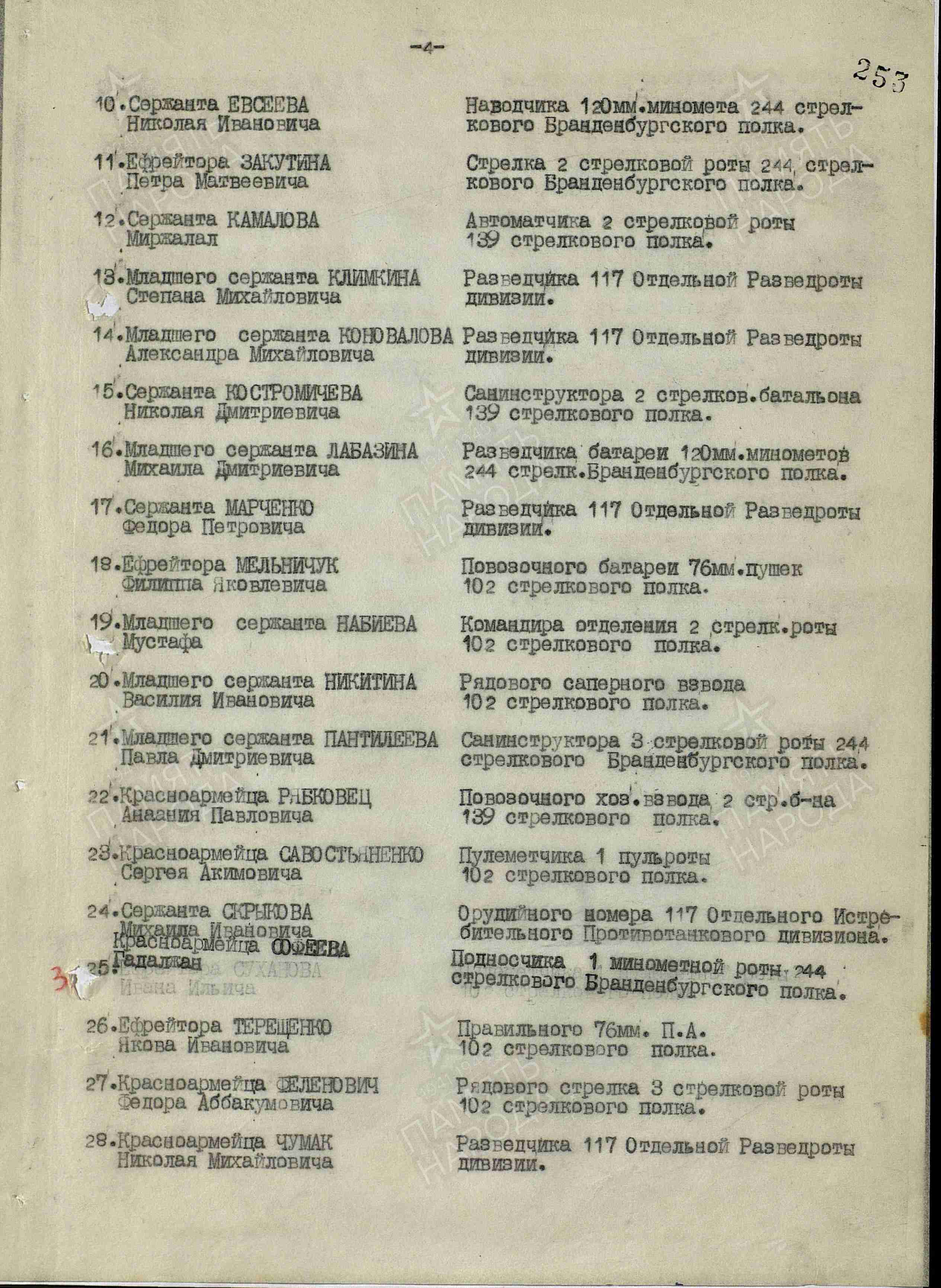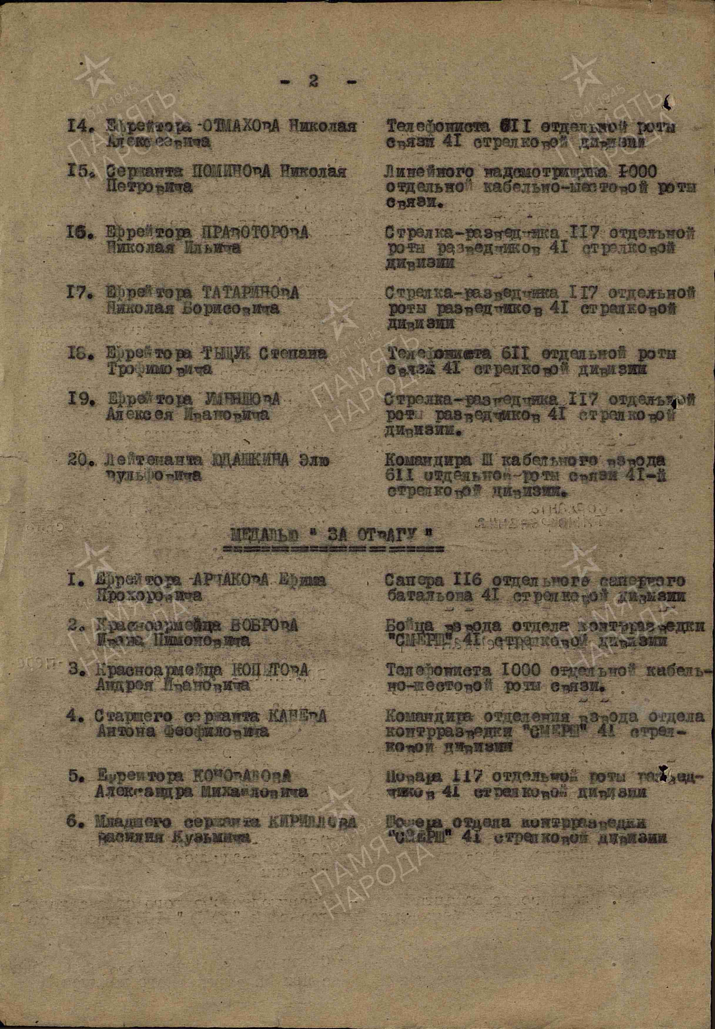 117 отдельная разведывательная рота 41 стрелковой дивизии (III) Награды: Медаль «За боевые заслуги» (2) Медаль «За отвагу» (2) Орден Славы III степени (2) Орден Отечественной войны II степени Медаль «За победу над Германией в Великой Отечественной войне 1941–1945 гг.» Медаль «За освобождение Варшавы» Медаль «За взятие Берлина» Орден Славы III степени