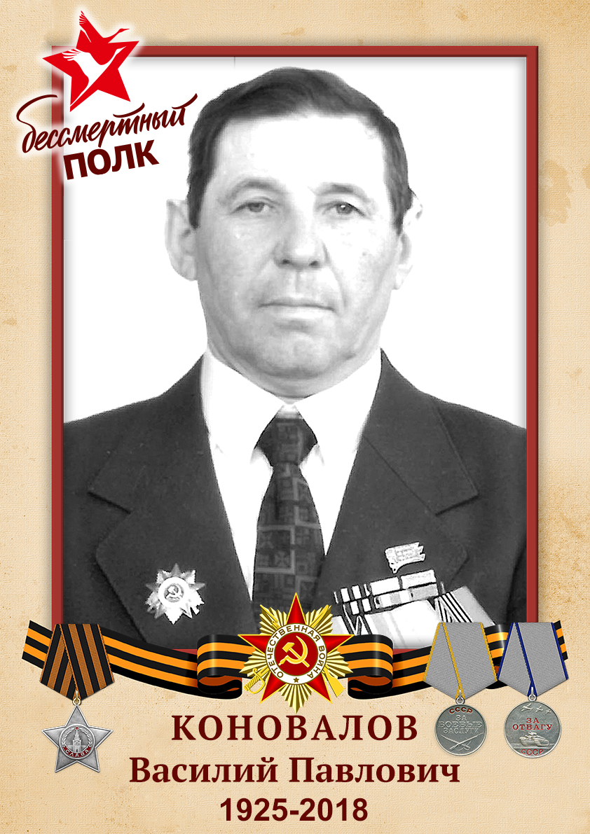 Коновалов Василий Павлович родился в 1925 году в с. Заречье Кинельского района, Куйбышевской области (сейчас Самарской области). На фронт попал в 10 февраля 1943 году, в 898 Стрелковый полк, 245 стрелковую дивизию, 3 Прибалтийского фронта. служил сержантом наводчиком 76 мм артиллерийской батареи. В боях за родину получил ранение 04.10.1943 г. на Брянском направлении? 12.101943 выбыл в часть/госпиталь. Первую медаль «За боевые заслуги» получил 02 июня 1944 г. за то, что исключительно быстро и правильно исправляет наводку, точно поражает цели, имеет на своем счету уничтоженные огневые точки и подбитые автомашины противника. Вторую медаль «За отвагу» получил 04 августа 1944 г. за то, что он, будучи разведчиком, зорко наблюдает за передним краем противника, в районе станции Куправа в Латвии, своевременно обнаружил и доложил на батарею о готовящейся контратаке противника, о подошедших самоходных орудиях, по которым немедленно был открыт огонь, после чего они скрылись. Третью награду «Орден славы III степени» получил в 24 октября 1944 г. за то, что в боях с немецкими захватчиками по освобождению Прибалтики сержант Коновалов неоднократно проявил образцы мужества, отваги и стойкости на поле боя. Находясь в боевых порядках пехоты он умело выявляет и засекает огневые точки противника, умело корректирует огонь своей батареи. В последнем бою им было выявлено 3 наблюдательных пункта противника, которые уничтожены огнем своей батареи. Кроме того, по его корректировке уничтожено 14 огневых точек. В бою за освобождение г. Риги Коновалов Василий автоматным огнем лично уничтожил 13 гитлеровцев.