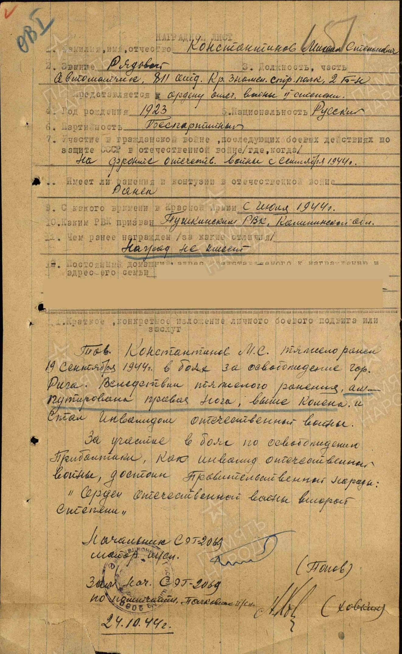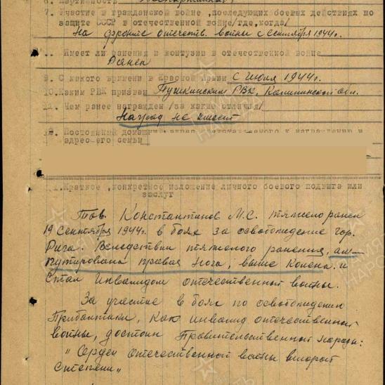 Воинская часть 3 Прибалтийский фронт; 229 стрелковая дивизия; 811 стрелковый полк; 225 армейский запасной стрелковый полк; Пушкинский РВК Дата призыва 25.07.1944 Воинское звание рядовой (стрелок, автоматчик) «... Тов. Константинов М.С. тяжело ранен 19 Сентября 1944 г. в боях за освобождение гор. Рига. В следствии тяжелого ранения ам- путирована правая нога, выше колена, и стал инвалидом отечественной войны. За участие в боях по освобождению Прибалтики, как инвалид отечественной войны, достоин Правительственной награды: «Орден отечественной войны первой степени» (Указом ПРЕЗИДИУМА ВЕРХОВНОГО СОВЕТА СССР от 14.03 1985 г.)