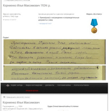 Отец родился в 1924 году в с. Казанка, Амурской области. Родители в 1914 году приехали по переселению. Воинскую службу проходил на Дальнем Востоке. Участвовал в боевых действиях в составе 354 отдельного батальона морской пехоты (ОБМП ОСБО ТОФ), командир майор Голубь.