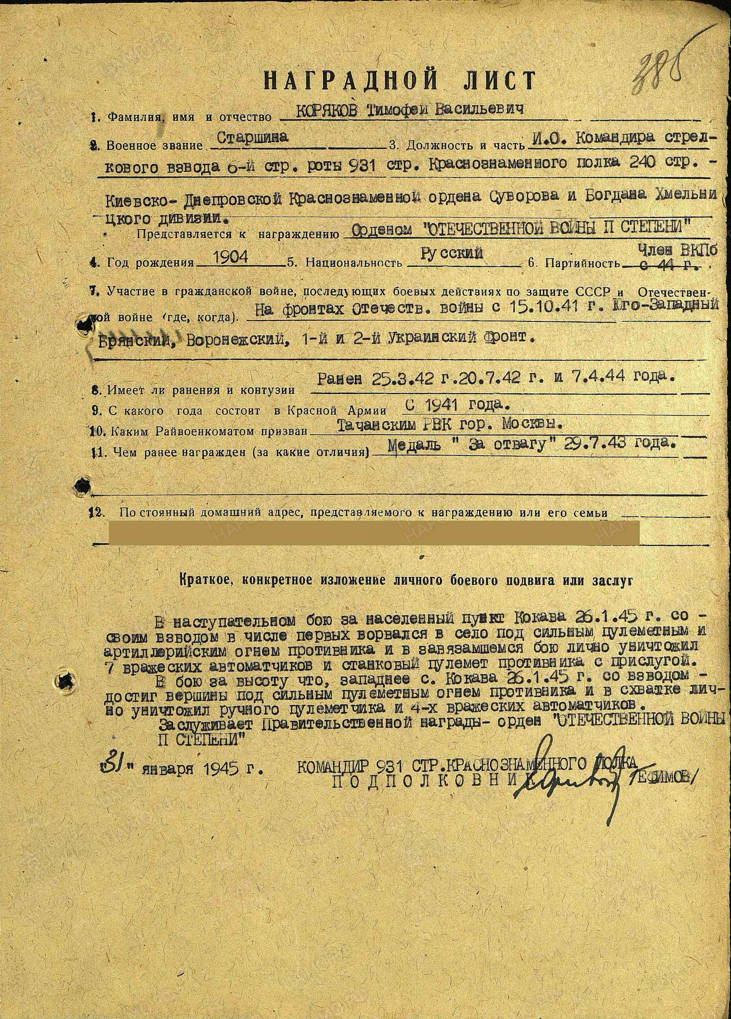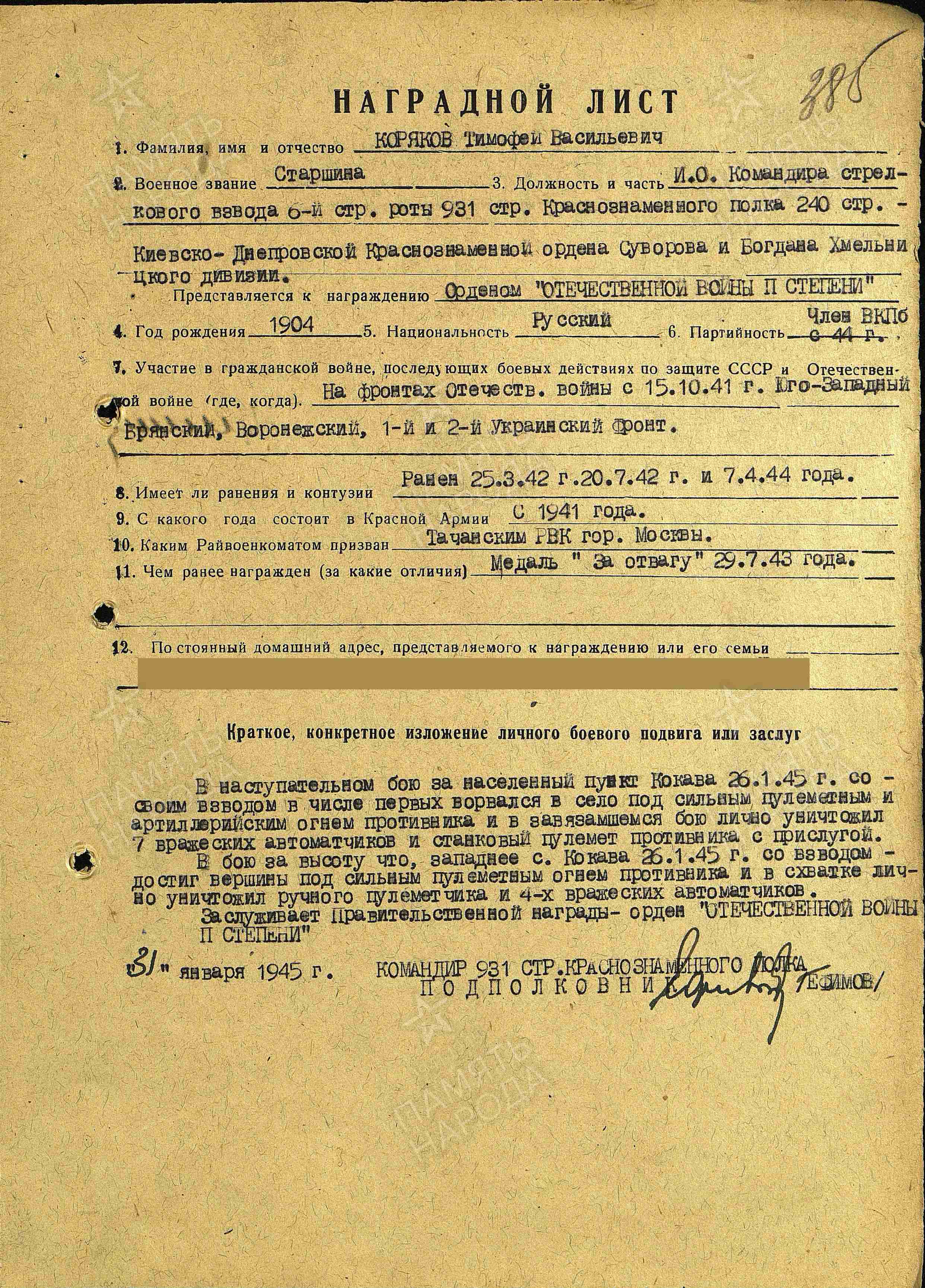 Коряков Тимофей Васильевич,участник Финской войны 1939 г.По окончании военных действий был демобилизован,работал на 1-Шарикоподшипниковском заводе-штамповщик. Член партии ВКПБ.Ушел добровольцем на фронт в октябре 1941 из Москвы,Таганский военкомат. г.Боевой путь с 1941 г по февраль 1945 г,в составе 1 и 2 Украинского фронта,род войск- Пехота-931 стрелковый полк 240 стрелковой дивизии ,161 гвардейский стрелковый полк 53 гвардейской стрелковой дивизии .Несколько раз был ранен в 1942,1944,1945 г.Тяжелое ранение в боях за освобождение Чехословакии- село Кокава,в феврале 1945 г,после чего отправлен в госпитале до ноября 1945. После излечения вернулся на 1-Шарикоподшипниковский завод ,работал в парткоме завода ,до сентября 1957 г.Имеет награды -"Медаль за Отвагу" и "Орден Отечественной войны 2 степени".