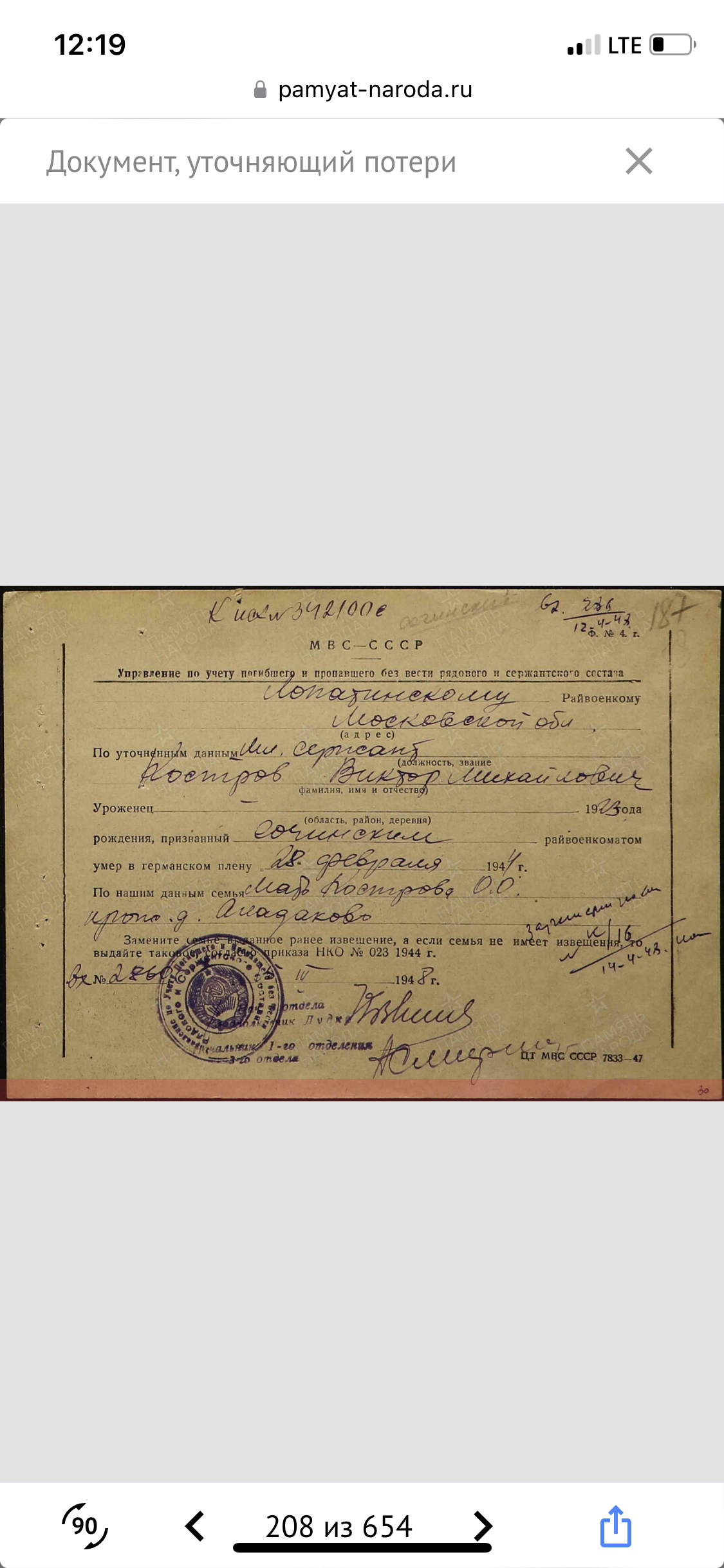 Совсем юным ушел на фронт. В пекле Вяземского котла был пленен. Отправлен в один из самых тяжелых для пребывания шталаг в Витмаршене. Освобождения не дождался. Погиб в плену от болезни и истощения . Родители до самой смерти так и не узнали судьбу своего сына. Считался без вести пропавшим. Только сейчас наша семья узнала о его судьбе.