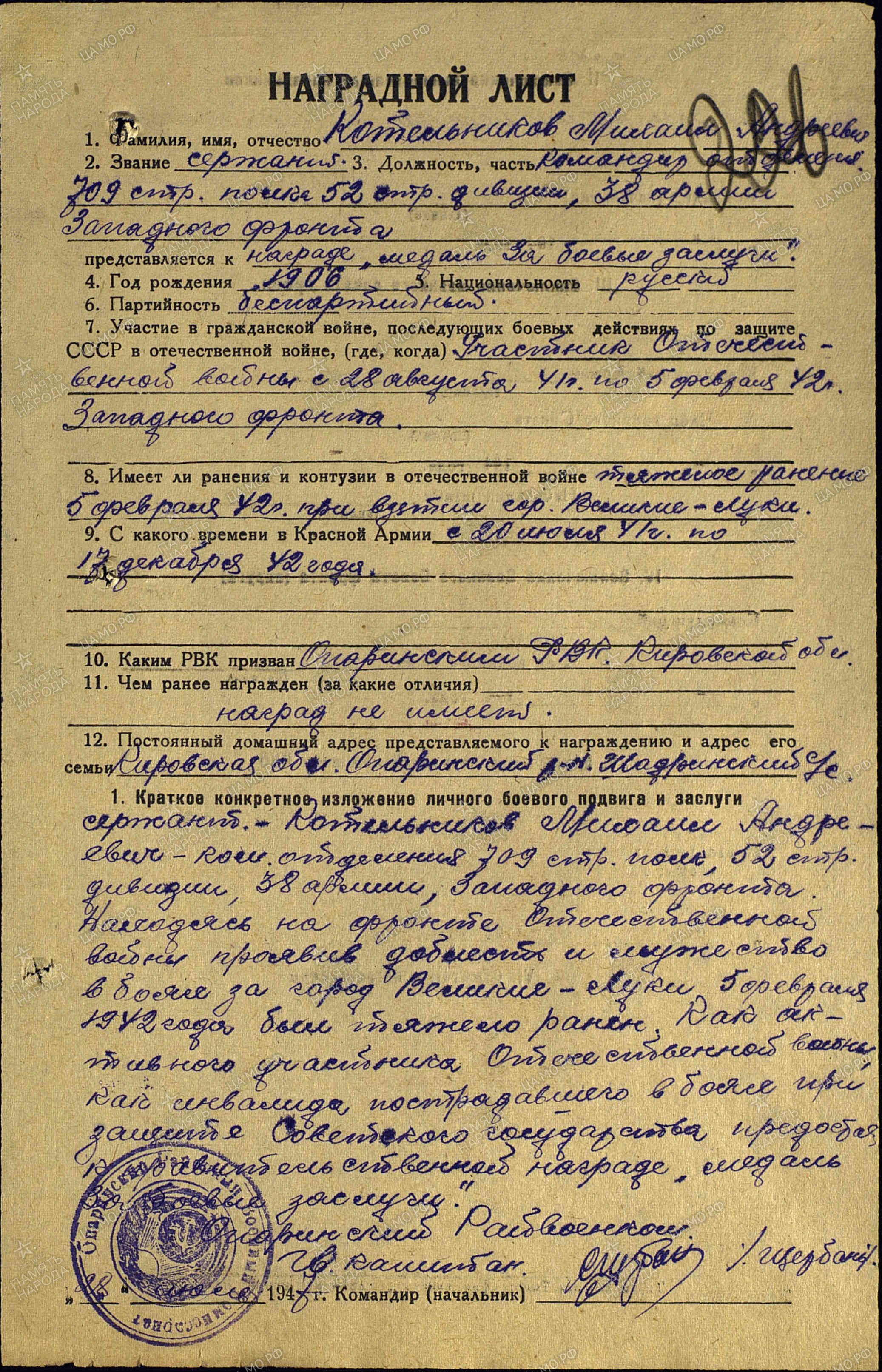 Котельников Михаил Андреевич был призван Опаринским РВК в 1941 году. Воевал в составе Западного фронта. Был тяжело ранен. После войны жил в д.Стрельская.