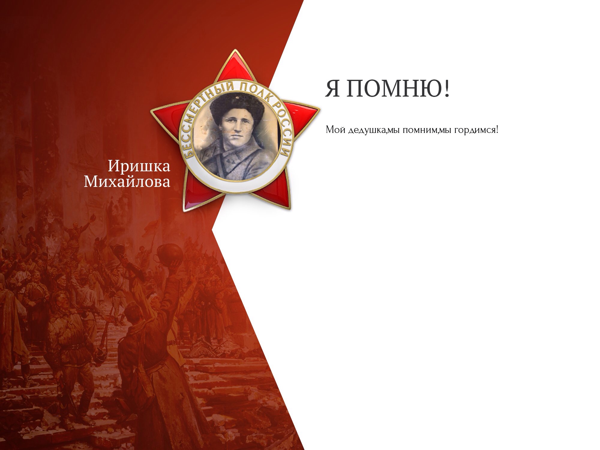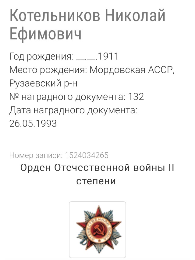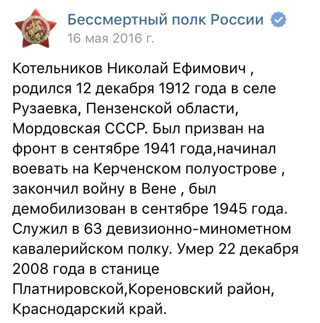 Котельников Николай Ефимович , родился 12 декабря 1911 года в селе Рузаевка, Пензенской области, Мордовская СССР. Был призван на фронт в сентябре 1941 года,начинал воевать на Керченском полуострове , закончил войну в Вене , был демобилизован в сентябре 1945 года. Служил в 63 девизионно-минометном кавалерийском полку. Умер 22 декабря 2008 года в станице Платнировской,Кореновский район, Краснодарский край.