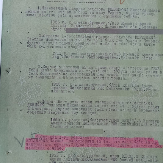 Комсорг батальона 157 гвардейского стрелкового Рижского полка Котляров Матвей Григорьевич 12.01.1945 года был награжден Орденом «Красная звезда».