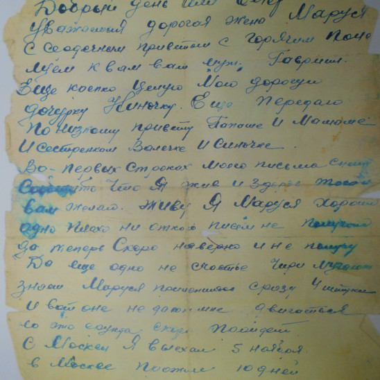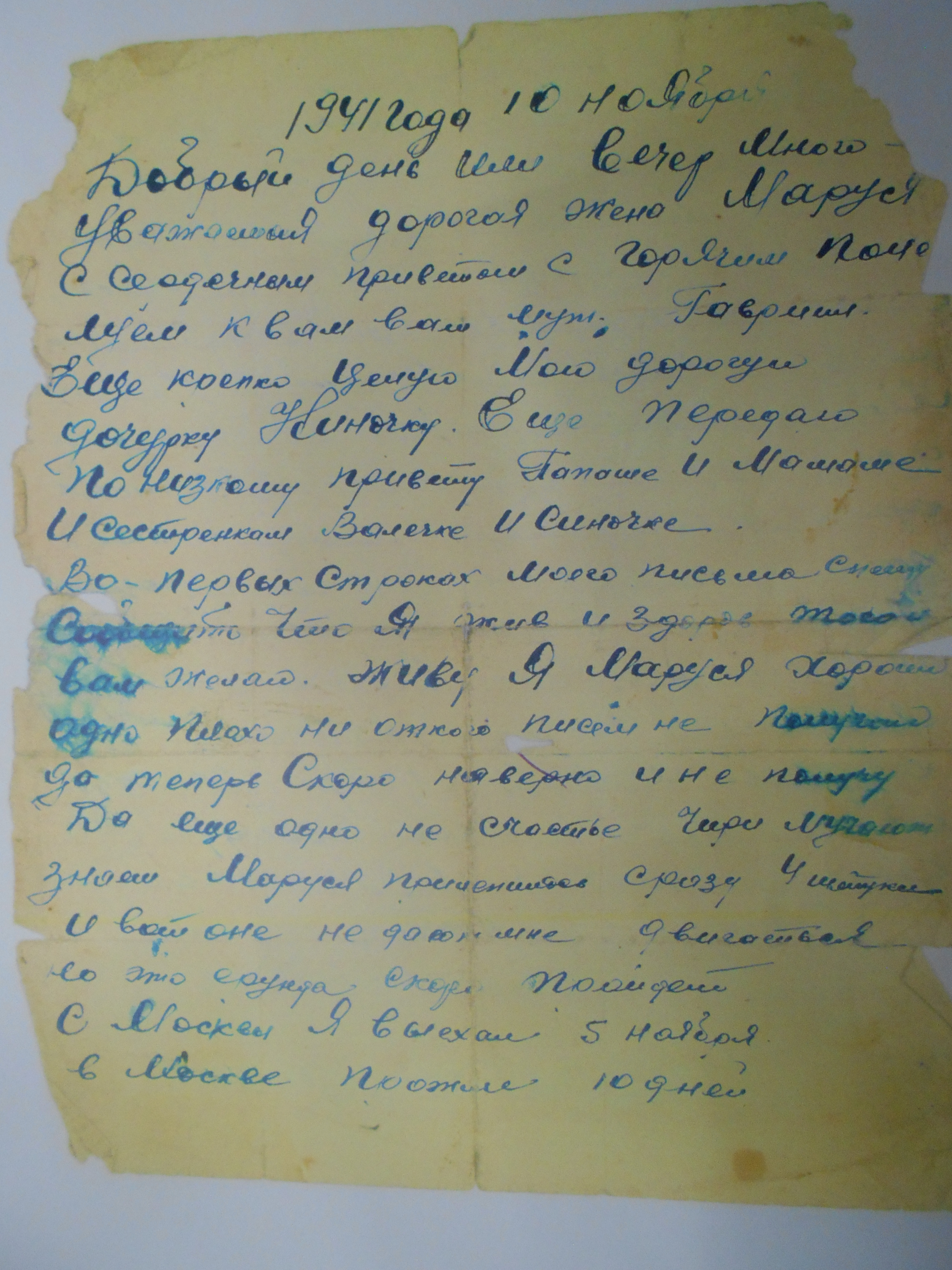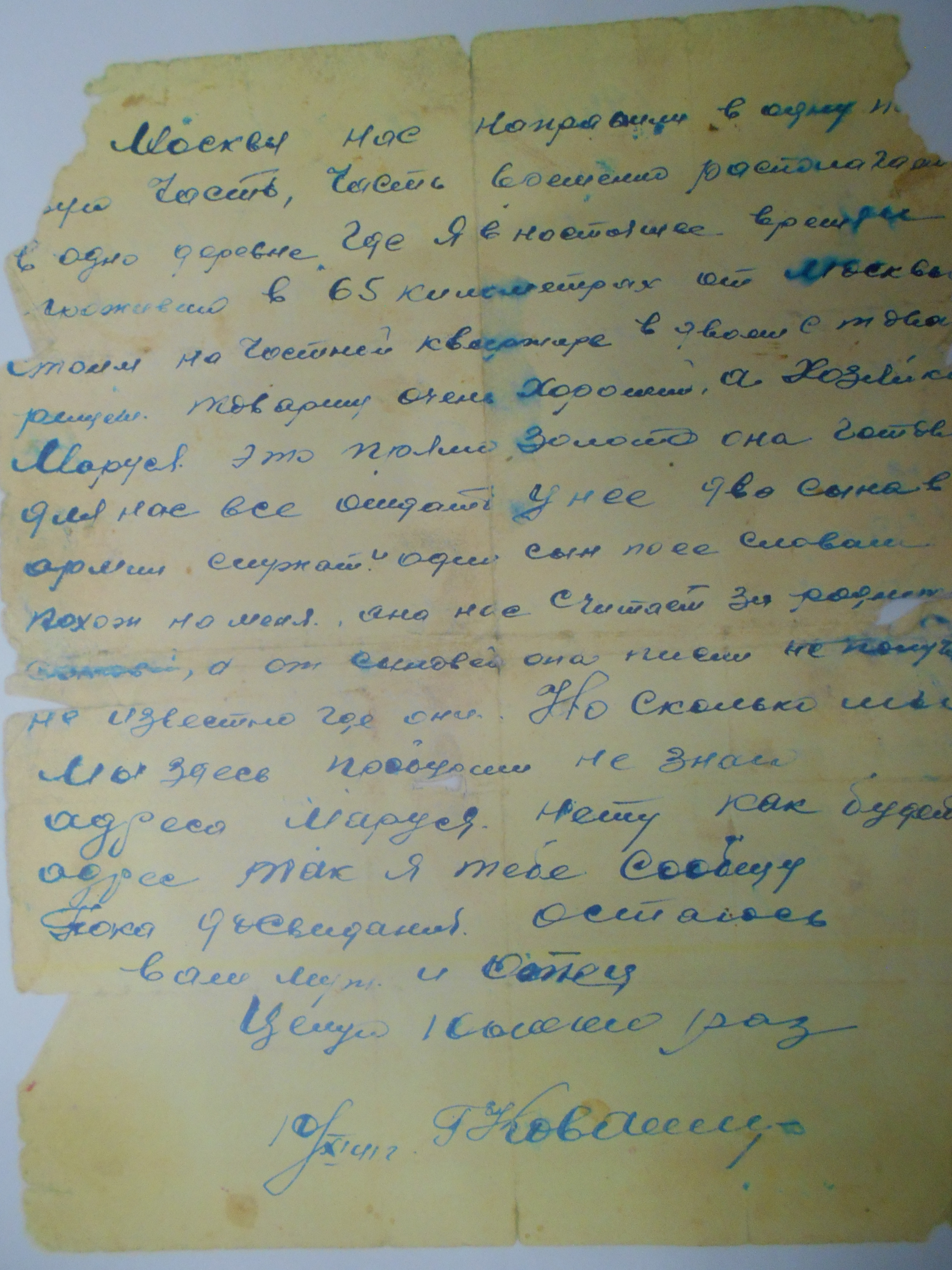 Мой отец Коваленко Гавриил Кузьмич ехал навестить родителей в Апшеронске в июне 1941 г. 22 июня была объявлена война, он сошел с поезда в Москве и отправился на призывной пункт. Вот письмо маме, последнее. После войны мама делала множество попыток его разыскать (и я тоже), но все что удалось узнать - это то что он был в госпитале под Ржевом, куда попала бомба. Пропали без вести и его племянник - рядовой Иван Иванович Толочка, и мой дядя по матери Алексей Константинович Сидоров - который отправился добровольцем на фронт в Сталинград и пропал без вести, а вернее погиб (г.р. 1920)