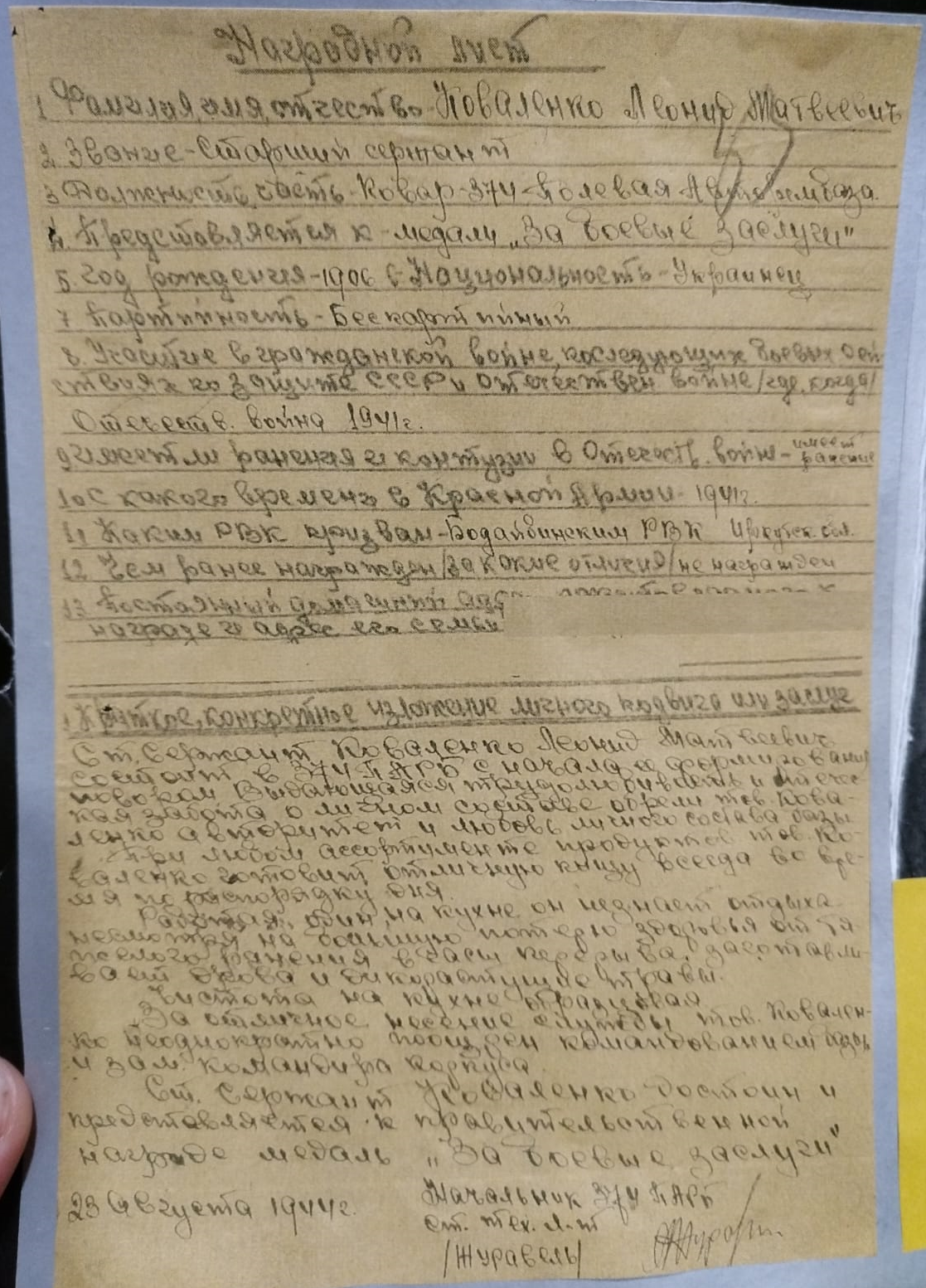 Призван Бодайбинским РВК Иркутской области в 1941г. ... Получил тяжелое ранение. Состоял в 374 АРБ поваром с начала формирования. Выдающееся трудолюбие и забота о личном составе снискало авторитет личного состава. При любом ассортименте продуктов готовил отличную пищу строго по распорядку. Работал один на кухне не зная отдыха несмотря на большую потерю здоровья от тяжелого ранения. В часы перерыва заготавливал дрова и дикорастущие травы. Поддерживал образцовую чистоту на кухне. За время службы неоднократно поощрялся командованием.