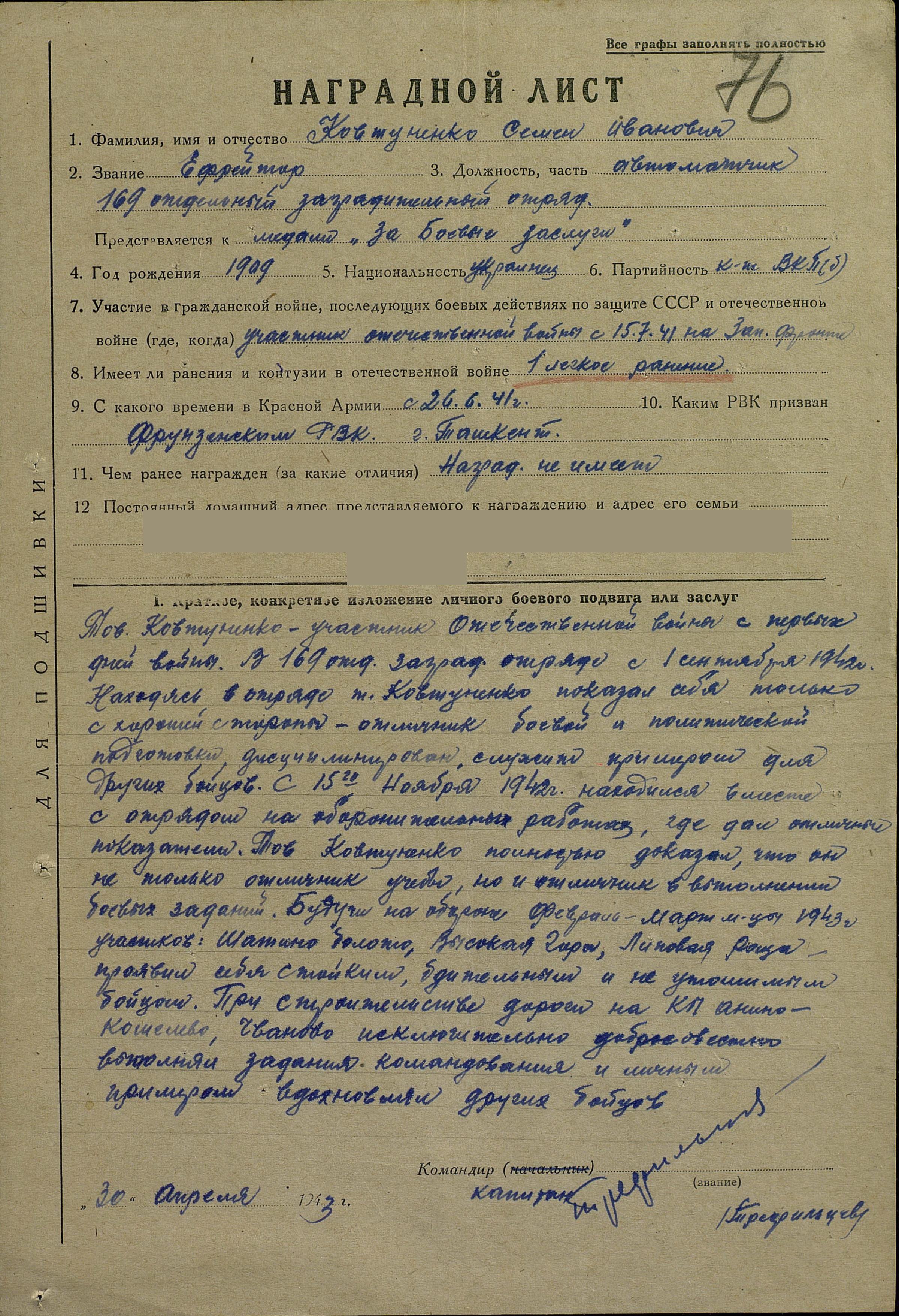Мой прадед, Ковтуненко Семён Иванович, был призван в 1941 году из Ташкента, куда уехал с семьёй в конце 1930-х гг. На момент гибели служил автоматчиком в 169 отдельном заградительном отряде в звании ефрейтора. Имел одно лёгкое ранение (где и когда получил нам неизвестно). Незадолго до гибели был награждён медалью "За боевые заслуги" (но получить медаль не успел). Долгое время мы не знали, где похоронен Семён Иванович (останки были перезахоронены в 1950-х гг.), однако благодаря помощи поисковых отрядов удалось точно установить место - это братская могила у с.Буда Калужской области (его имени на табличках нет, но мне объяснили, что на табличках только имена местных жителей, похороненных в этой могиле).