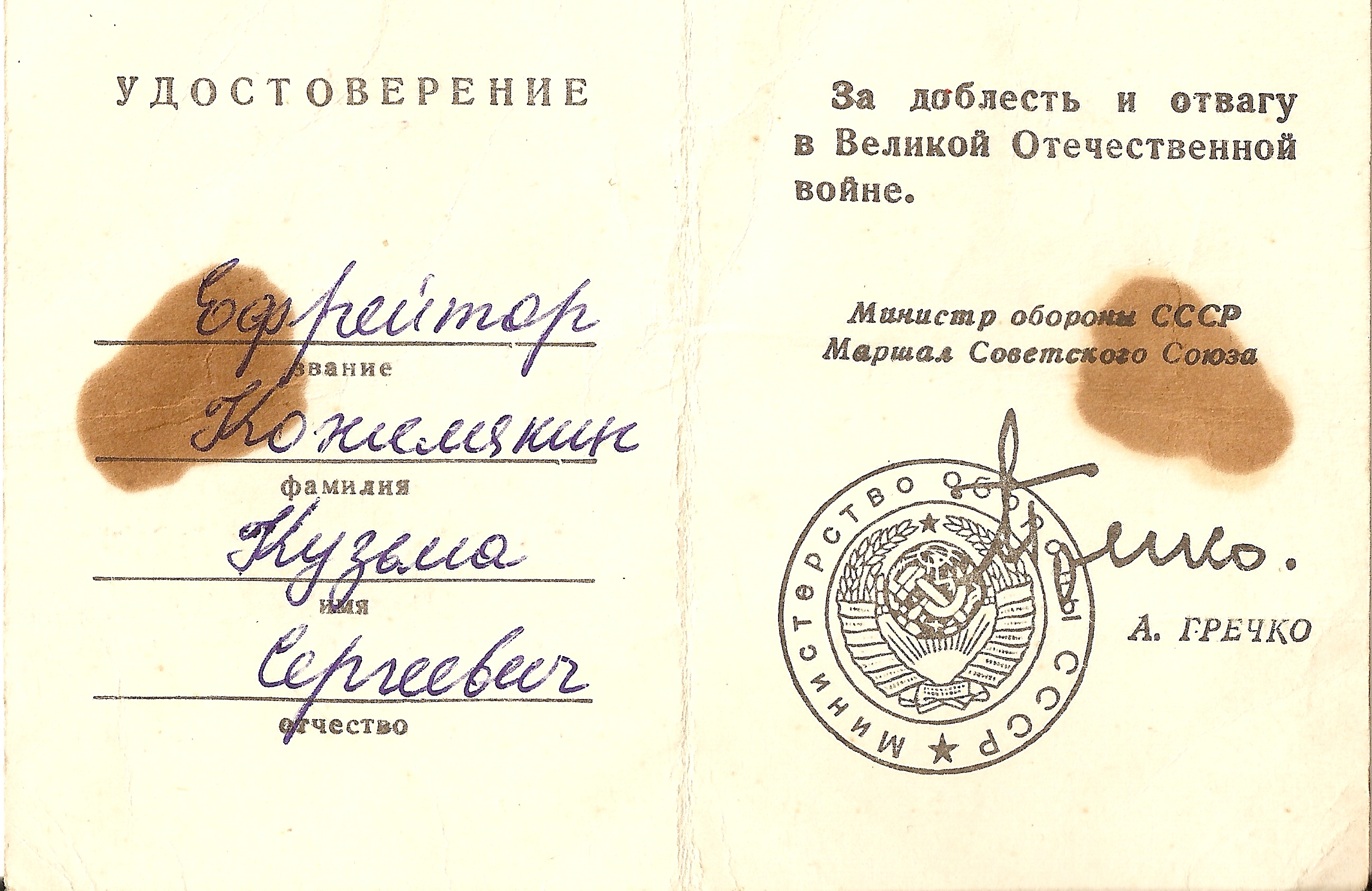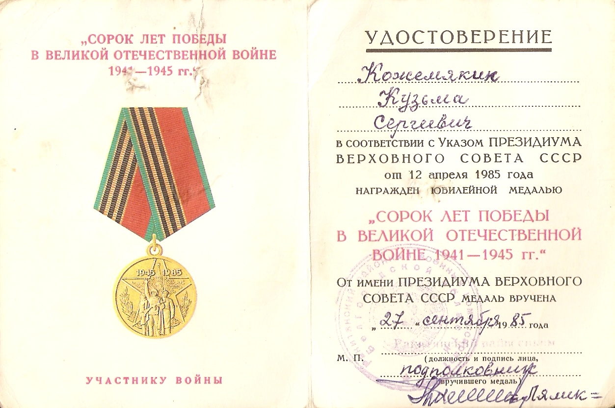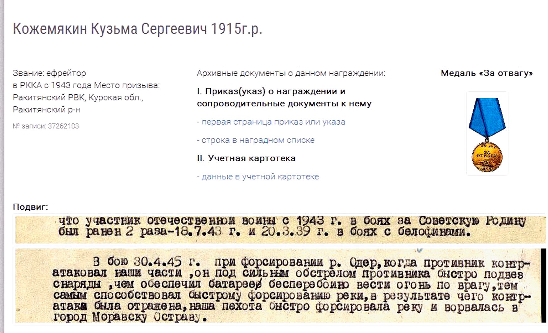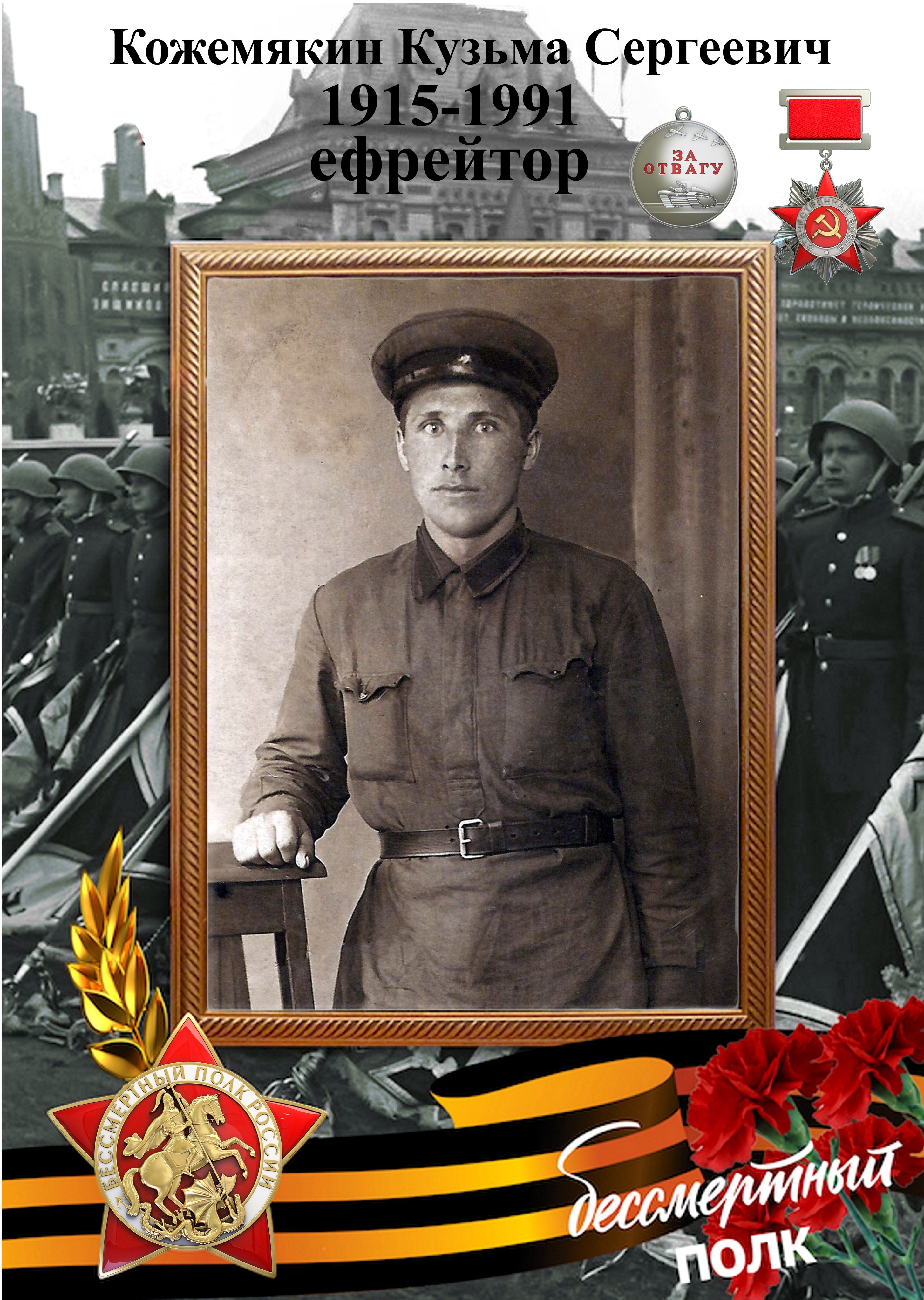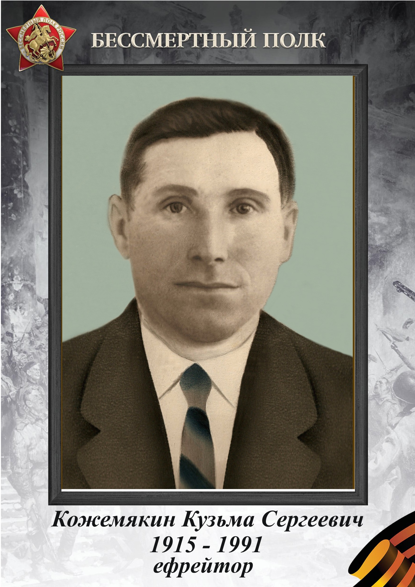 Кожемякин Кузьма Сергеевич родился в 1915 году в селе Зинаидино, Ракитянского района Курской области. Он был честным и трудолюбивым человеком. Всю жизнь Кузьма Сергеевич прожил в селе Зинаидино, работал в колхозе им. Ленина.Папа говорил, что дед не любил вспоминать о войне. В начале войны Кожемякин Кузьма Сергеевич служил истребителем танков, стрелял из противотанкового ружья (ПТР), а затем его перевели в артиллерию. Кожемякин Кузьма Сергеевич участник Великой Отечественной войны с 1943 г. в боях за Советскую Родину был ранен 2 раза – 18.7.43 г. и 20.3.39 г. в боях с белофинами.Вот событие, за которое мой прадед получил медаль «За отвагу». В бою 30.4.1945г. при форсировании р. Одер, когда противник контратаковал наши части, Кузьма Сергеевич под сильным обстрелом противника быстро подвез снаряды, чем обеспечил батарее бесперебойно вести огонь по врагу, тем самым способствовал быстрому форсированию реки, в результате чего контратака была отражена, наша пехота быстро форсировала реку и ворвалась в город Моравску Остраву. Также Кожемякин Кузьма Сергеевич награжден Орденом Отечественной войны II степени.Умер мой прадед 4 июля 1991 года, память о нём навсегда останется в наших сердцах.