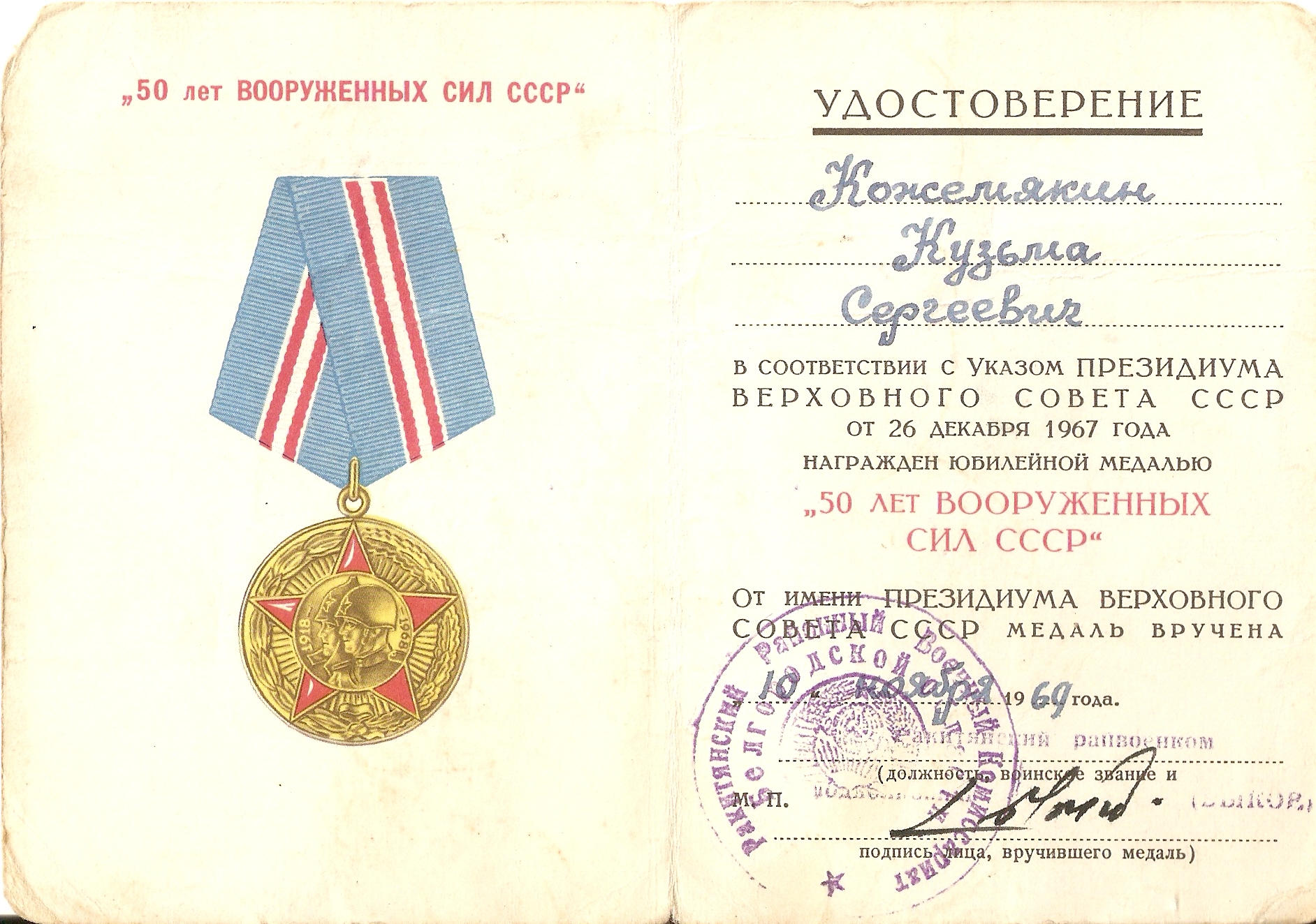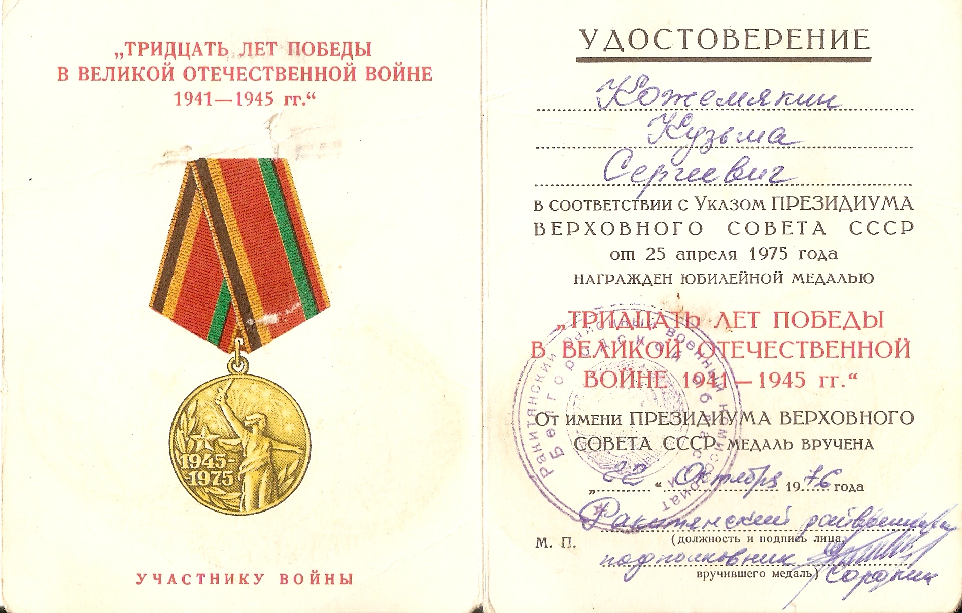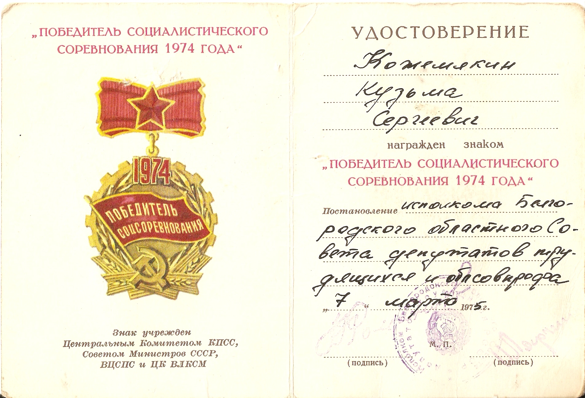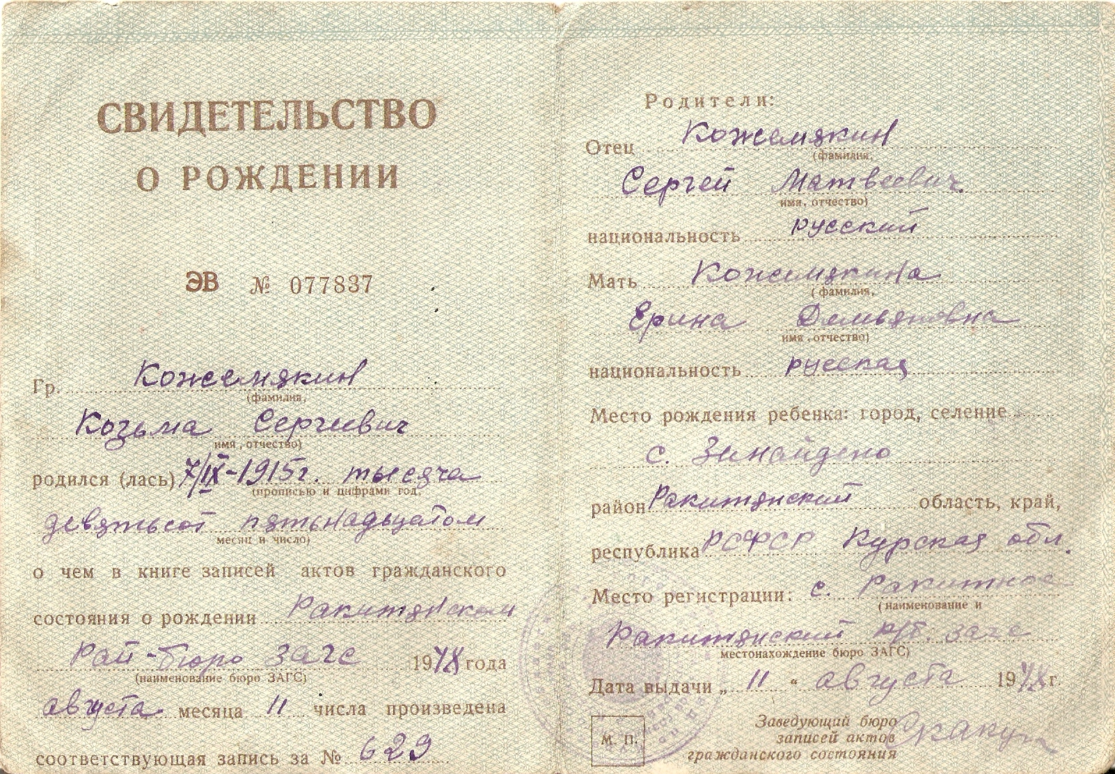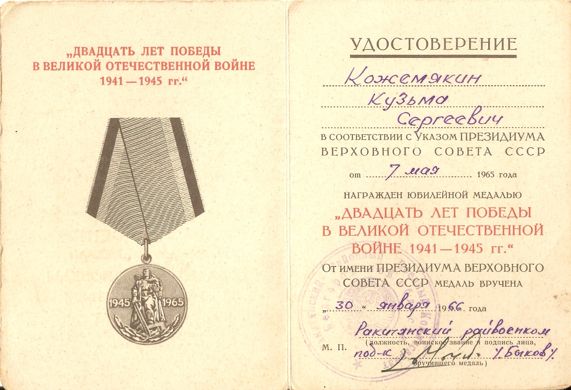 Кожемякин Кузьма Сергеевич родился в 1915 году в селе Зинаидино, Ракитянского района Курской области. Он был честным и трудолюбивым человеком. Всю жизнь Кузьма Сергеевич прожил в селе Зинаидино, работал в колхозе им. Ленина.Папа говорил, что дед не любил вспоминать о войне. В начале войны Кожемякин Кузьма Сергеевич служил истребителем танков, стрелял из противотанкового ружья (ПТР), а затем его перевели в артиллерию. Кожемякин Кузьма Сергеевич участник Великой Отечественной войны с 1943 г. в боях за Советскую Родину был ранен 2 раза – 18.7.43 г. и 20.3.39 г. в боях с белофинами.Вот событие, за которое мой прадед получил медаль «За отвагу». В бою 30.4.1945г. при форсировании р. Одер, когда противник контратаковал наши части, Кузьма Сергеевич под сильным обстрелом противника быстро подвез снаряды, чем обеспечил батарее бесперебойно вести огонь по врагу, тем самым способствовал быстрому форсированию реки, в результате чего контратака была отражена, наша пехота быстро форсировала реку и ворвалась в город Моравску Остраву. Также Кожемякин Кузьма Сергеевич награжден Орденом Отечественной войны II степени.Умер мой прадед 4 июля 1991 года, память о нём навсегда останется в наших сердцах.