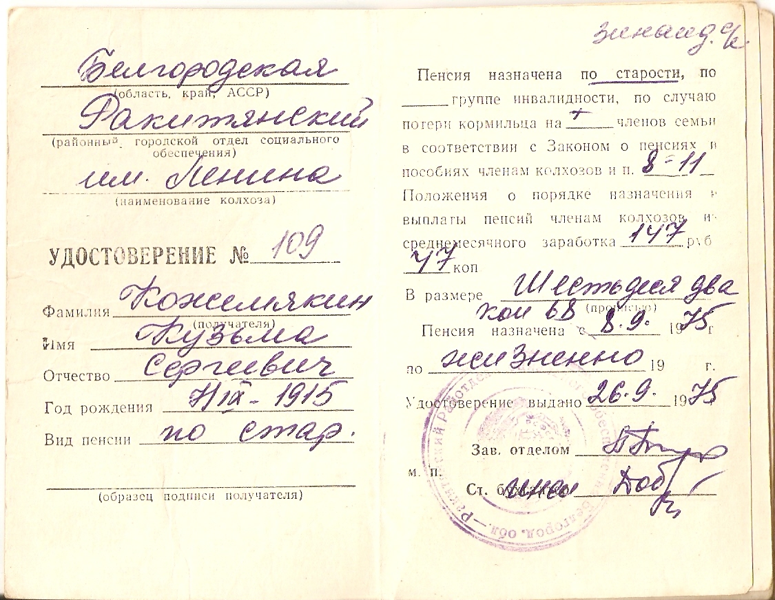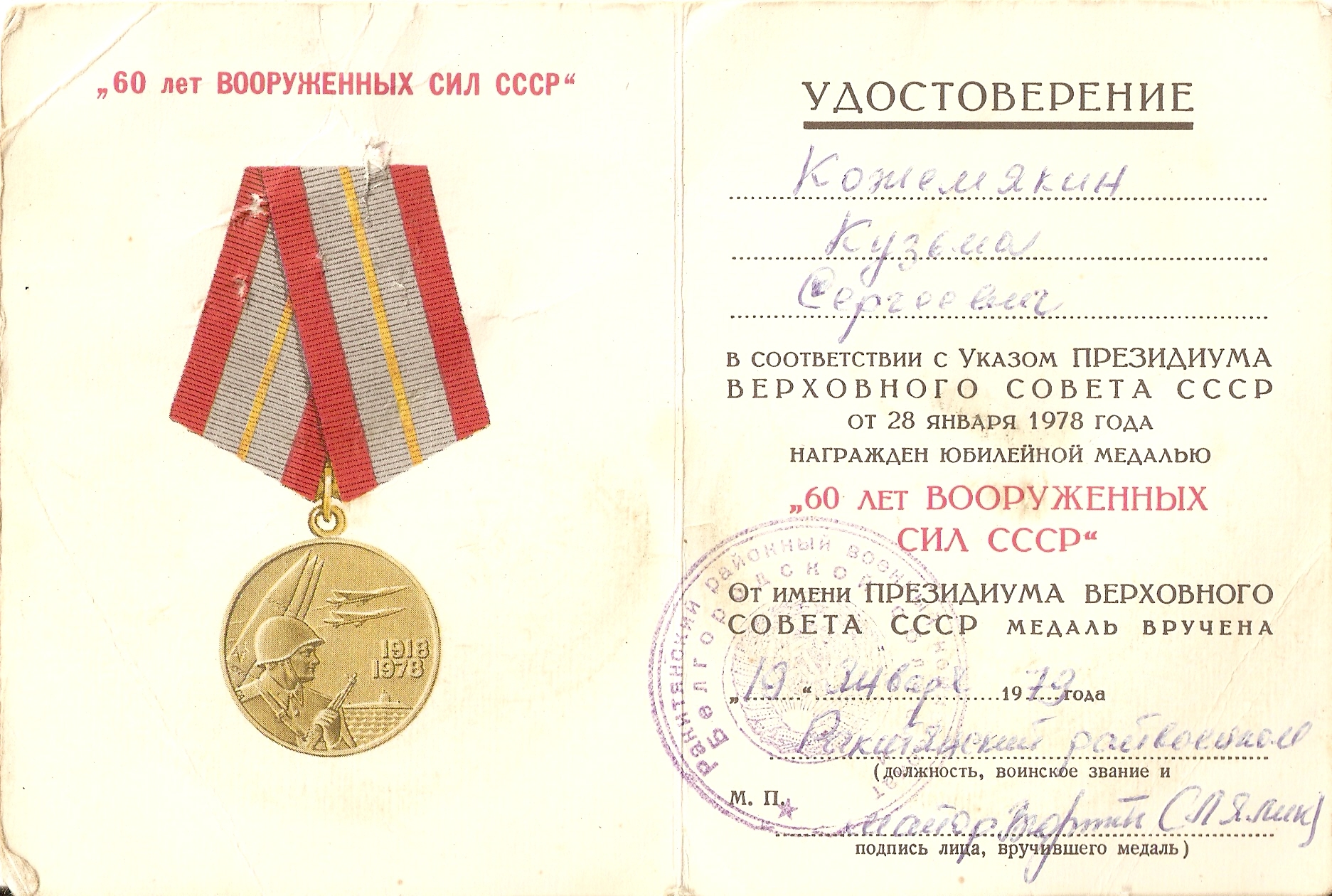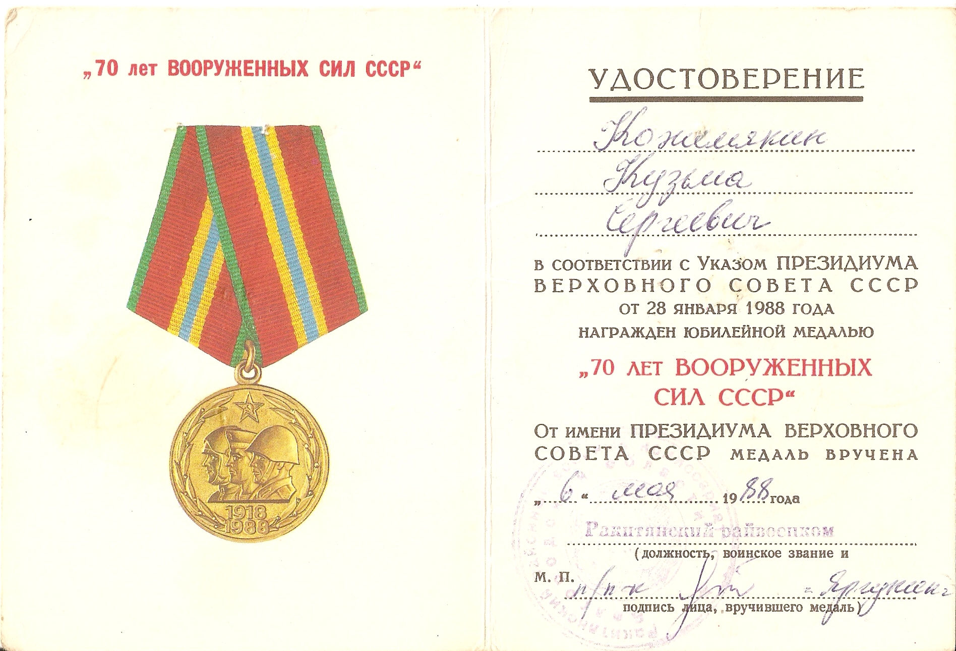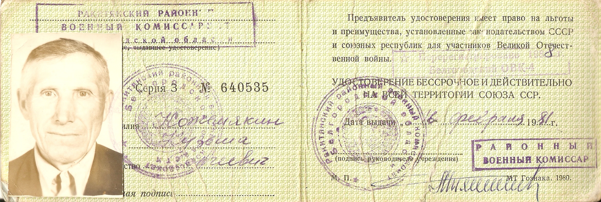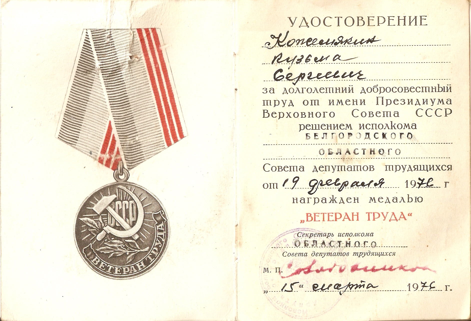 Кожемякин Кузьма Сергеевич родился в 1915 году в селе Зинаидино, Ракитянского района Курской области. Он был честным и трудолюбивым человеком. Всю жизнь Кузьма Сергеевич прожил в селе Зинаидино, работал в колхозе им. Ленина.Папа говорил, что дед не любил вспоминать о войне. В начале войны Кожемякин Кузьма Сергеевич служил истребителем танков, стрелял из противотанкового ружья (ПТР), а затем его перевели в артиллерию. Кожемякин Кузьма Сергеевич участник Великой Отечественной войны с 1943 г. в боях за Советскую Родину был ранен 2 раза – 18.7.43 г. и 20.3.39 г. в боях с белофинами.Вот событие, за которое мой прадед получил медаль «За отвагу». В бою 30.4.1945г. при форсировании р. Одер, когда противник контратаковал наши части, Кузьма Сергеевич под сильным обстрелом противника быстро подвез снаряды, чем обеспечил батарее бесперебойно вести огонь по врагу, тем самым способствовал быстрому форсированию реки, в результате чего контратака была отражена, наша пехота быстро форсировала реку и ворвалась в город Моравску Остраву. Также Кожемякин Кузьма Сергеевич награжден Орденом Отечественной войны II степени.Умер мой прадед 4 июля 1991 года, память о нём навсегда останется в наших сердцах.