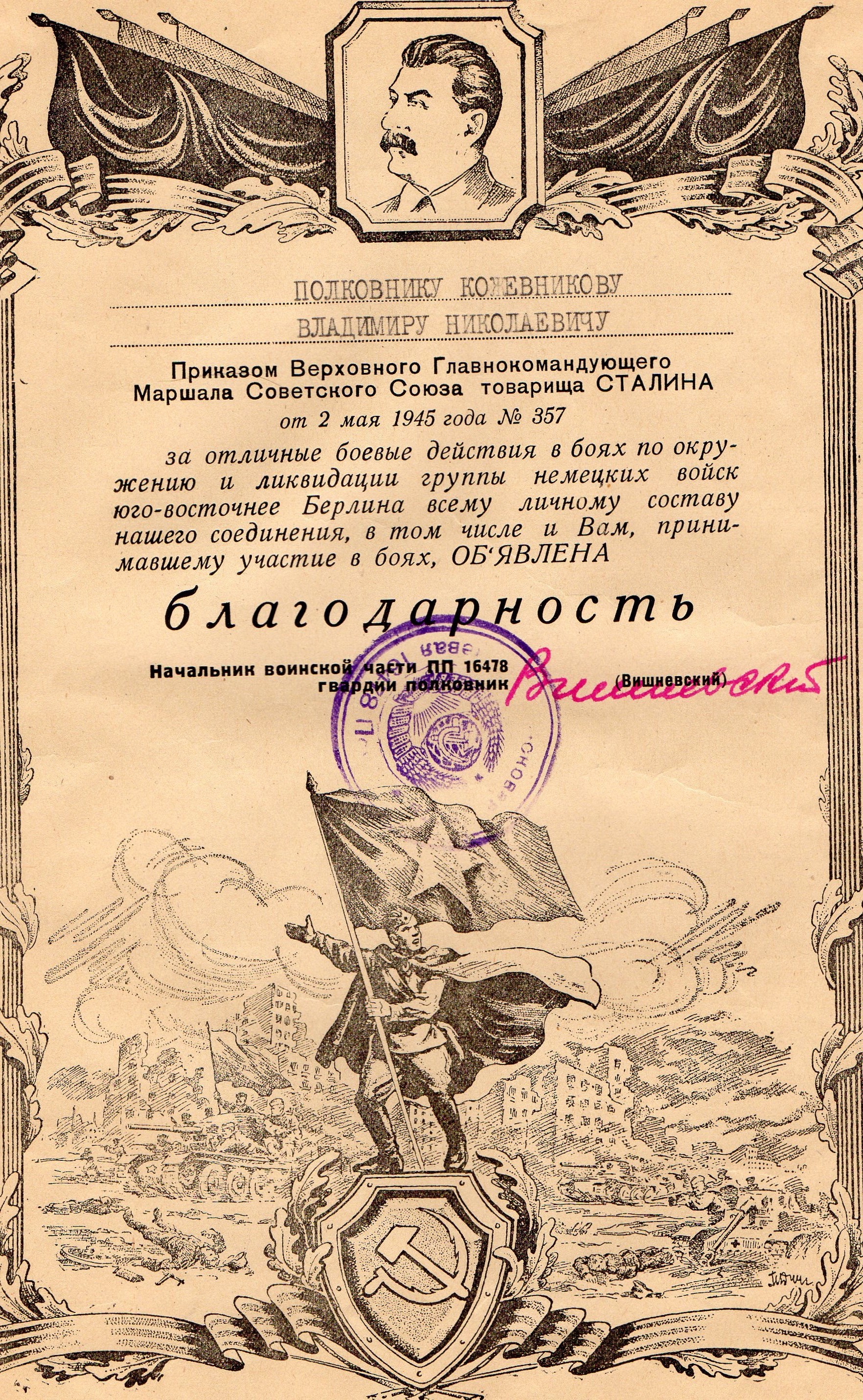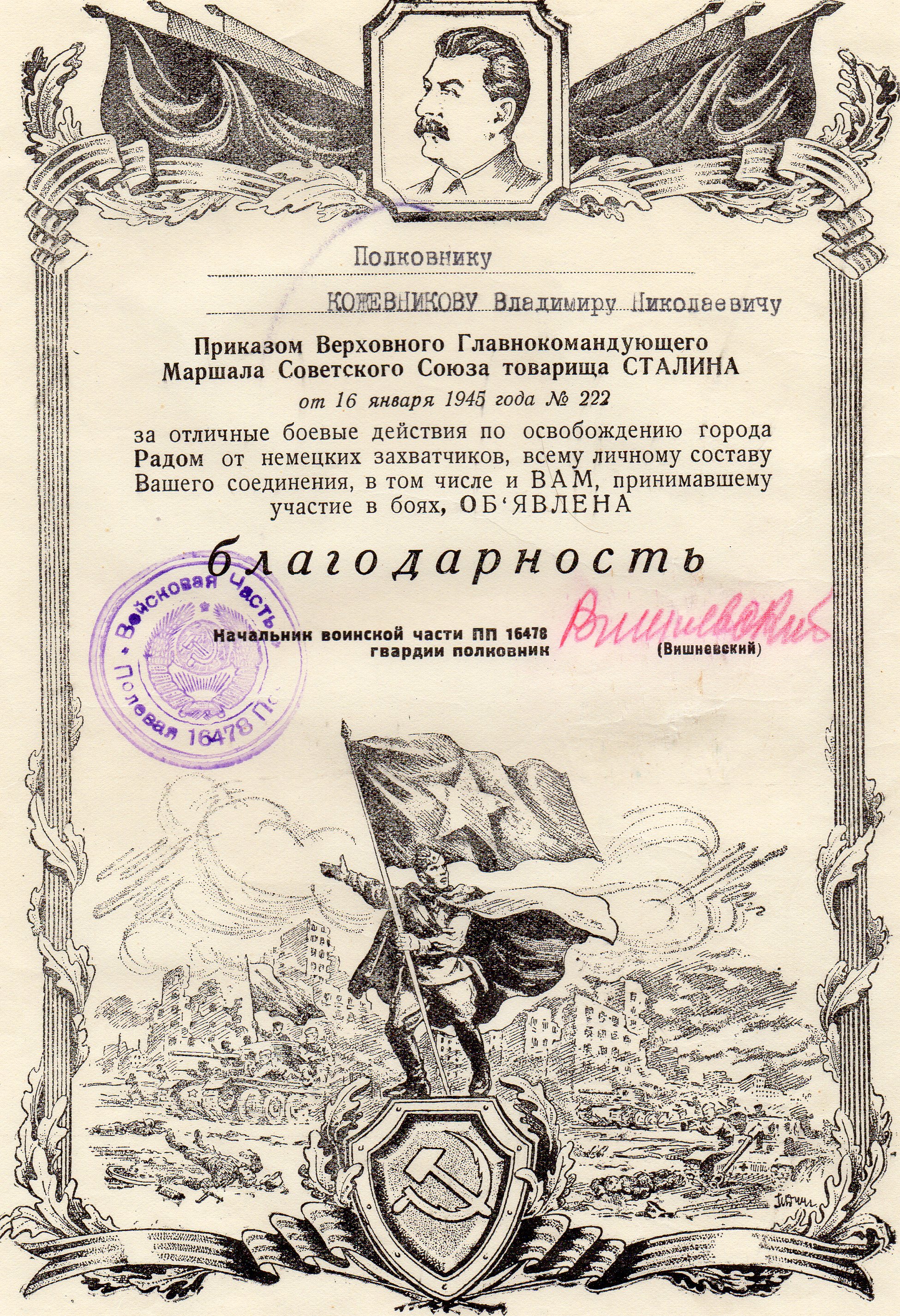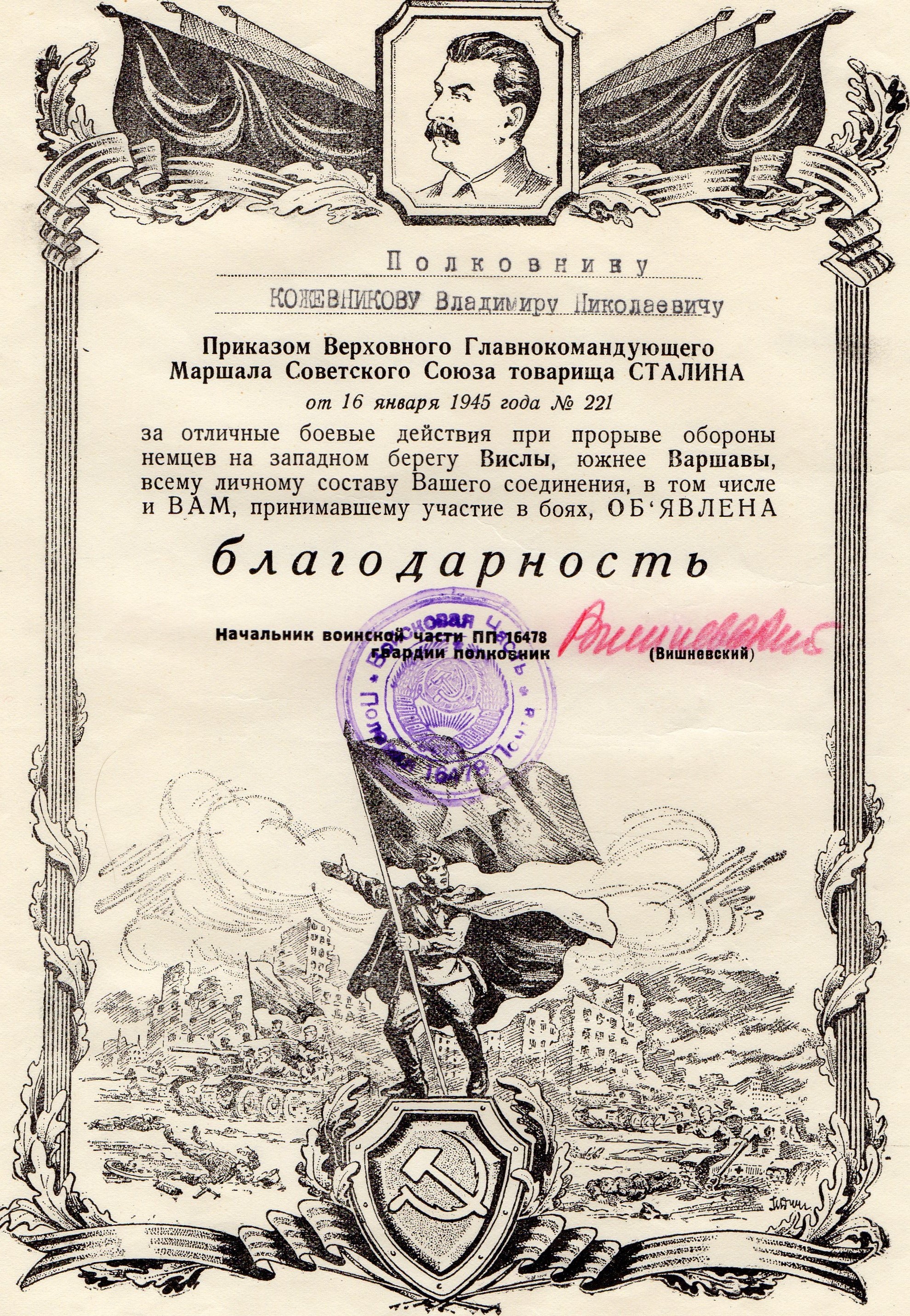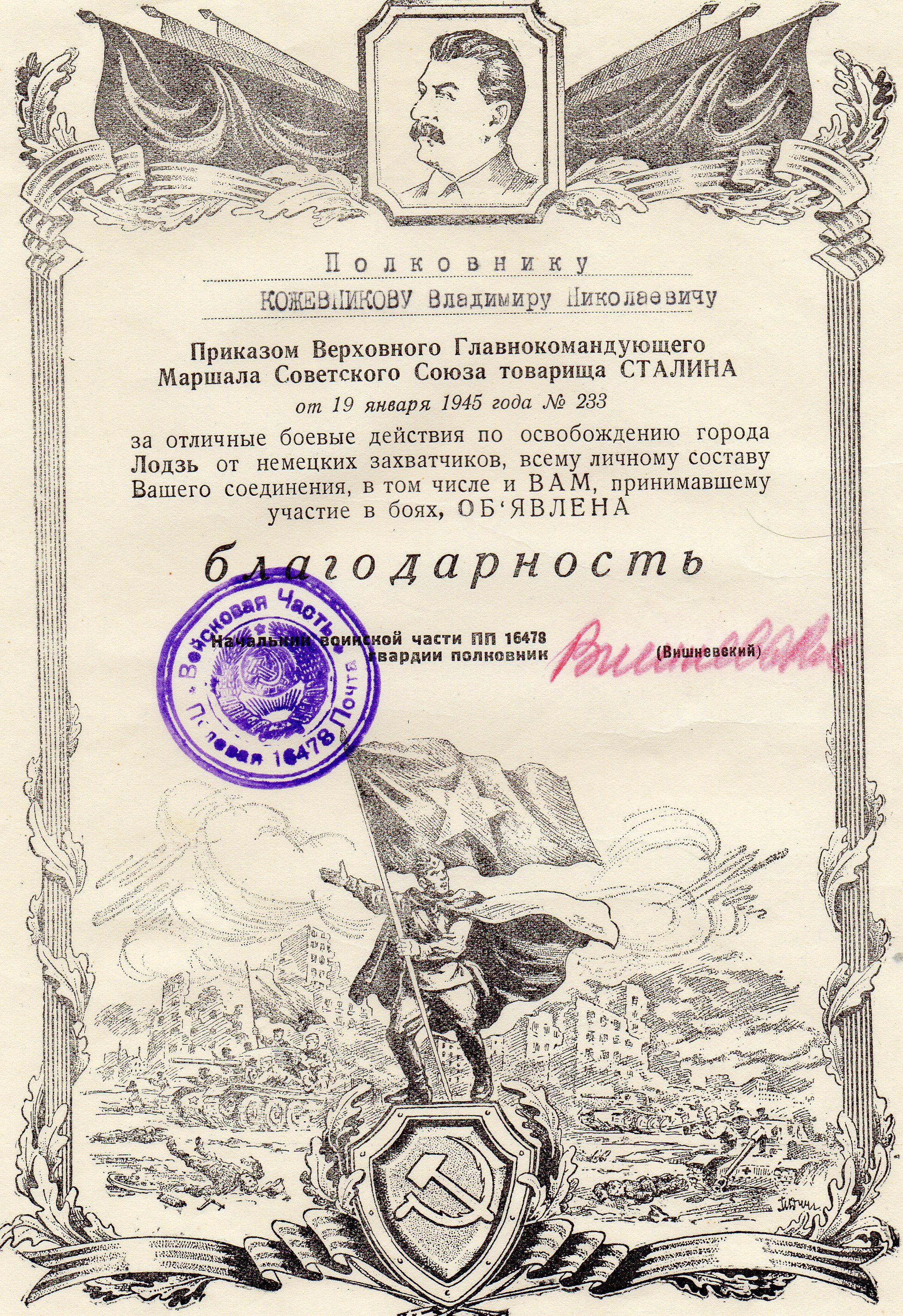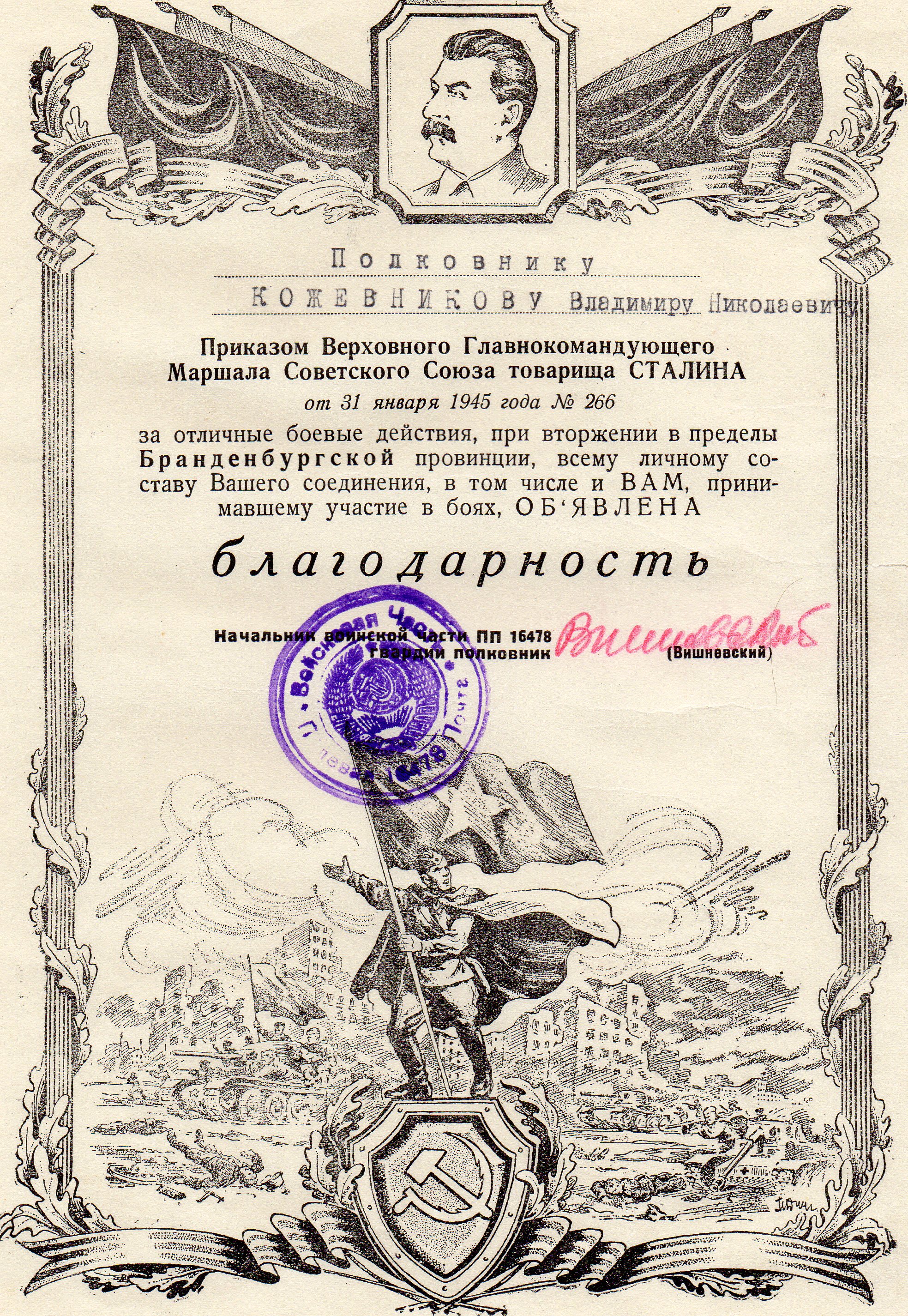 Боевой путь моего дедушки Кожевникова Владимира Николаевича в листках учета и грамотах