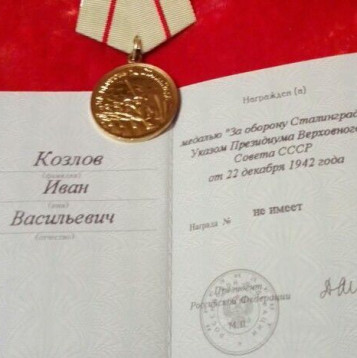 Козлов Иван Васильевич, родился 17. 03 1923 года Куйбышевской области, Исаклинского района, с. Обошено. С марта месяца по август 1942 года обучался в военном училище г. Моршанск. Затем был зачислен в 850 стрелковый полк 277 СД в состае 21-й армии Юго-Западного фронта (командующий генерал-лейтенат Н.Ф. Ватутин) В августе 1942 года в г. Новокузнецке дивизия пополнилась выпускниками военного училища г. Моршанска и отправлена на север Сталинградской области, в ноябре 277 СД находилась во втором эшелонеударной группировки 21-й армии на клетском плацдарме.Переправившись на левый берег Дона 27 ноября она вышла на рубеж Сокоревка-Песковатка. Продолжая наступление в южном направлении 277 СД вышла в район хутора Полтавский и высоту 129.0, где велись ожесточенные бои. В декабре 1942 года был тяжело ранен и направлен в эвакогоспиталь № 4104 с. Троицкое , Ташкенской области. Проходил лечение с 08 декабря 1942 г по 26 мая 1943 года. Через год врачебная комиссия признала Козлова И.В. по ст. 43 гр. II приказом ВКО № 336 1943 г. негоден. Был награжден: Орденом Отечественой войны IIстепени № ордена 4059624 Г № 279395; Государственной наградой СССР медалью "За оборону Сталинграда" Указом Президиума Верховного Совета СССР от 22 декабря 1942 г № 008853; медалью "За победу над Германией в великой отечественной войне 1941-1945г.г. 28. 03.1946 г. № 225592; Знак "25 лет Победы в В.О.В. за доблесть и отвагу в В.О.В. Министр обороны СССР Маршала Советского Союза А. Гречко: Юбилейными медалями (5 штук).