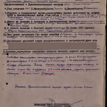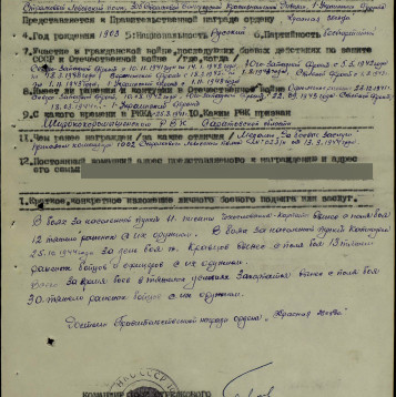 операции). Имеет одно легкое ранение 23.12.1943 года на Западном фронте, одно ранение легкое 10.08.1943 года на Степном фронте, одно