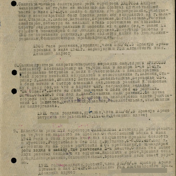 Ее зачислили санитаркой в санроту одного из полков Калининского фронта. Хрупкая девушка вытаскивала с поля боя раненых, когда на себе, когда волоком, - откуда только силы брались. Оставляла в безопасном месте - в воронке от разорвавшегося снаряда, ведь дважды снаряд в одно и то же место не попадает. Потом санитары на носилках переносили бойцов в медсанчасть. А еще ходила в разведку - выявляла огневые точки противника.