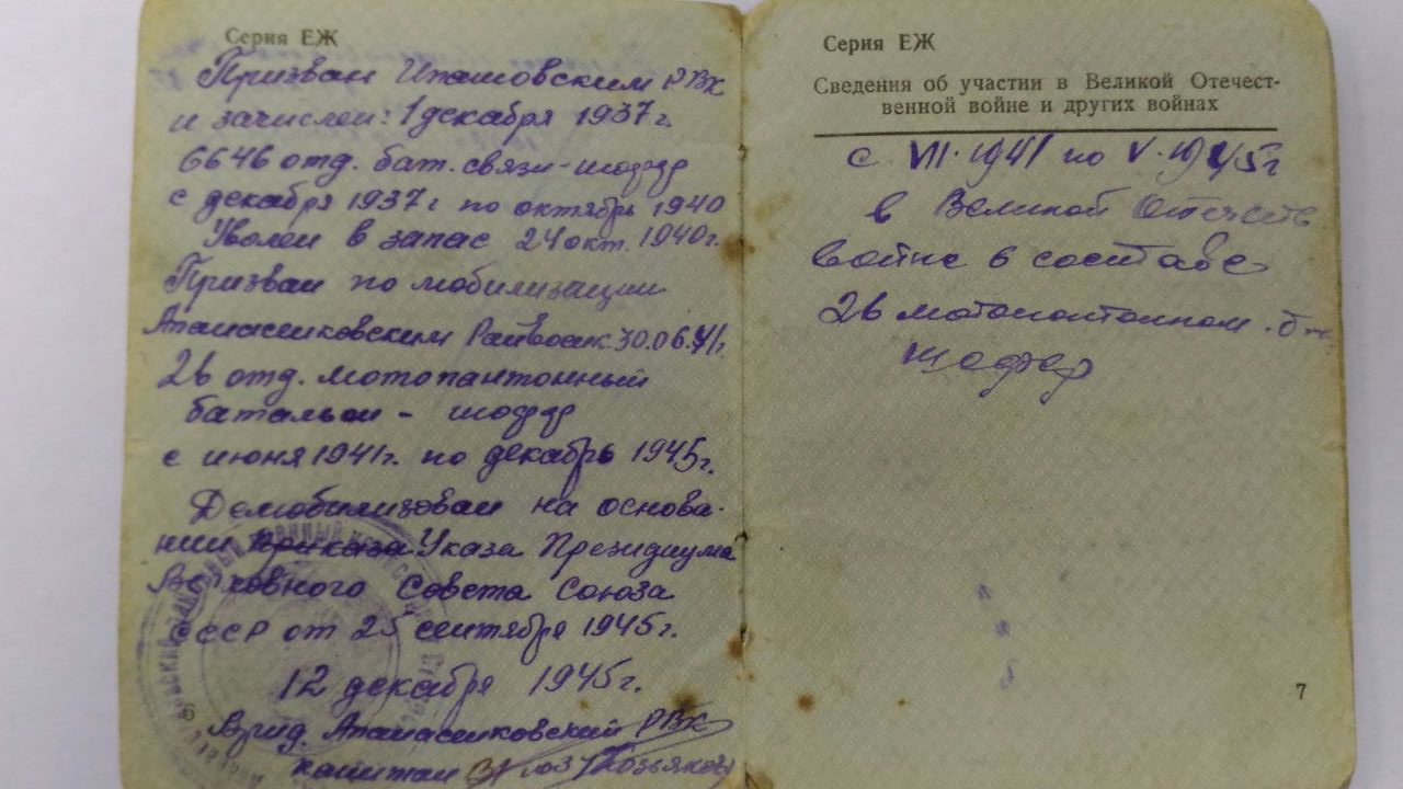 Дополнительные сведения: Вернулся с войны в 1945. ранений не было. Был женат. Есть дети. Работал шофером в колхозе "Путь Ленина" с. Рагули.
