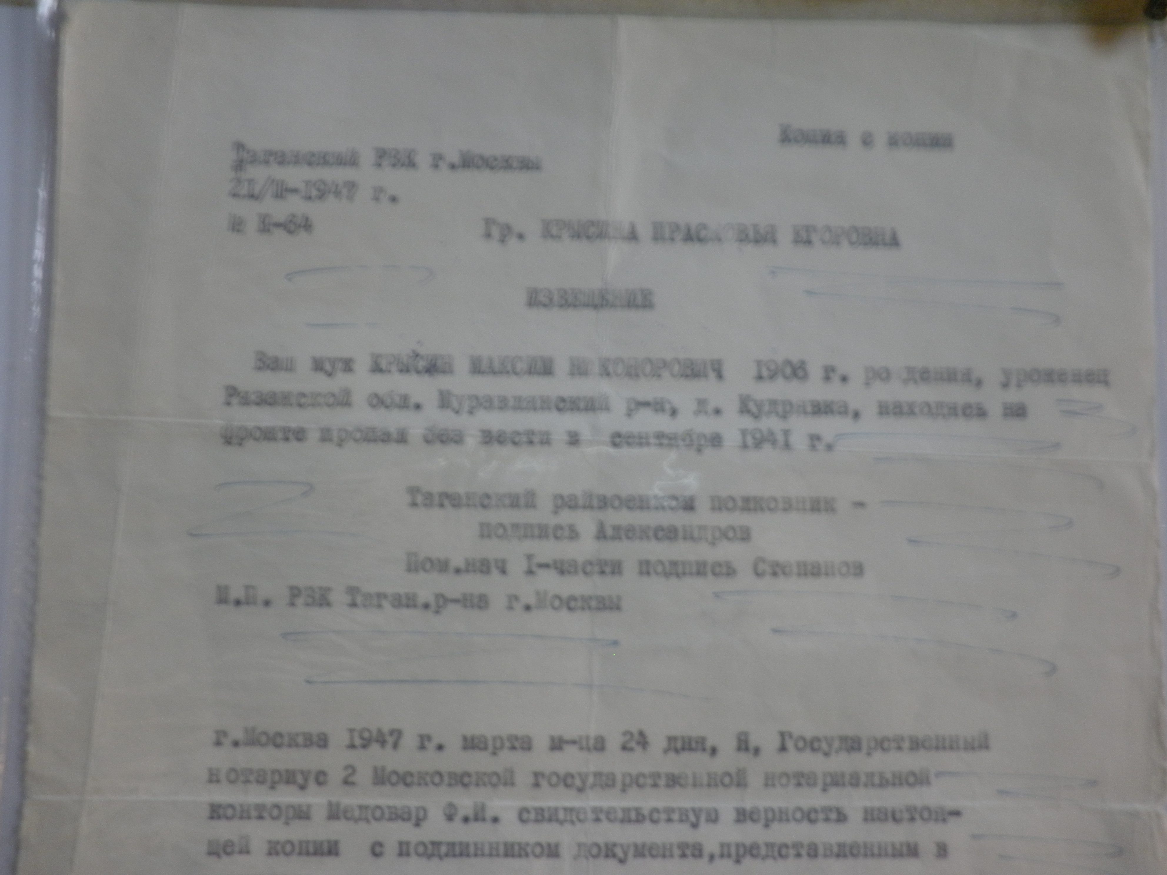 Мой дедушка, Максим Никонорович ушел на фронт добровольцем в первые дни войны. Дома осталась красавица жена и две дочери - маме ( старшей) было 14 лет, а младшей -7. А через три месяца бабушка - Прасковья Егоровна, получила ИЗВЕЩЕНИЕ от Таганского РВК г. Москвы за №К-64 Ваш муж, КРЫСИН МАКСИМ НИКОНОРОВИЧ 1906 г. рождения , уроженец Рязанской обл. Муравлянский р-н , д. Кудрявка, находясь на фронте пропал без вести в сентябре 1941 года. Таганский райвоенком полковник Александров.Пом.нач 1-части Степанов РВК ТАГАНСКОГО р-на г. Москвы. Младшая дочь очень боялась бомбежек и бабушка согласилась на эвакуацию в Башкирию. Маму ( 15 летнюю девочку !) отправили в ФЗО и в последствии на военное строительство. ЧЕТЫРЕ ГРАМОТЫ за УДАРНЫЙ ТРУД во ВРЕМЯ Великой Отечественной Войны ! НО ГРАМОТА - не документ. не важно, что стоит гербовая печать, ведь АРХИВ в УФЕ - СГОРЕЛ и ДОКУМЕНТОВ - НЕТ ! Когда семья моей мамы вернулась домой в Москву - квартира, в которой они проживали до войны оказалась занята... Бабушка пошла к военкому, а он ей: " А кто Вам сказал, что Ваш муж погиб? Может он предатель? Короче, поселили в подвал ( который даже я помню: огромные трубы по потолку, верх окна вровень с землей и фанерные перегородки между комнатами...Мы из этого подвала переехали только в 1959 году, а из вещей бабушке отдали только гардероб ( их, довоенный гардероб - точь-в-точь как в фильме 'Дом в котором я живу" Да и жили мы за Рогожской заставой на Шарике ( так москвичи сокращают ШАРИКОПОДШИПНИКОВСКУЮ ул. А вот в 1974 году ПОИСКОВИКИ ( НИЗКИЙ ИМ ПОКЛОН!) НАШЛИ ОСТАНКИ моего дедушки, его солдатскую книжку, медальон... ТЕПЕРЬ ИМЯ МОЕГО ДЕДУШКИ КРЫСИНА МАКСИМА НИКОНОРОВИЧА, 1906гр. СРЕДИ ДРУГИХ ИМЕН ЗАЩИТНИКОВ МОСКВЫ, НА ПОКЛОННОЙ ГОРЕ. Обо ВСЕХ настоящих фронтовиках, которые действительно проливавших свою кровь на фронтах ВЕЛИКОЙ ОТЕЧЕСТВЕННОЙ ВОЙНЫ сужу по своему папе, которого всегда отличала СКРОМНОСТЬ. В детстве ОЧЕНЬ ХОТЕЛОСЬ ПРОЙТИ РЯДОМ С НИМ ПО УЛИЦЕ и ЧТОБЫ ОН НАДЕЛ СВОЙ ПАРАДНЫЙ КОСТЮМ с ОРДЕНАМИ и МЕДАЛЯМИ... ВАМ, ВЕТЕРАНАМ Великой Отечественной, мы и грядущие поколения обязаны своей жизнью, возможностью растить детей, ЛЮБИТЬ РОДИНУ, ЦЕНИТЬ МИР!!! И СКОЛЬКО БЫ НИ ПРОШЛО ЛЕТ С ТОГО ПОБЕДНОГО МАЯ 1945 ГОДА - БЛАГОДАРНЫЕ ПОТОМКИ ВСЕГДА БУДУТ ЧТИТЬ ПОДВИГ ВЕРНЫХ СЫНОВ И ДОЧЕРЕЙ ОТЧИЗНЫ - ТЕХ, КТО ВЫСТОЯЛ и ПОБЕДИЛ В САМОМ ЖЕСТОКОМ СРАЖЕНИИ в ИСТОРИИ ЧЕЛОВЕЧЕСТВА, ЗДОРОВЬЯ и БЛАГОПОЛУЧИЯ ТЕМ, КТО с НАМИ и БЛАГОДАРНОЙ ПАМЯТИ О ТЕХ, КТО НЕ ВЕРНУЛСЯ или УШЕЛ....