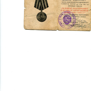 За участие в Великой Отечественной Войне Указом Президиума Верховного Совета СССР от 09 мая 1945 года награжден медалью "ЗА ПОБЕДУ НАД