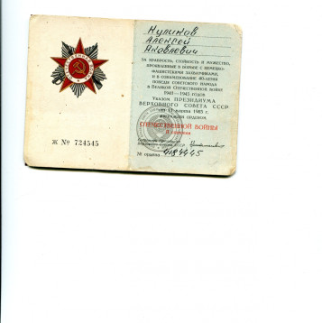 Великой Отечественной войне 1941-1945гг. Указом ПРЕЗИДИУМА ВЕРХОВНОГО СОВЕТА СССР от 11 марта 1985г. Награжден орденом ОТЕЧЕСТВЕННОЙ