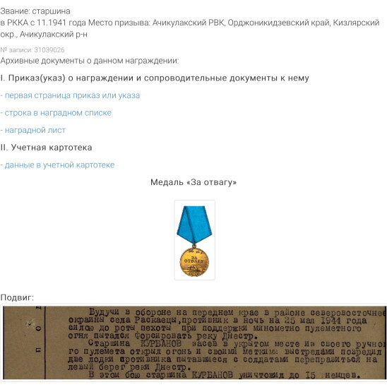 Курбанов Хабибула Гусейнгаджиевич родился в 1908 году в с.Аметерк, Акушинского района, Республики Дагестан. Он добровольцем ушел на фронт в ноябре 1941 года, воевал в Дагестанском кавалерийском полку в звании старшина. У него было много наград, но дома у нас сохранились только две - Орден "Красной звезды" и медаль "За отвагу". Во время войны был несколько раз ранен, лежал в госпитале. Хабибула дошел до Берлина, а потом воевал в Японии. После войны у него остались осколки в легких, которые нельзя было оперировать. От них он умер в 1957 году.