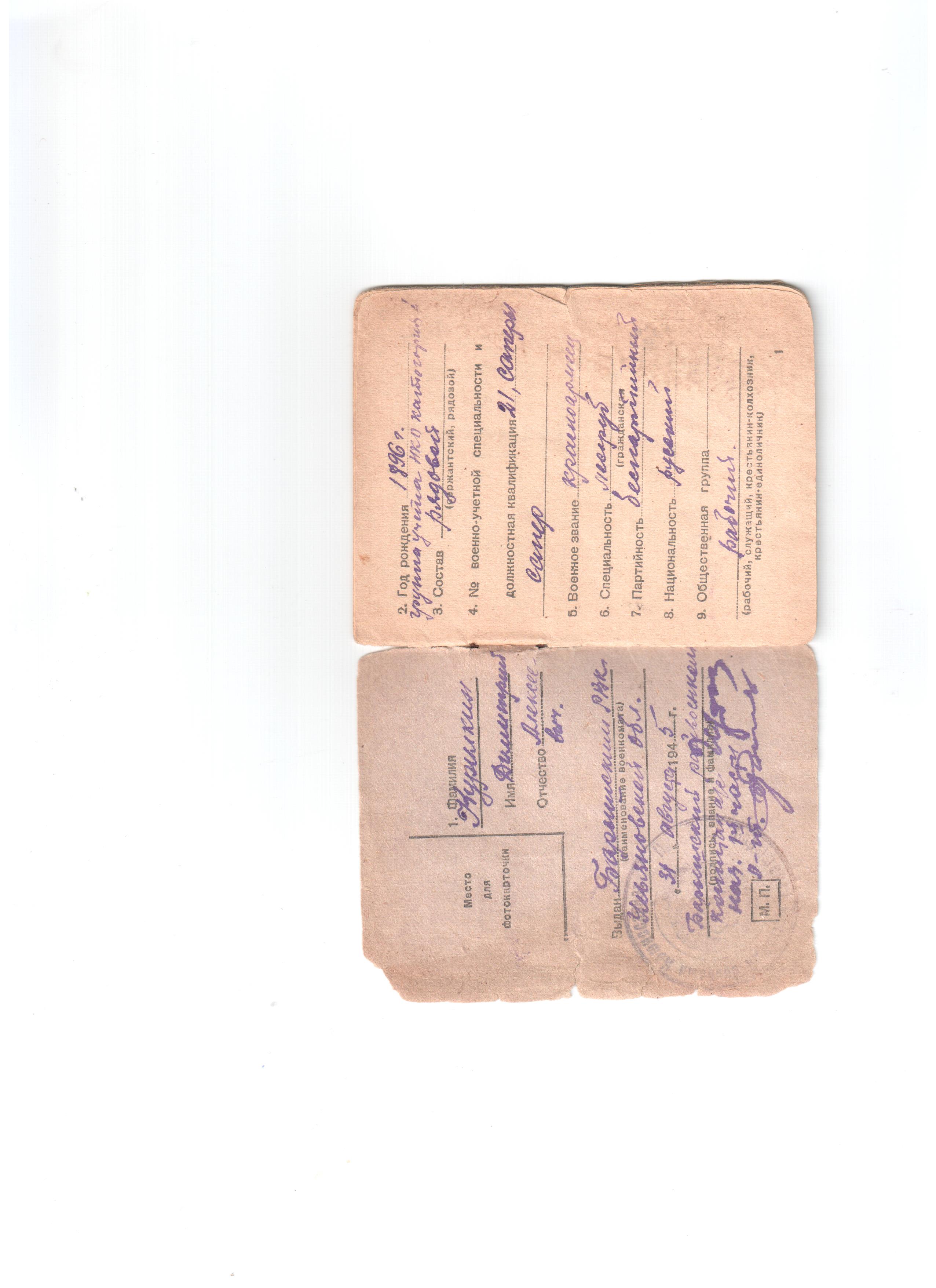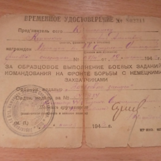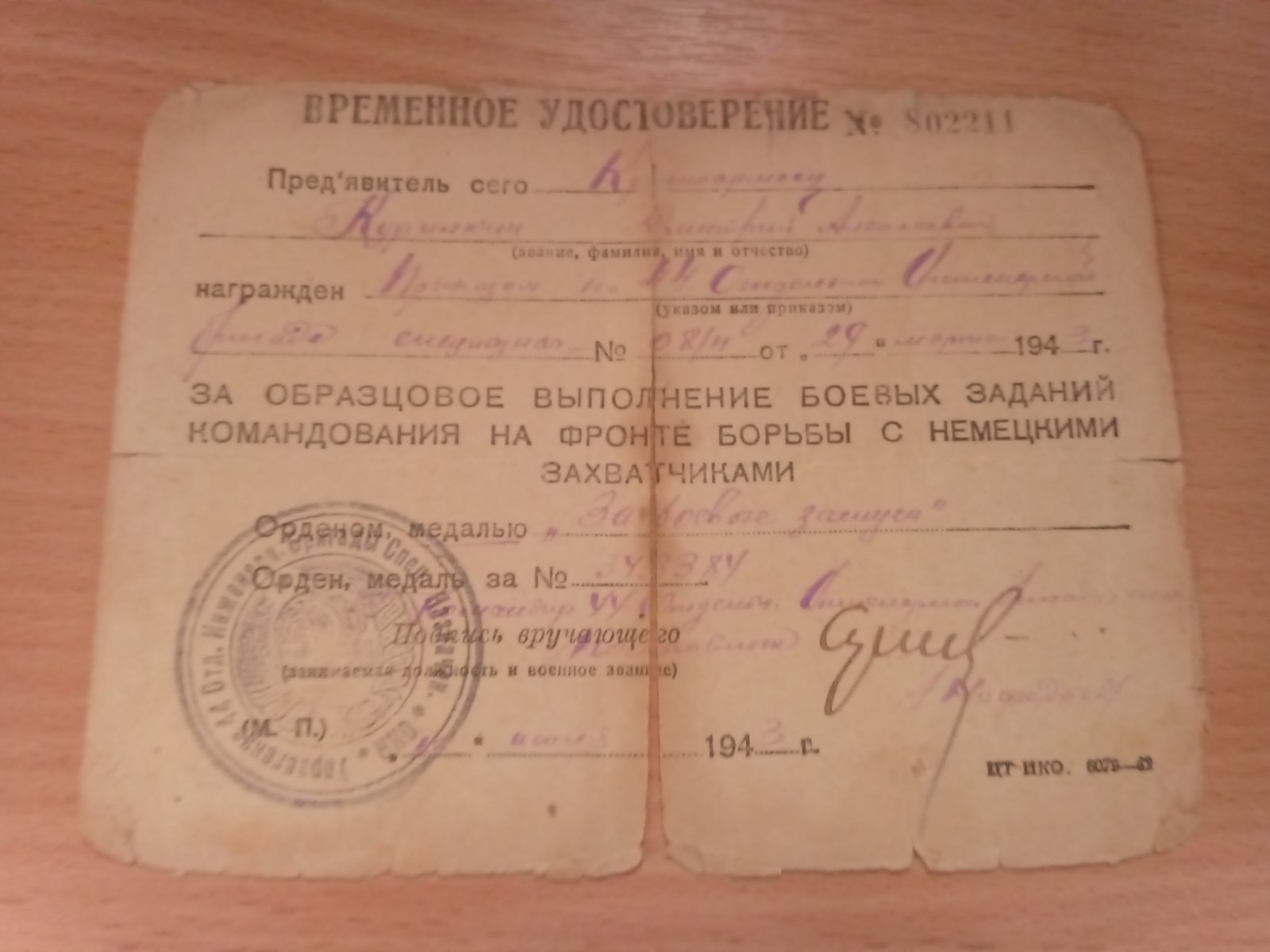 Курилкин Дмитрий Алексеевич родился 1896 году в селе Калда Барышского района Ульяновской области. Получил образование 3 класса, по национальности русский. Годы срочной службы попали на годы Первой Мировой войны, а затем и Гражданская война. Имеется запись: Сведения о прохождении службы в Красной Армии, Дмитрий Алексеевич был рядовым стрелком с августа 1918 по ноябрь 1921 года. Получил ранение, но об этом сведения не сохранились. Вернувшись в родное село, женился на Прасковье Михайловне, работал сортировщиком леса. Когда началась война, он был призван Барышским РВК (призван в ноябре 1941 года, об этом свидетельствует запись в военном билете) и прошел всю войну сапёром. В нашей семье не сохранились фото с войны, но сохранились документы. Так же бережно хранятся Красноармейская книжка, Военный билет, временное удостоверение №802211 о награждении медалью «За боевые заслуги», удостоверение к Ордену Отечественной войны I степени и медицинская справка о ранении.