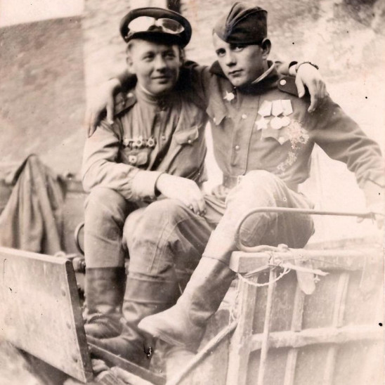 Разведчик батареи управления 11 артд РГК: Куркин Виктор Николаевич родился в Брянске, призывался из Челябинской обл. Участник Сталинградской битвы. Награды Медаль «За оборону Сталинграда» Медаль «За отвагу» №: 17/н от: 05.11.1943 Издан: 11 артд РГК 7 гв. А 2 УкрФ. За личный захват «языка», был награжден Орденом Славы III степени Приказ № 2/н от: 24.01.1945 Издан: 11 артд РГК 2 УкрФ. В 1944 за захват унтер-офицера и солдата его представляли к Ордену Славы III степени, наградили Орденом Красной Звезды №: 32/н от: 08.09.1944 Издан: 11 артд РГК. На фотографии он с командиром взвода разведки ст. лейтенантом - Кузьминым Петром Яковлевичем (17.10.1921- 28.02.1983 г. Губкин). Период создания фотографии: апрель 1945 г. Место создания: Австрия, г. Густопече. Местонахождение Госкатолог - Губкинский краеведческий музей