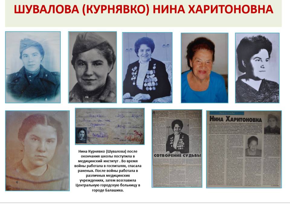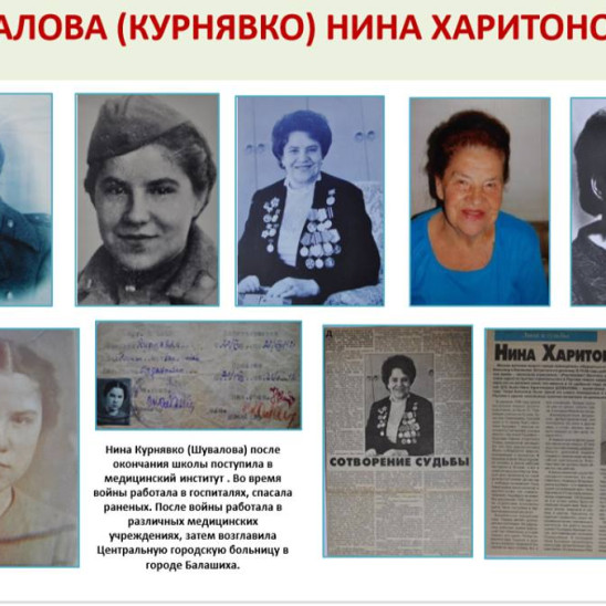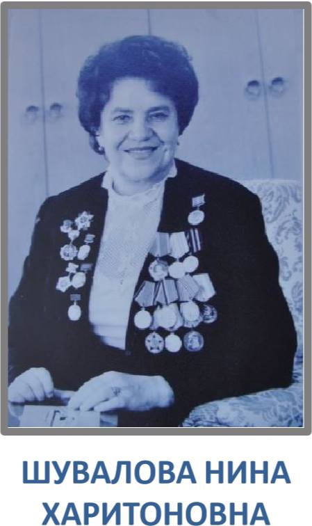 Родилась 14 марта 1921 года в г. Смоленске. 1 сентября 1928 года поступила в класс Салтыковской школы (Балашихинский район), где училась до 1935 года. 10-й класс окончила в г. Реутово (1935 – 1938 гг.). В 1938 г. поступила в Московский Медицинский институт.В апреле 1942 г. из Медицинского института была мобилизована в Советскую Армию врачом, где ее назначили начальником отделения в эвакогоспитале № 4845. В декабре 1942 года переведена в г. Ногинск в эвакогоспиталь. С 23 февраля 1943 г. переведена в г. Орехово-Зуево в эвакогоспиталь № 2929 – начальником хирургического отделения в звании капитан медслужбы. Весь госпиталь на товарном эшелоне был направлен на фронт. Дислоцировались на Смоленском направлении, лечили раненых (госпиталь был рассчитан на 2 тыс. человек), которые поступали с передовой, готовили их для отправки в тыл. Госпиталь работал в лесу без всяких удобств на базе бывшего немецкого штаба, в казармах. В апреле 1944 г. госпиталь № 2929 разделили, половину отправили в г. Кененсбург, другую половину – на войну с Японией. С 1945 г. после Победы в Великой Отечественной войне Н.Х. Шувалова работала в течение нескольких месяцев в Салтыковском детском доме врачом. С июня 1945 г. работала заведующей и врачом в детских яслях фабрики № 5 г. Балашиха и врачом в амбулатории фабрики № 5. Обслуживала больных на дому. В 1952 г. была назначена главным врачом Балашихинской районной больницы. Н.Х. Шувалова имеет высшую аттестационную категорию по органам здравоохранения. С 1954 г. – заведующая Балашихинским районным здравотделом. 1954 – 1956 гг. – заместитель заведующего Мособлздравотделом по лечебной части. С 1956 г. – главный врач Балашихинской районной больницы. 1982 – 1992 гг. – главный врач Санатория-профилактория «Дружба» завода БЛМЗ г. Балашиха. В 2003 году вышла по возрасту на пенсию. Награды и почетные звания: - участник ВОВ; - депутат Городского Совета Балашихинского района (выдержала 14 созывов с 1953 по 1982 гг.); - Отличник Здравоохранения (приказ Министерства Здравоохранения 1958 г.); - Заслуженный врач РСФСР (1969 г.); - Орден Ленина 2-й и 3-й степени (1976 г.) + 17 медалей; - член Ученого совета МОНИКИ (1963 – 1984 гг.); - член Коллегии Мособлздравотдела (1967 – 1984 гг.); - член Балашихинского Исполкома райгорсовета (1969 – 1982 гг.); - Почетный гражданин Балашихинского района с 23 мая 2000 года (занесена на Доску почета в 2001 году в День города, затем повторно в 2003 г.); - участник Парада Победы на Красной площади г. Москвы (3-9 мая 2000 г.); Нина Харитоновна Шувалова имеет свидетельство № 1253000 на изобретение «Способ лечения ожогов глаз» путем проведения гипербарической оксигенации в барокамере в Балашихинской центральной районной больнице.