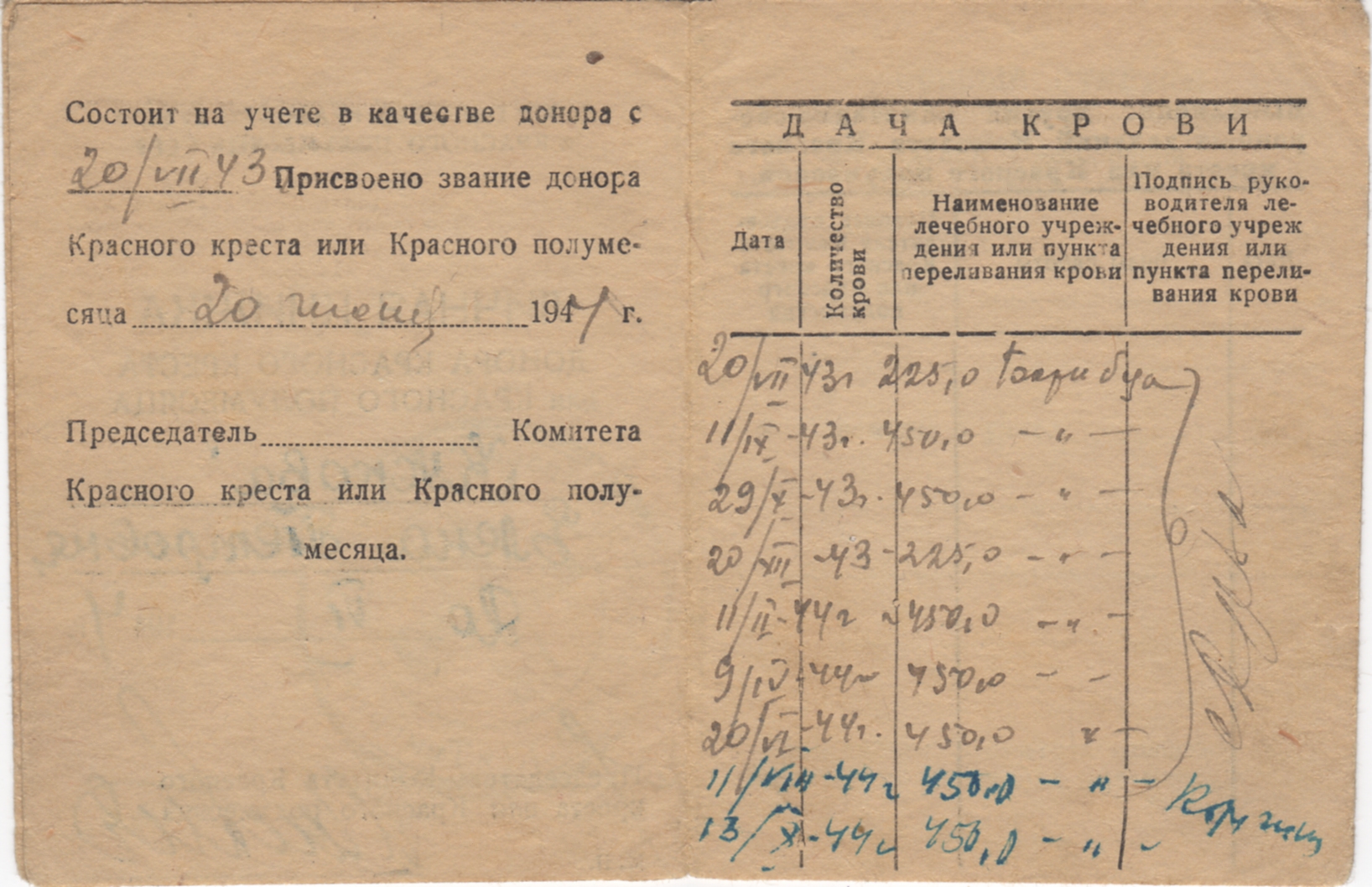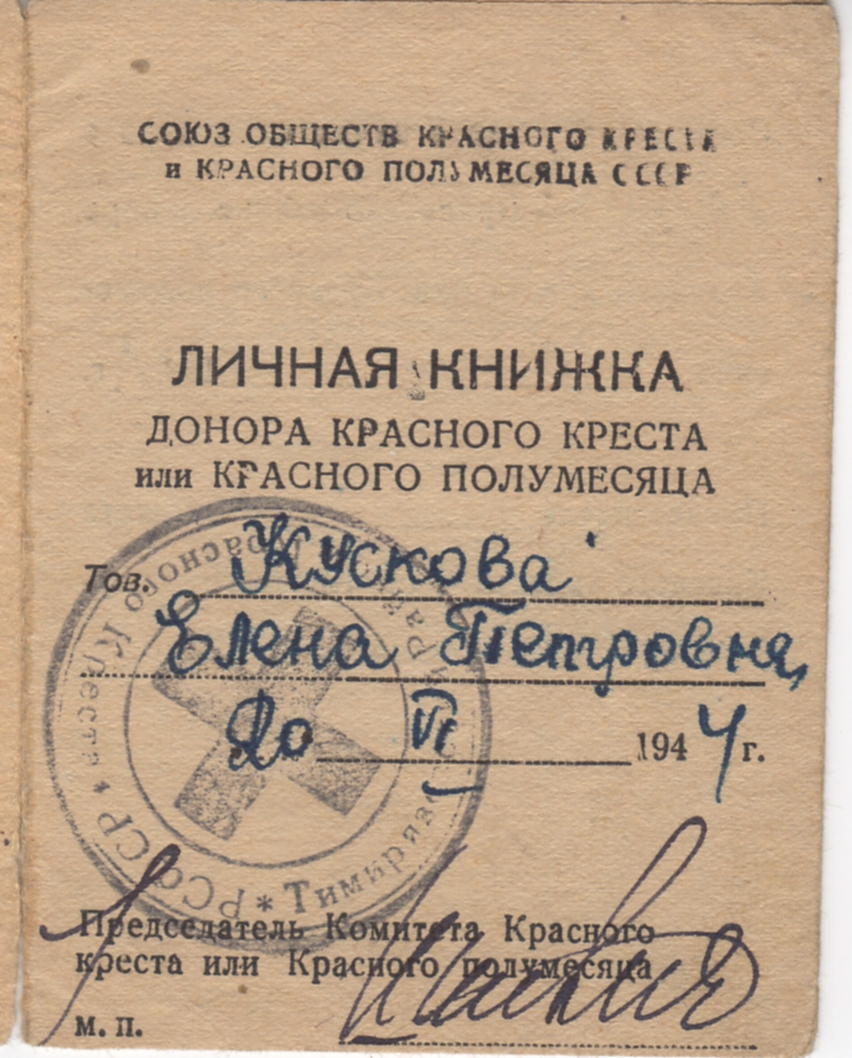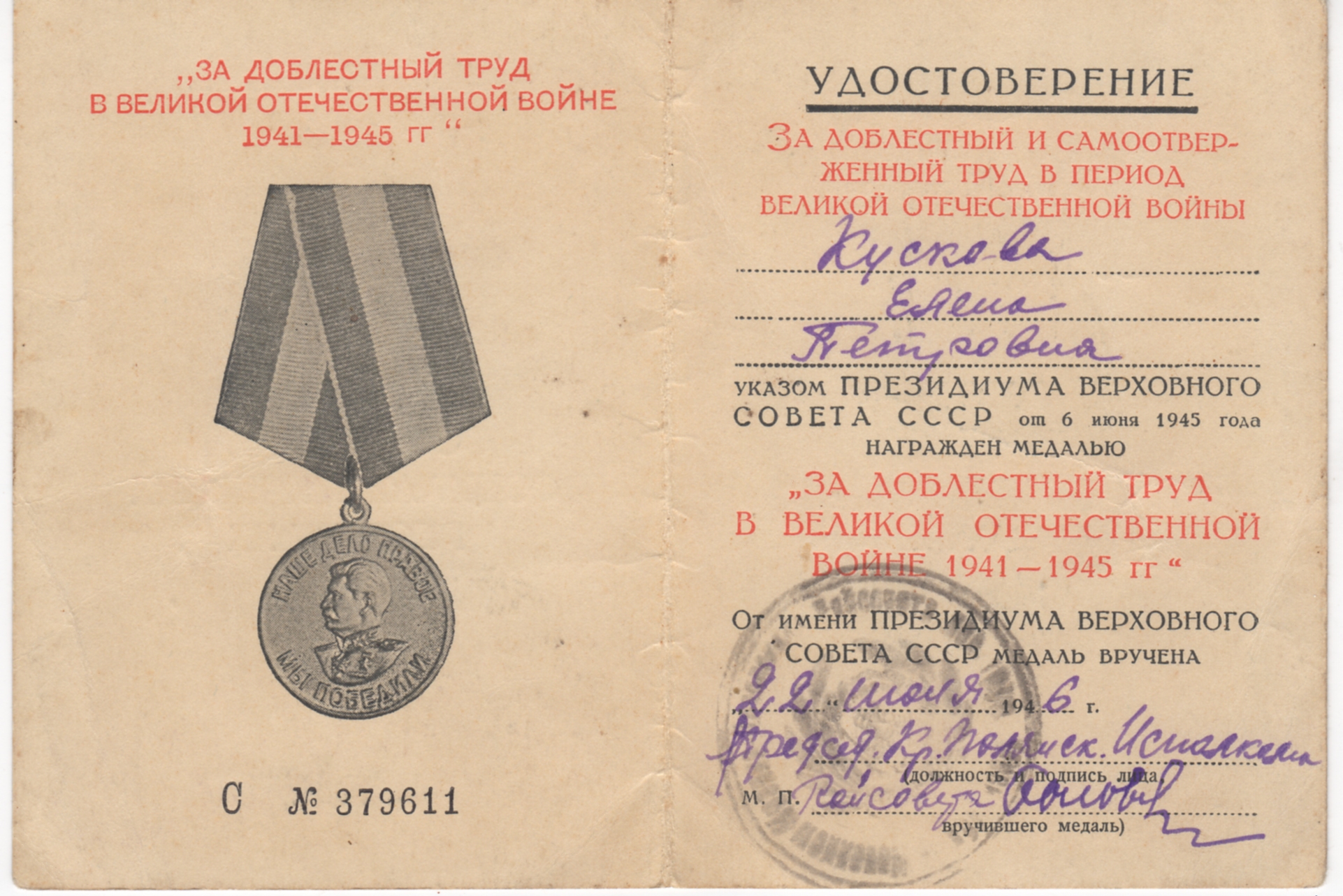 Моя бабушка Кускова Елена Петровна 1914 года рождения на момент начала войны на руках имела четверых маленьких детей, самому старшему было 5 лет (он умер от менингита во время войны в возрасте 7 лет). Сначала оказалась в оккупации, немцы остановились в деревне Трутнево, где жила моя бабушка с детьми и матерью. Она рассказывала, что было голодно и она тайком ночью бегала через лес (через линию фронта) в деревню Сухарево к тетке за продуктами, та нагрузит ей целый мешок еды и она шла обратно, за ночь проходила около 15 км. Когда немцы отступили они сожгли деревню, но население не тронули. Бабушка очень сокрушалась о том, что сгорели письма от мужа и документы. С июня 1943 по июнь 1944 год была донором. За раз сдавала до 450 мл крови, а положенный паек тайком носила детям, говорила, что все матери так делали, хотя им и запрещали это делать, следили чтобы они сами ели, но они все равно проносили еду детям. Награждена медалью " За доблестный труд в великой отечественной войне 1941-1945 гг".