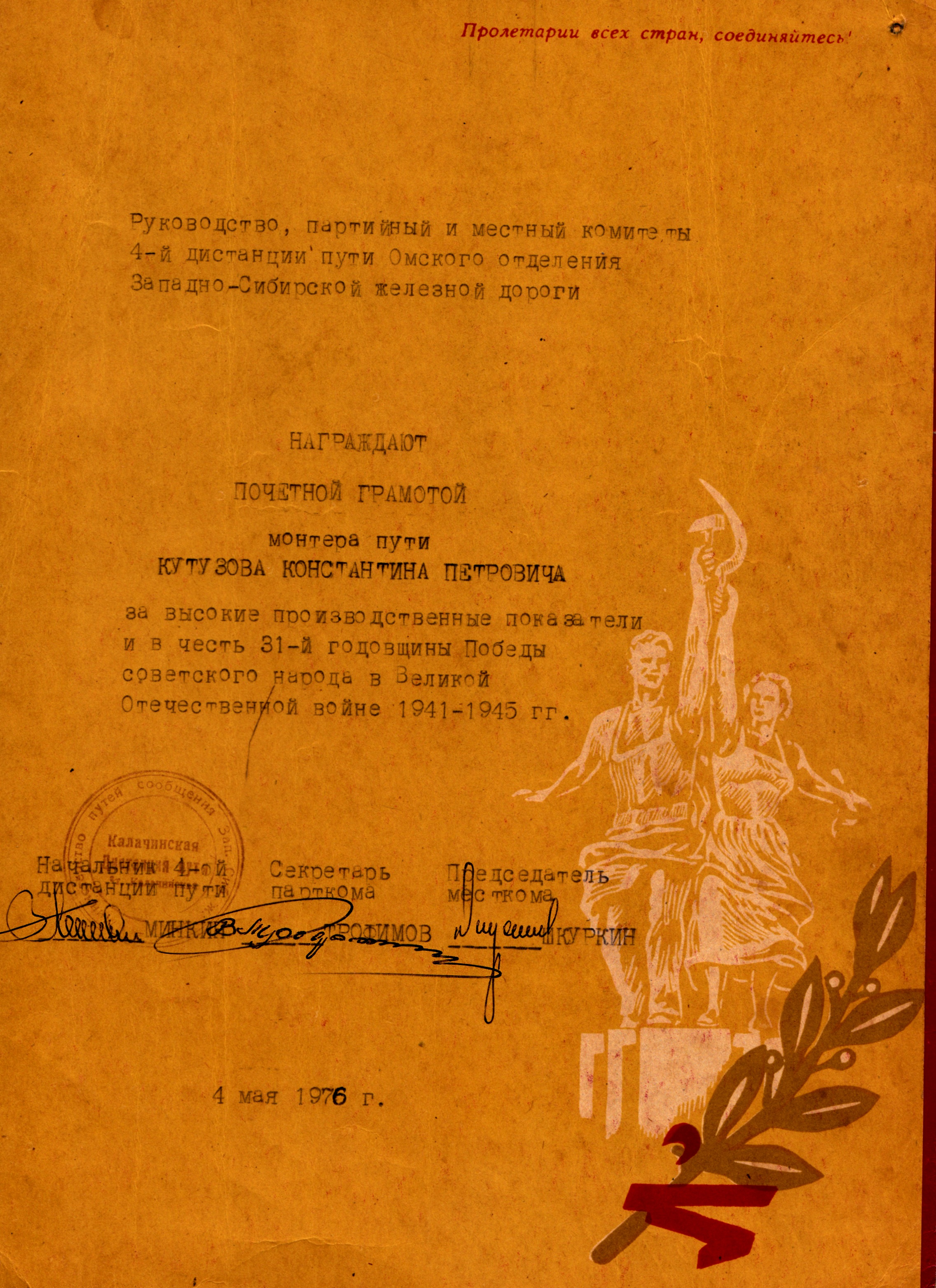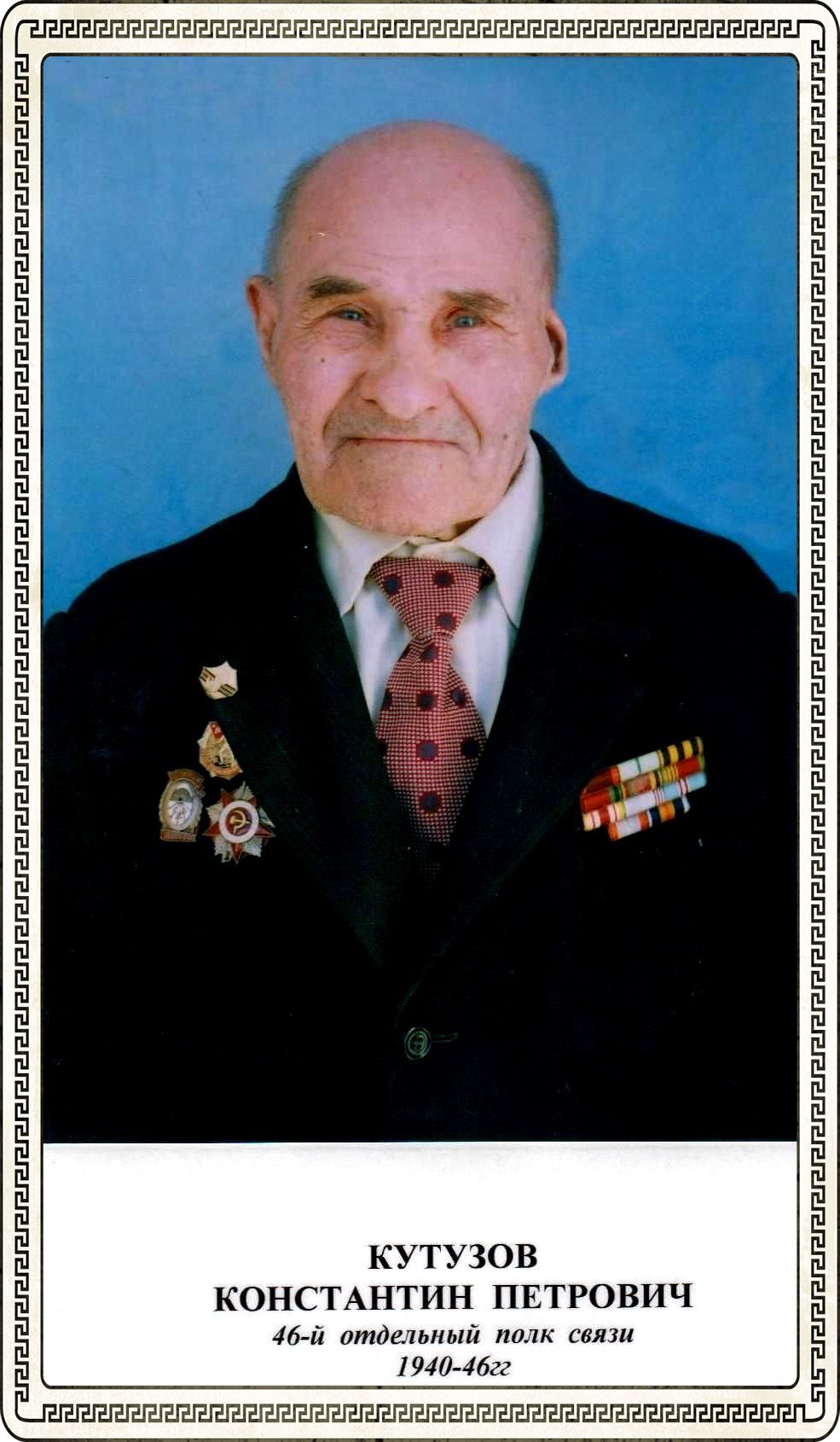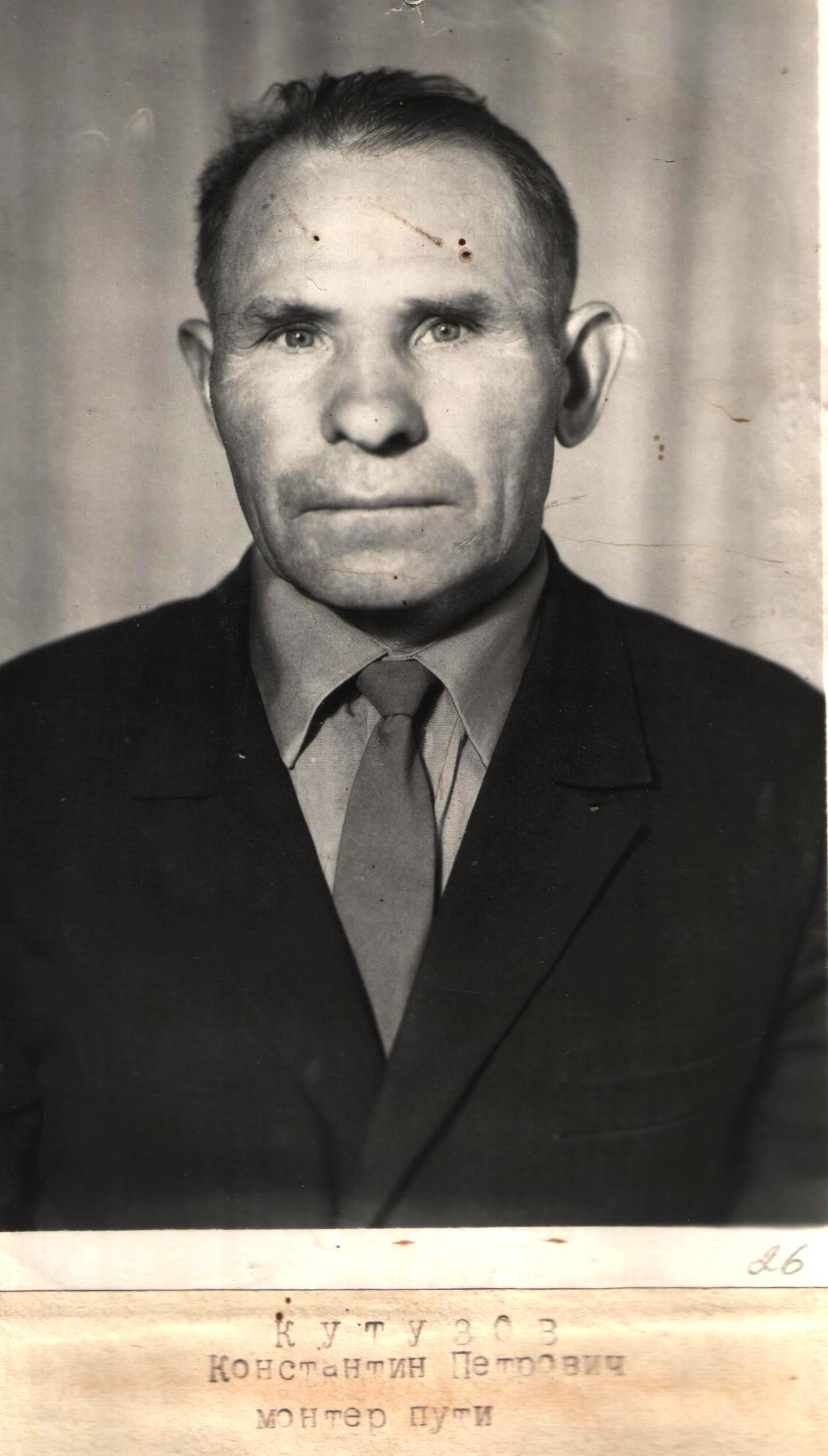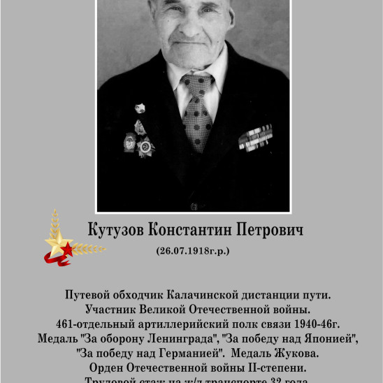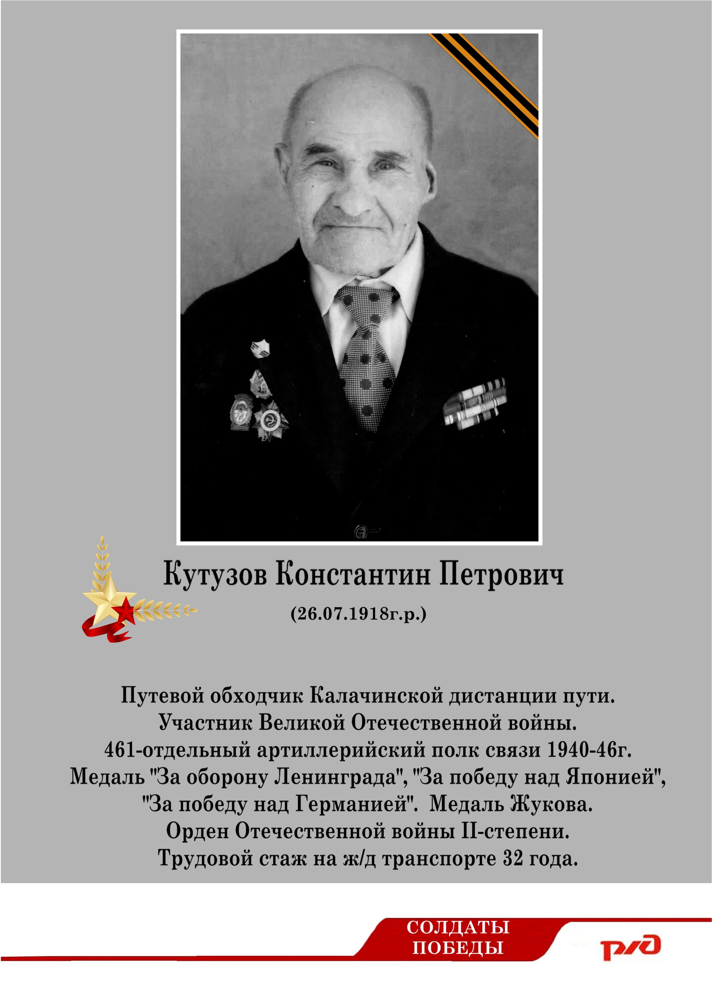 КУТУЗОВ КОНСТАНТИН ПЕТРОВИЧ - (1918-2015) Участник Великой Отечественной войны. Коммунист. Ефрейтор 461 отдельного артиллерийского полка связи с 1940-1946 г. Медаль «За оборону Ленинграда», «За победу над Японией», «За победу над Германией». Орден Отечественной войны 2 степени. Путевой обходчик Калачинской дистанции пути с 16.08.1946 года. Награжден знаком «Отличный путеец». В 1954 году за добросовестный труд и высокую дисциплину занесен в книгу Почета с объявлением благодарностей. Медаль Жукова. Трудовой стаж на предприятии 32 года.