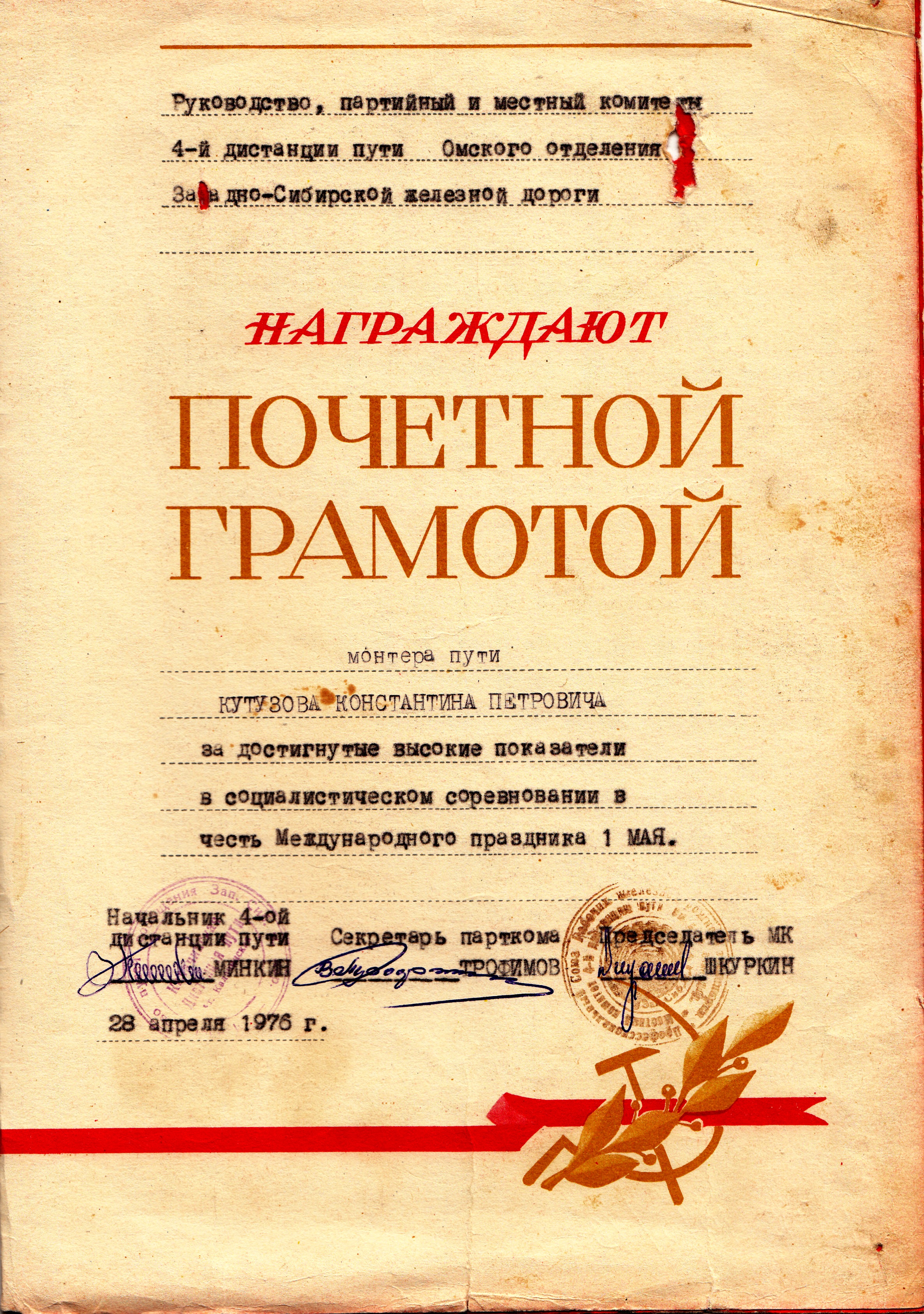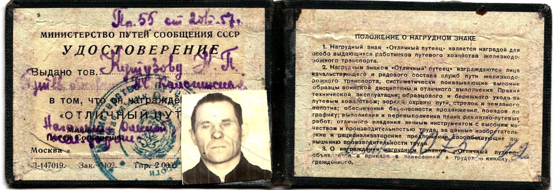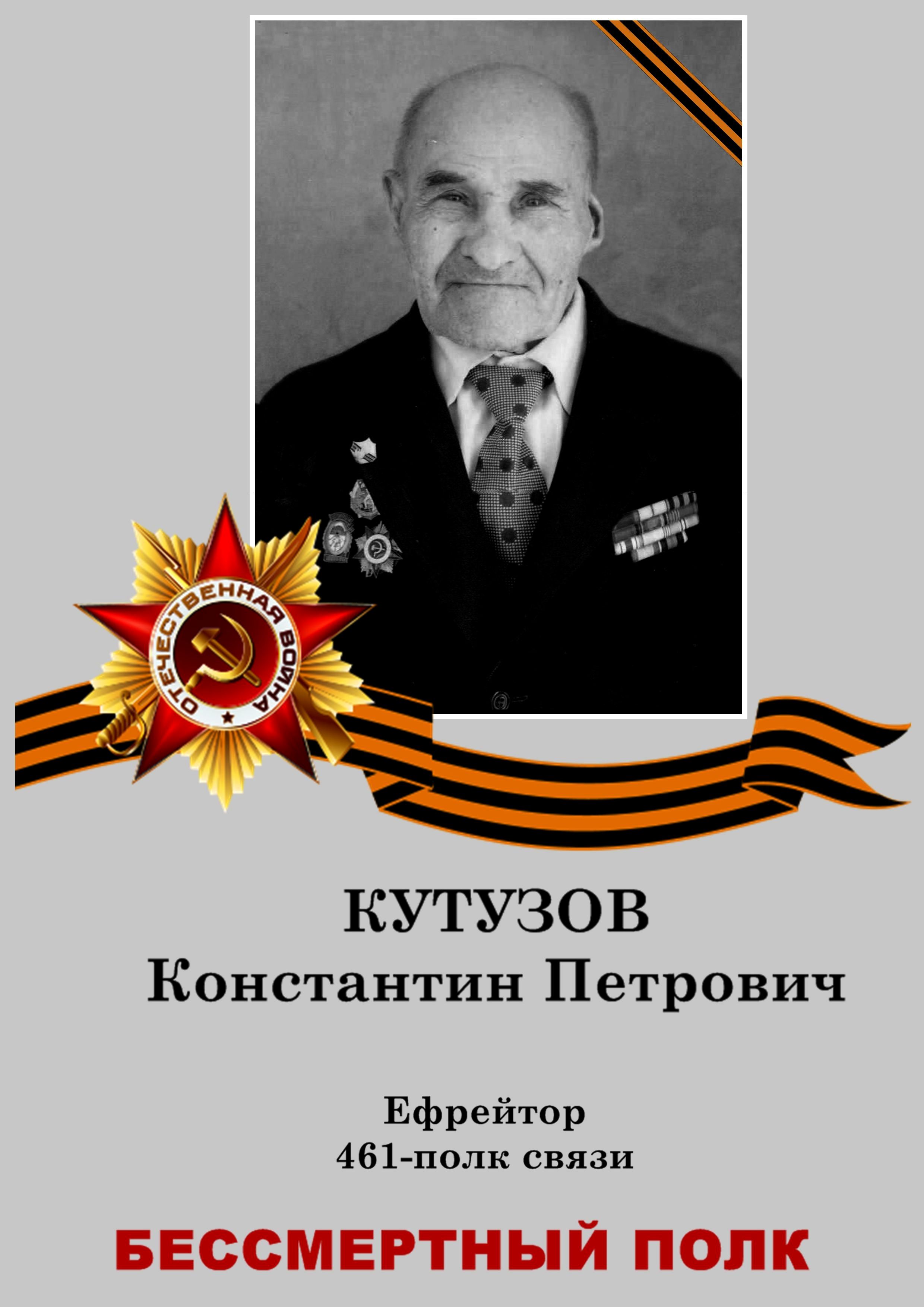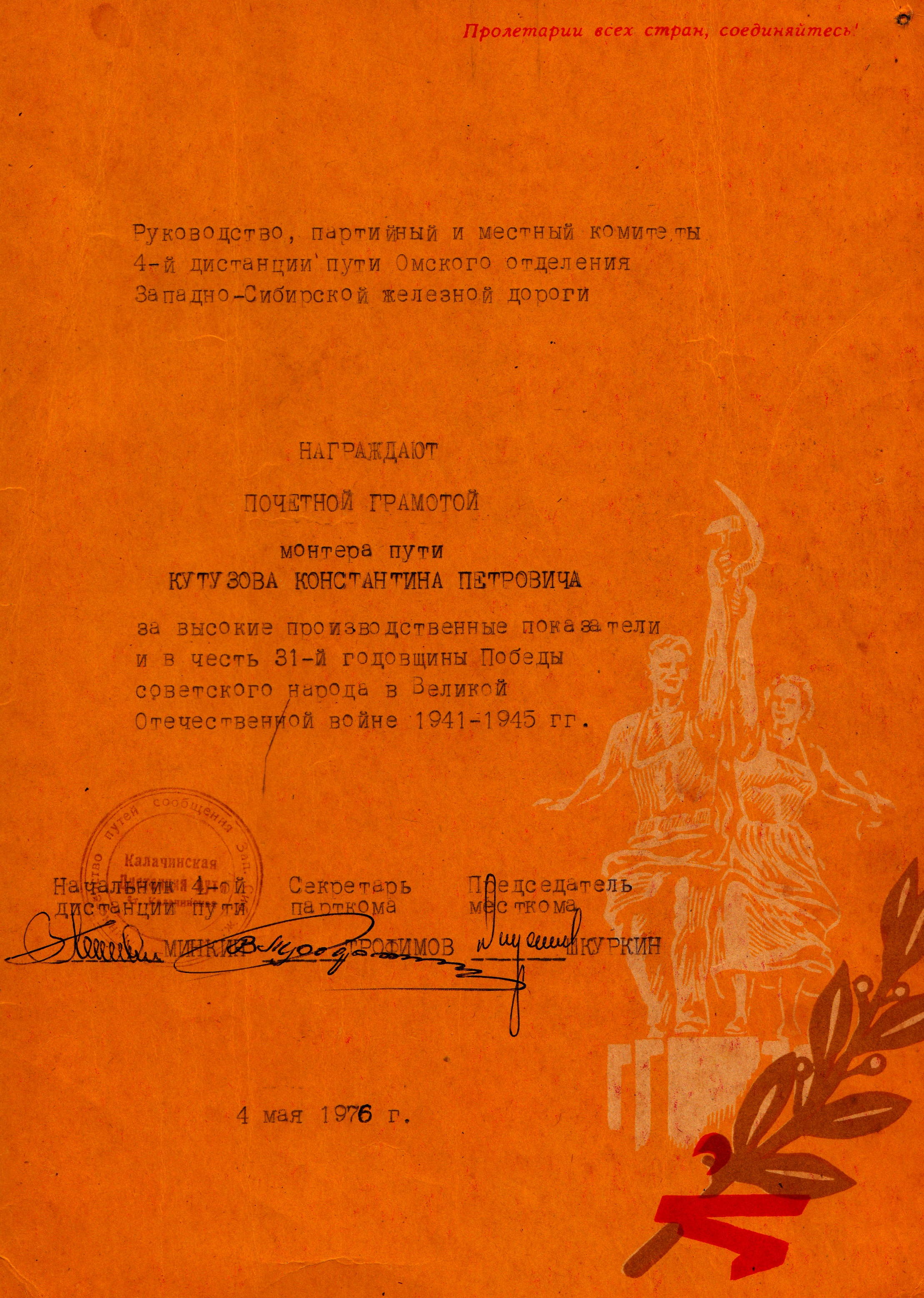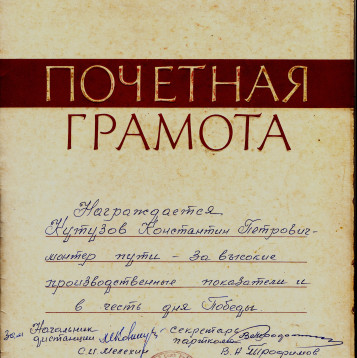 КУТУЗОВ КОНСТАНТИН ПЕТРОВИЧ - (1918-2015) Участник Великой Отечественной войны. Коммунист. Ефрейтор 461 отдельного артиллерийского полка связи с 1940-1946 г. Медаль «За оборону Ленинграда», «За победу над Японией», «За победу над Германией». Орден Отечественной войны 2 степени. Путевой обходчик Калачинской дистанции пути с 16.08.1946 года. Награжден знаком «Отличный путеец». В 1954 году за добросовестный труд и высокую дисциплину занесен в книгу Почета с объявлением благодарностей. Медаль Жукова. Трудовой стаж на предприятии 32 года.
