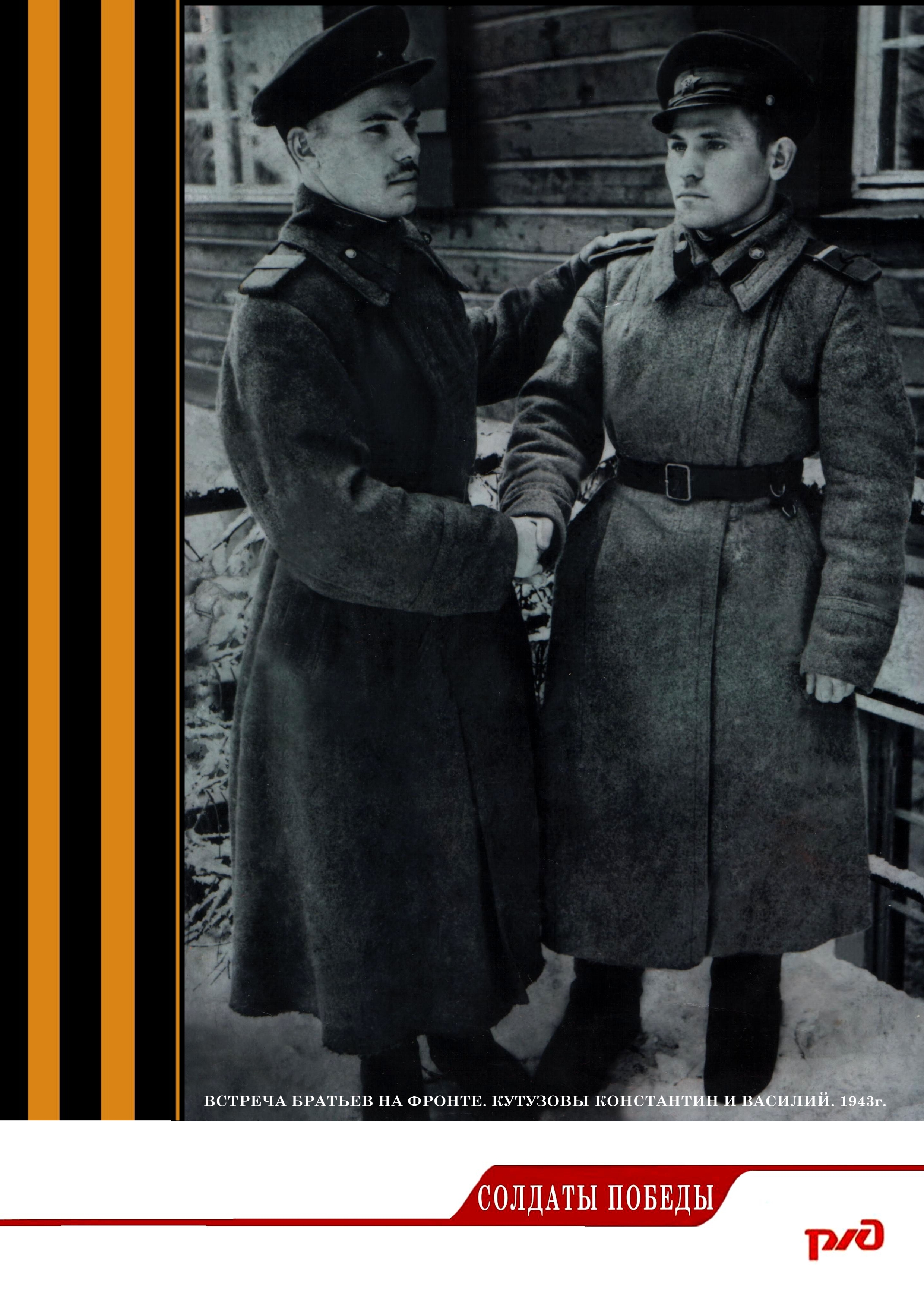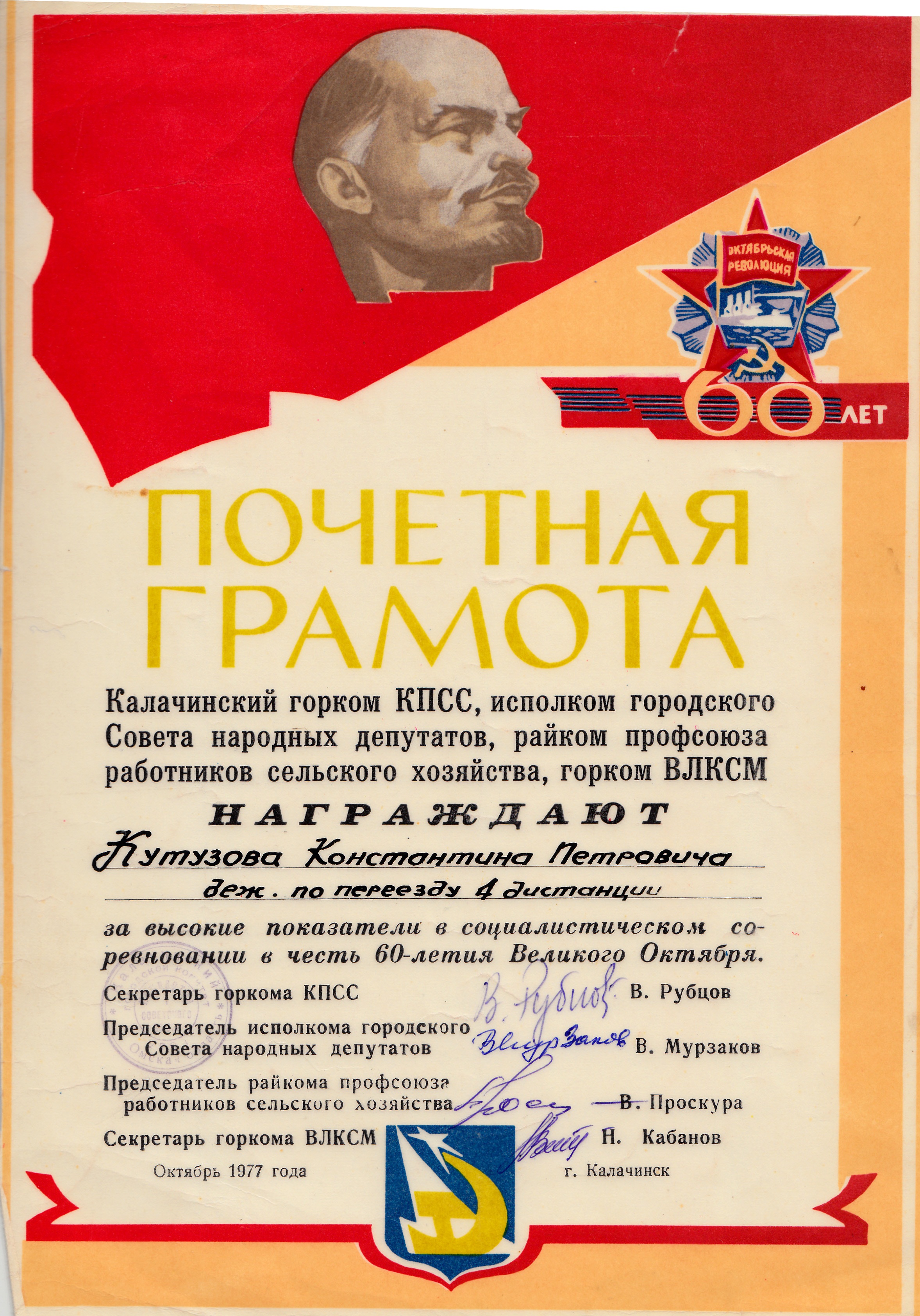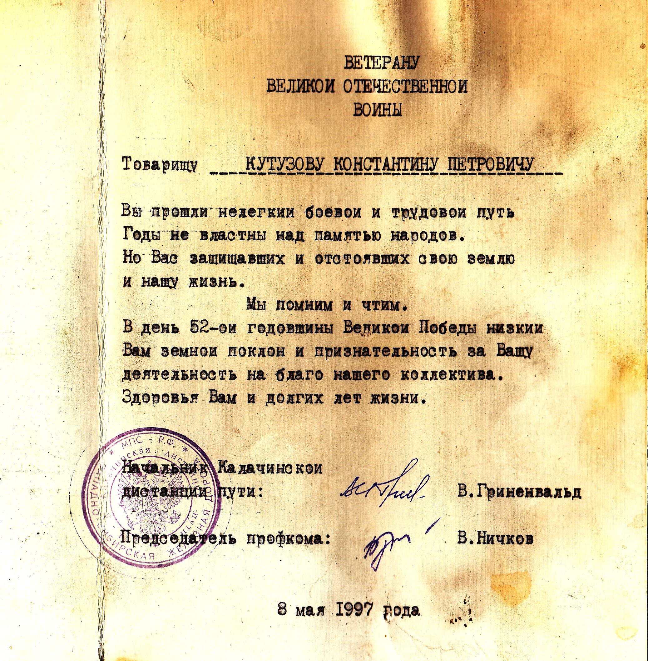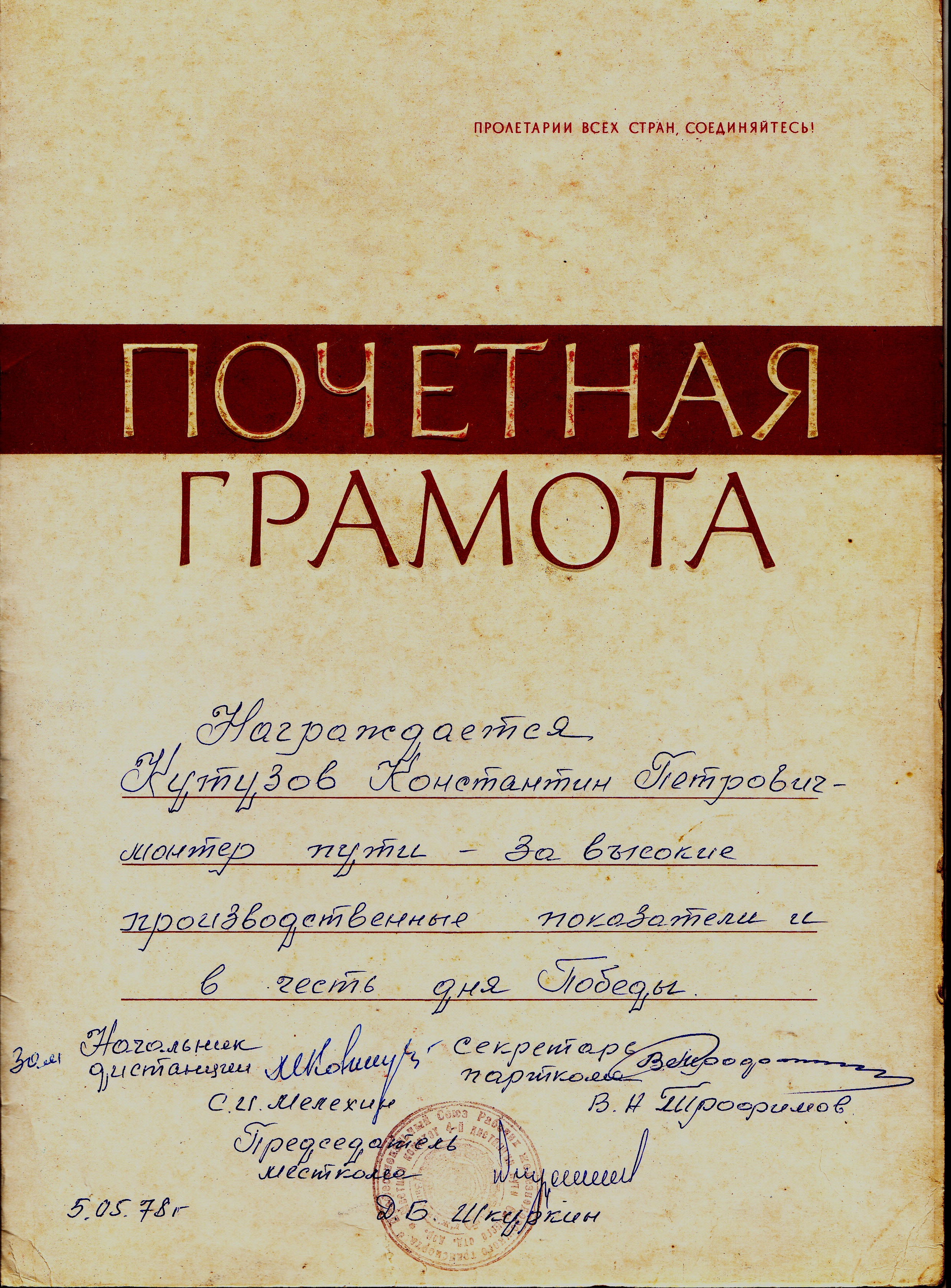 КУТУЗОВ КОНСТАНТИН ПЕТРОВИЧ - (1918-2015) Участник Великой Отечественной войны. Коммунист. Ефрейтор 461 отдельного артиллерийского полка связи с 1940-1946 г. Медаль «За оборону Ленинграда», «За победу над Японией», «За победу над Германией». Орден Отечественной войны 2 степени. Путевой обходчик Калачинской дистанции пути с 16.08.1946 года. Награжден знаком «Отличный путеец». В 1954 году за добросовестный труд и высокую дисциплину занесен в книгу Почета с объявлением благодарностей. Медаль Жукова. Трудовой стаж на предприятии 32 года.