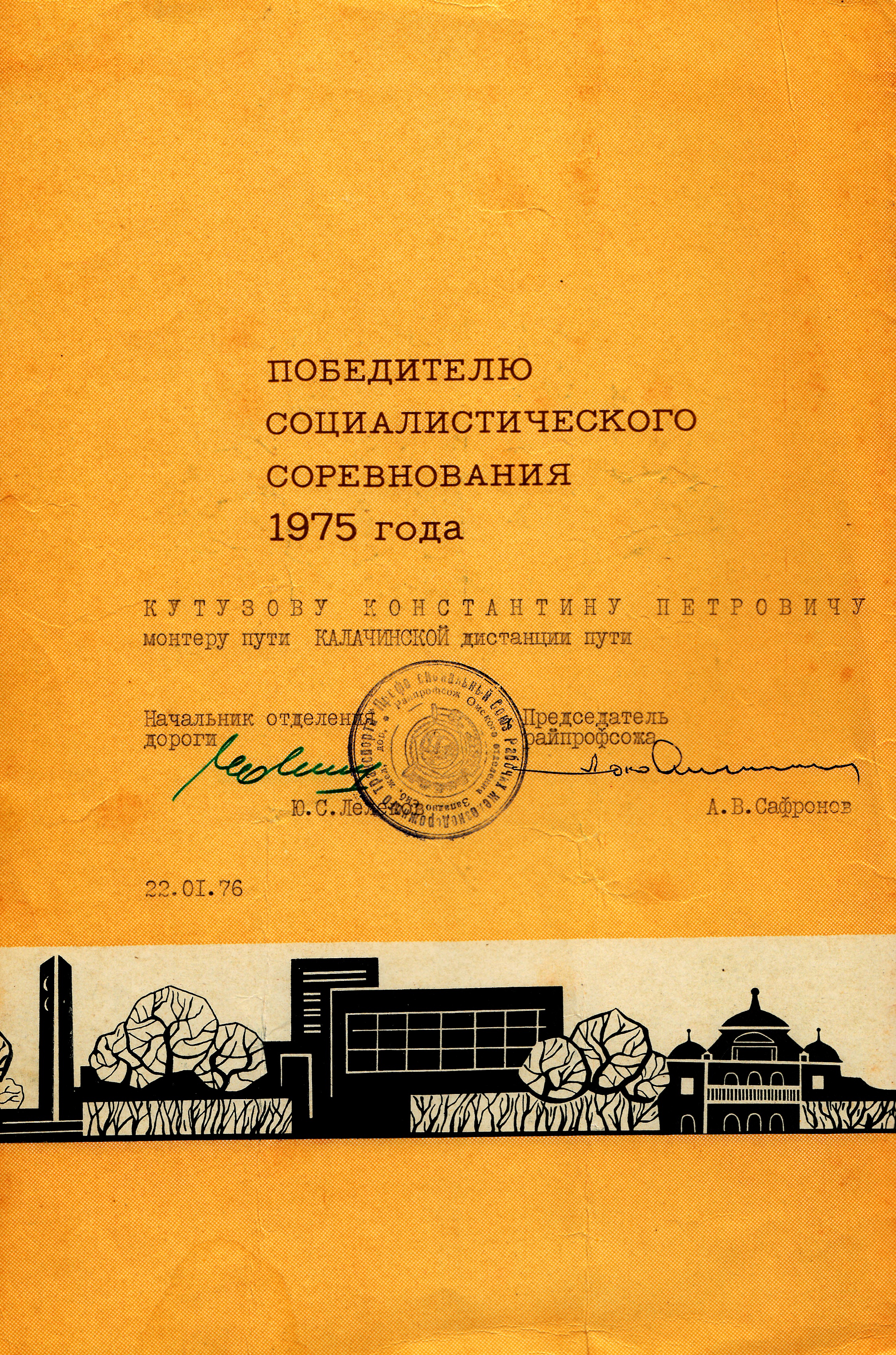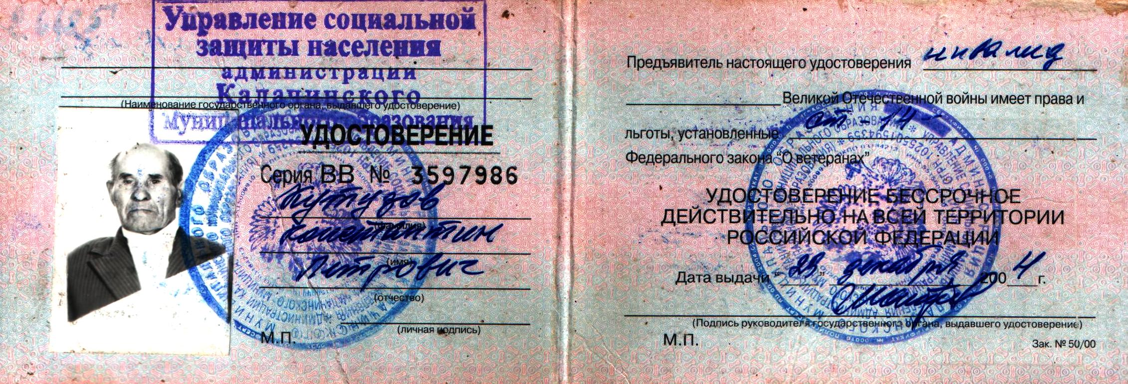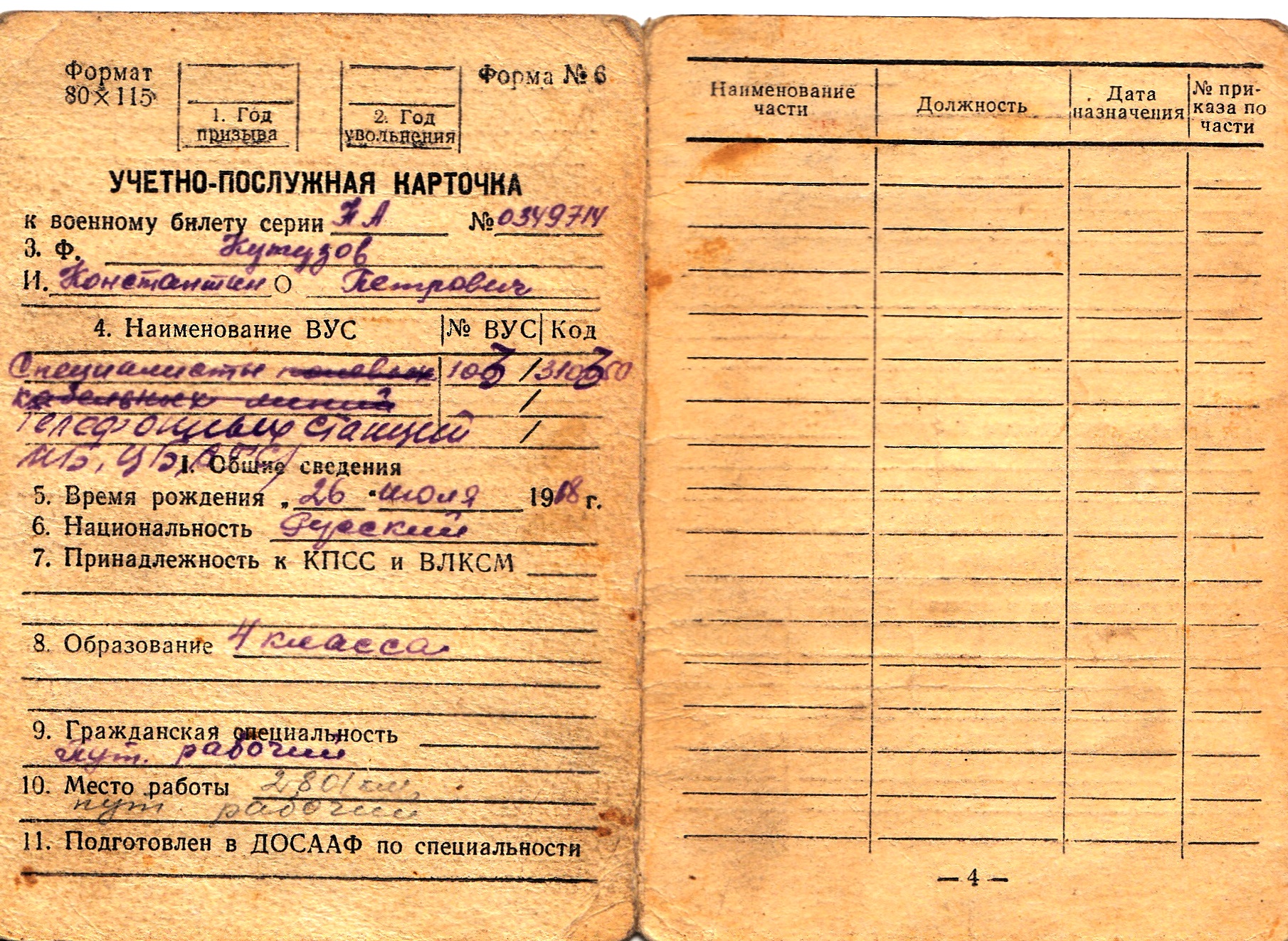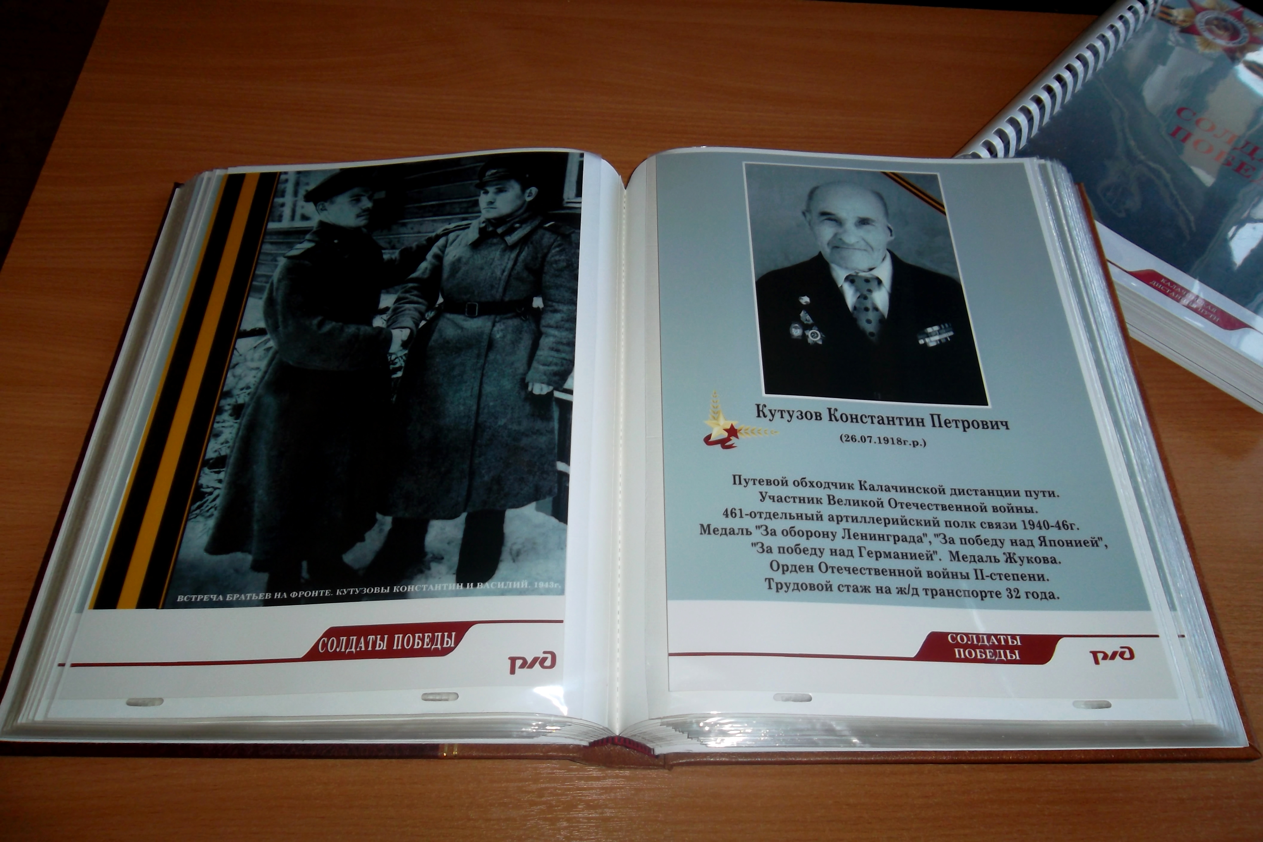 КУТУЗОВ КОНСТАНТИН ПЕТРОВИЧ - (1918-2015) Участник Великой Отечественной войны. Коммунист. Ефрейтор 461 отдельного артиллерийского полка связи с 1940-1946 г. Медаль «За оборону Ленинграда», «За победу над Японией», «За победу над Германией». Орден Отечественной войны 2 степени. Путевой обходчик Калачинской дистанции пути с 16.08.1946 года. Награжден знаком «Отличный путеец». В 1954 году за добросовестный труд и высокую дисциплину занесен в книгу Почета с объявлением благодарностей. Медаль Жукова. Трудовой стаж на предприятии 32 года.