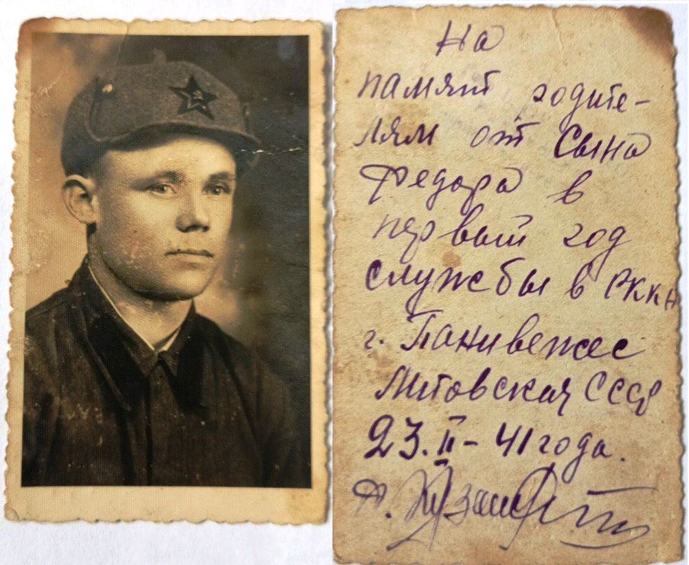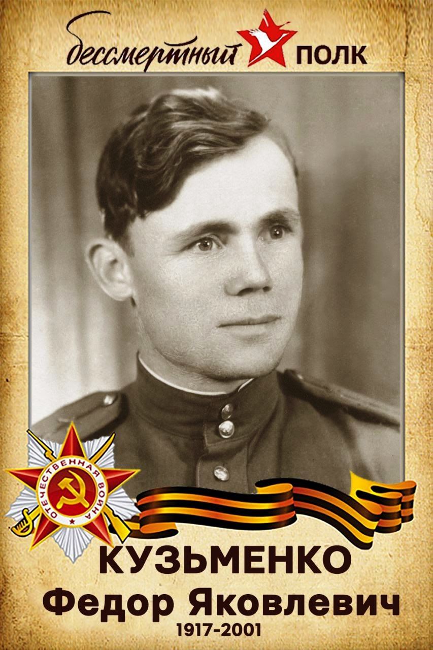 Участник Великой Отечественной войны! Род войск: Артиллерия. Воинское звание: Капитан. Воинская должность: Командир батареи. Награды: -Орден Красной Звезды (2) -Орден Отечественной войны I степени -Медаль «За победу над Германией в Великой Отечественной войне 1941—1945 гг.» -Юбилейная медаль «Двадцать лет Победы в Великой Отечественной войне 1941—1945 гг.» -Юбилейная медаль «Тридцать лет Победы в Великой Отечественной войне 1941—1945 гг.» -Юбилейная медаль «50 лет Вооруженных Сил СССР» -Медаль "За доблестный труд в ознаменование 100 летия В.И. Ленина". Кузьменко Фёдор Яковлевич, 1917 года рождения, родился в селе Захарьевка Першотравневого р-на Донецкой области в семье крестьянина. В настоящее время место его рождения с учётом всех территориальных изменений значится как РФ, Донецкая Народная Республика, Мангушский район, село Стародубовка. По национальности украинец. Образование 7 классов. Член КПСС 1941 года. Был женат. В 1932 году окончил 7 классов захарьевской начальной средней школы, после чего поступил ФЗО завода “Азовсталь” города Жданова, где её окончил в 1934 году. После окончания школы ФЗО работал токарем в депо паровозов завода “Азовсталь”. В 1940 году в декабре месяце, был призван в ряды советской армии. 22 июня 1941 года вступил в бой с немецко-фашистскими захватчиками. С мая по октябрь 1943 года был слушателем Днепропетровского артучилища, а с октября 1943г. по август 1944г. являлся слушателем 27 учебного офицерского артполка Сибирского военного округа. Во время защиты родины командовал артиллерийской батареей. Войну закончил в звании капитана. За защиту родины награждён 2 орденами Красной звезды. Был дважды ранен. В мае 1946 года, был демобилизован из рядов советской армии. С февраля 1947 года начал свою послевоенную трудовую деятельность в селе Захарьевка Першотравневого р-на Донецкой области. В дальнейшем работал на разных должностях колхоза "Заря" Першотравневого района, села Стародубовки. На всех участках, где трудился Фёдор Яковлевич, он с большой ответственностью относился к порученному делу. В 80-х годах прошлого века вышел на пенсию. Был также награждён многими юбилейными медалями, как ветеран ВОВ. Умер Фёдор Яковлевич 14.06.2001 году в селе Стародубовка.