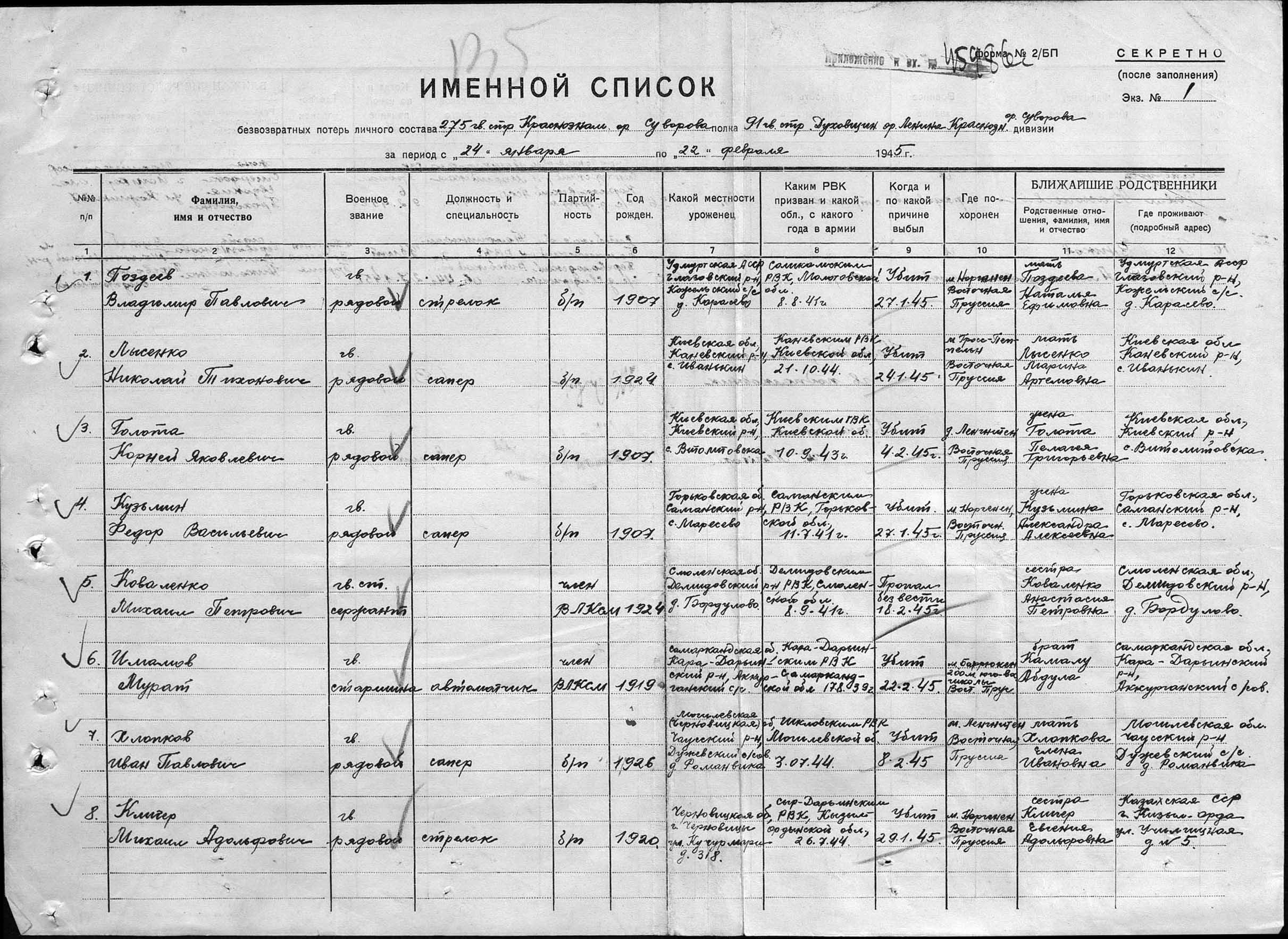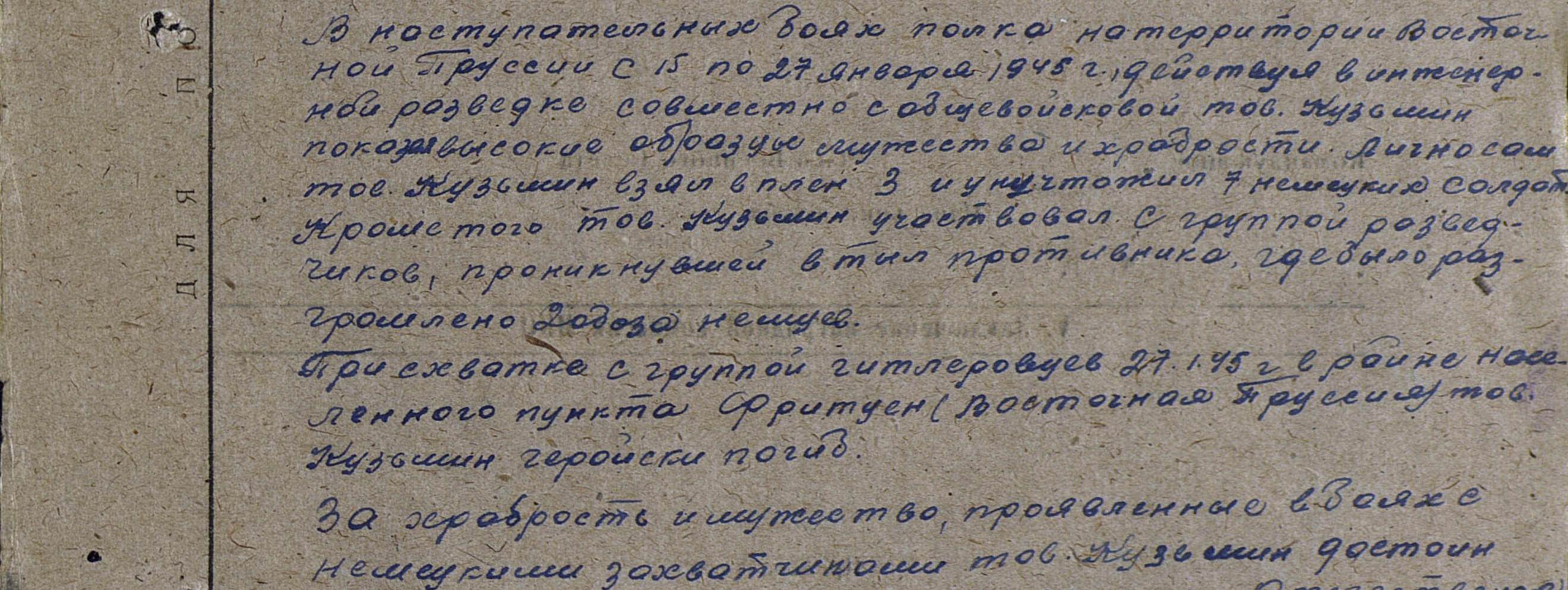боевого задания, сапер рядовой Кузьмин Федор Васильевич 19 марта 1945 г.
