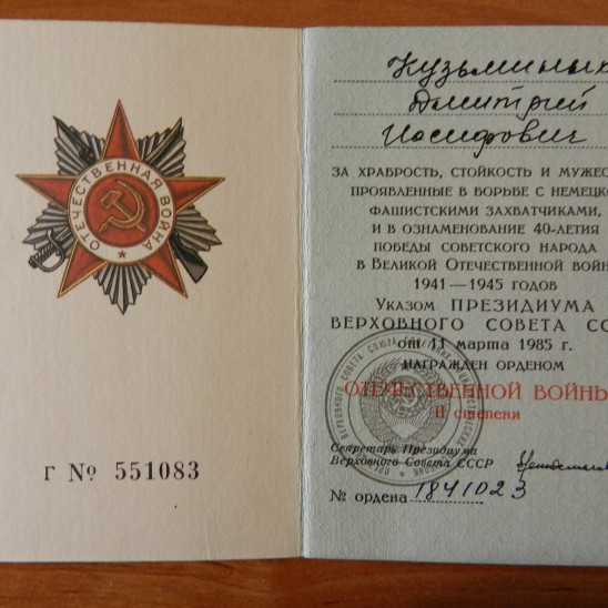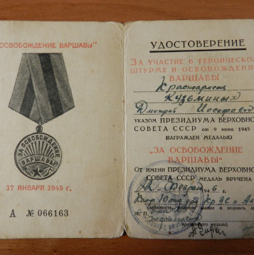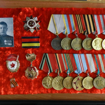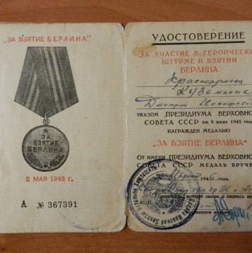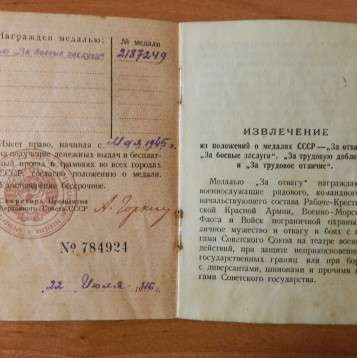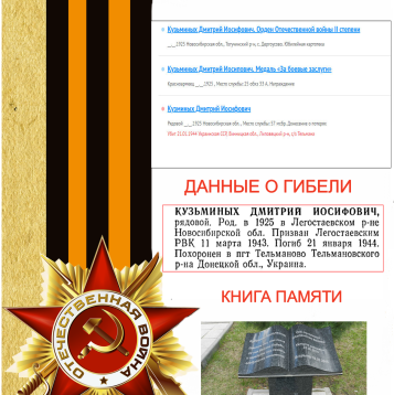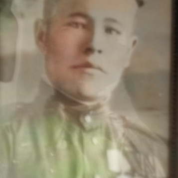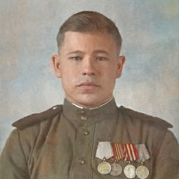 Родился 11 ноября 1925 г. в п. Подгорный Легостаевского р-она Новосибирской области. Окончил семь классов и в 17 лет в 1942 г. ушел на фронт. С боями дошел до Берлина, расписался на Рейхстаге. Во время боев форсировал реки, Днепр, Висла, Одер. Освобождал Кенигсберг, ныне Калининград. Шофер-химик 25 отдельный батальон химической защиты. Дважды ранен, легкое и тяжелое ранение. Осколки мелкие еще долго выходили после войны. Во время войны не стали удалять осколки, так как могла наступить смерть. В 1944 году пришла похоронка. Похоронка с места гибели: (погиб 21 января 1944г Тельмановский р-он Тельманово Донецкая область Украина). По воспоминаниям отца, было это так. Батальон был сильно потрепан и попал в окружение на Украине. Чтобы легче было двигаться к линии фронта, разделились на группы. В группе где был отец, состояла из пяти человек. К ночи подошли к хутору и зашли в амбар, где хранилось зерно. Утром работница зашла в амбар и увидела сапог в куче. Она испугалась, но подошла и окликнула. Солдаты откликнулись, она увидела оборванных, грязных, голодных солдатиков. Перепрятала их в сарае, накормила, зашила рваную форму и сказала, что немцы таскают солому в окопы, утепляют. Получается это надолго. Дождавшись вечера, поблагодарив хозяйку, они двинулись в путь. Через три дня встретились с партизанами. Те их обогрели, накормили, при переодевании, партизаны увидели у одного бойца вокруг тела боевое знамя. Так вместе воевали какое то время с партизанами и при встрече с регулярными частями, рассказали про знамя. Был вновь пополнен полк бойцами, и отправлен на фронт. Вот так и получили родные похоронку, к счастью он остался жив. Похоронку затеряли в формировавшемся школьном музее в 1975-1977гг, отец очень был расстроен этим фактом. Помогал восстанавливать разрушенные войной города в Германии. Передавал военный опыт молодым призывникам. Демобилизовался в 1948г. После войны работал на селе в животноводстве, был бригадиром, неоднократно поощрялся. После выхода на пенсию, к сожалению, прожил до 65 лет, сказались фронтовые ранения. Умер в 1990 г.. Награжден боевыми наградами медалью "За боевые заслуги" медалью "За освобождение Варшавы", медалью "За взятие Берлина", медалью", "За победу над Германией", орденом "Отечественной Войны 2-ой степени". Награжден грамотой от И.В. Сталина. Юбилейными медалями Юбилейными медалями За добросовестный и продолжительный труд, награжден медалью