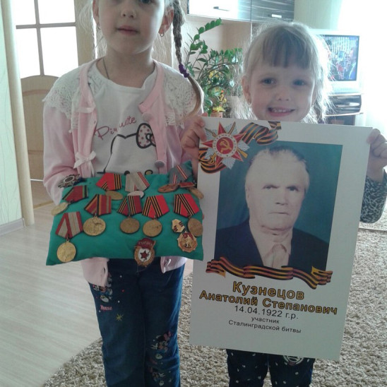 Кузнецов Анатолий Степанович (14.04.1922-17.10.1999) участвовал в боях Великой Отечественной войны с 22 июня 1941 года по 14 марта 1943 года.На войну был призван в SГВ. Артиллерийский полк разведчиком в июне 1941 года. В бою под Сталинградом был тяжело ранен в коленный сустав левой ноги 14 марта 1943 года. Лежал в Эвакогоспитале No 1426 на излечении по ранению в марте 1943 года. Уволен в запас 20 августа 1943 года по ранению. Награжден правительственными наградами: Медаль за Оборону Сталинграда, Медаль За победу над Германией и другими медалями. Помним и гордимся своим отцом, дедом и прадедом. Вечная слава!