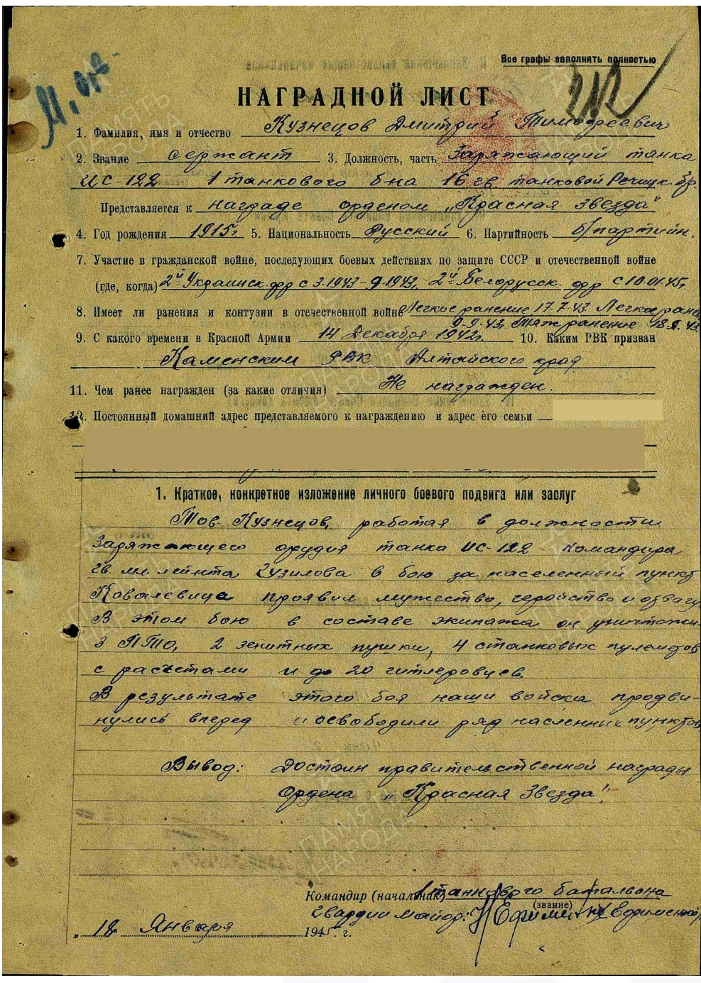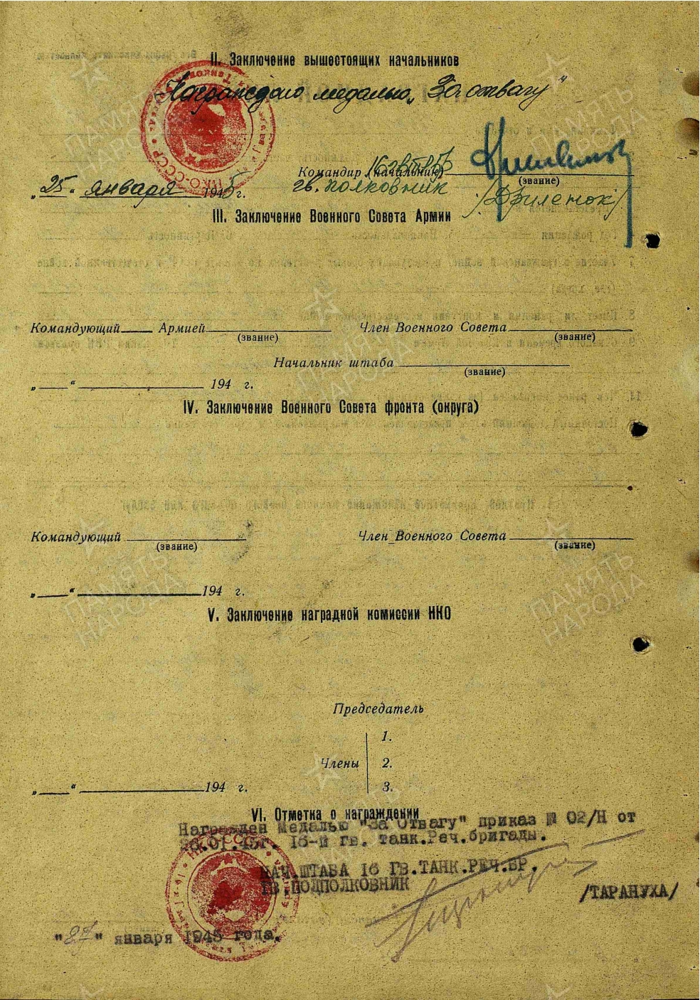 Звание сержант Место рождения Алтайский край, Каменский р-н, с. Плотниково; с. Плотниково Дата рождения __.__.1915 Дата призыва 14.12.1942 Места службы Барнаульский ВПП; в/ч п/п 41784; Каменский РВК, Алтайский край; 16 гвардейская танковая бригада; 1 гвардейский танковый корпус; 288 зсп; 298 сд 1945 — Информация из донесений о безвозвратных потерях Звание сержант Дата рождения __.__.1915 Место рождения Алтайский край, Каменский р-н, с. Плотниково Дата призыва 14.12.1942 Место призыва Каменский РВК, Алтайский край, Каменский р-н Последнее место службы 1 гв. тк 1 танк. бат. Дата выбытия 02.02.1945 Причина выбытия убит Информация о захоронении Польша, д. Бромки Звание красноармеец Дата рождения __.__.1915 Место рождения Алтайский край, Каменский р-н, с. Плотниково Место призыва Каменский РВК, Алтайский край, Каменский р-н Военно-пересыльный пункт 288 зсп Куда убыл из пункта 298 сд