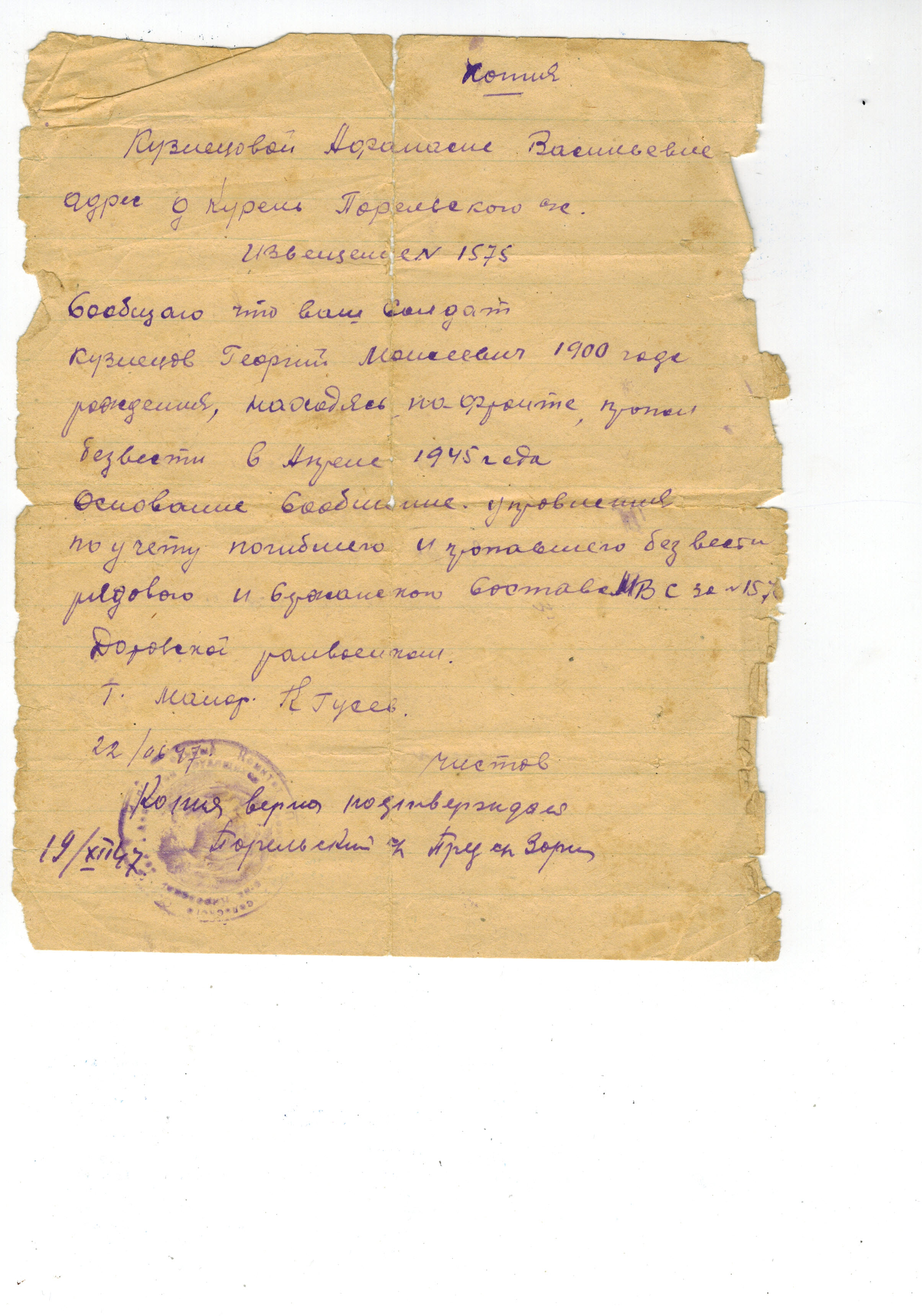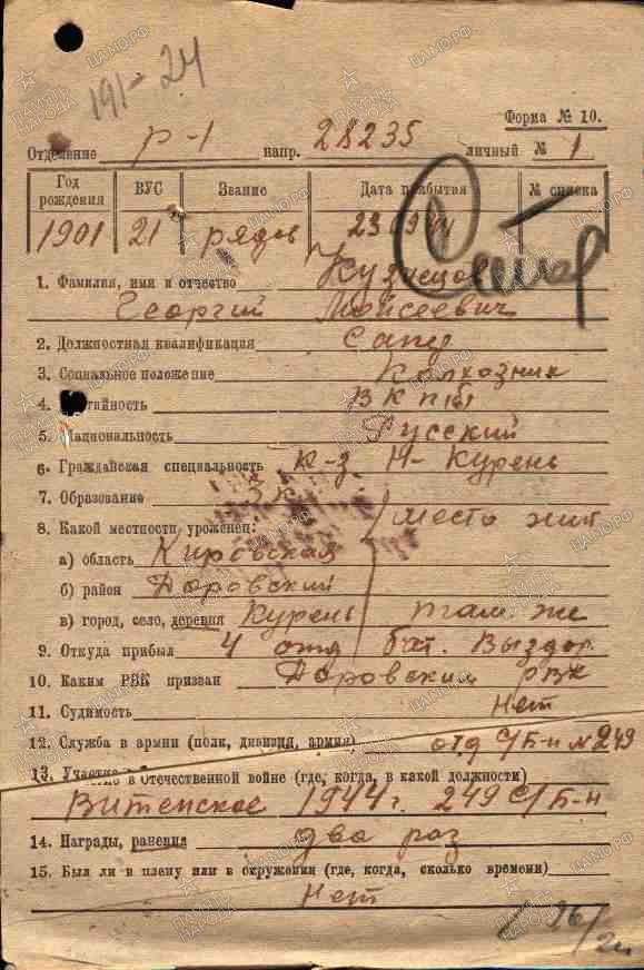 Кузнецов Георгий Моисеевич был призван в 1941 г, служил сапером в 249-й отдельном инженерно-сапёрном батальоне, в сентябре 1944 года награжден отпуском домой, пропал безвести в апреле 1945 при взятиии Кёнигсберга