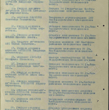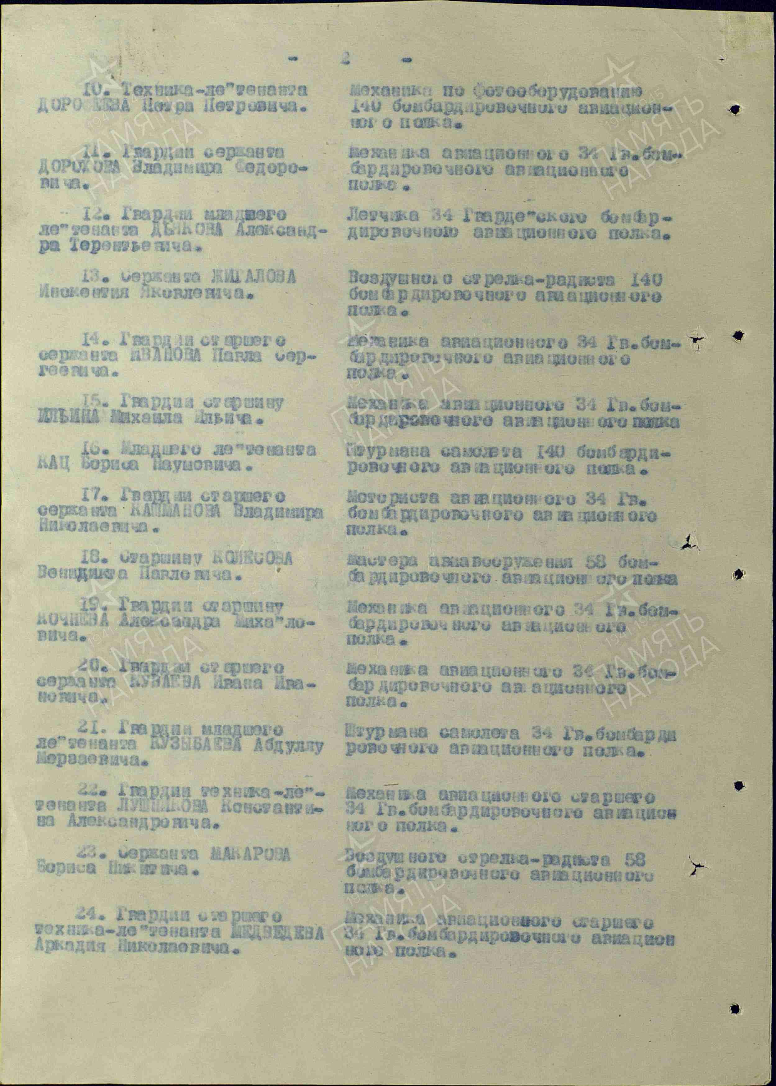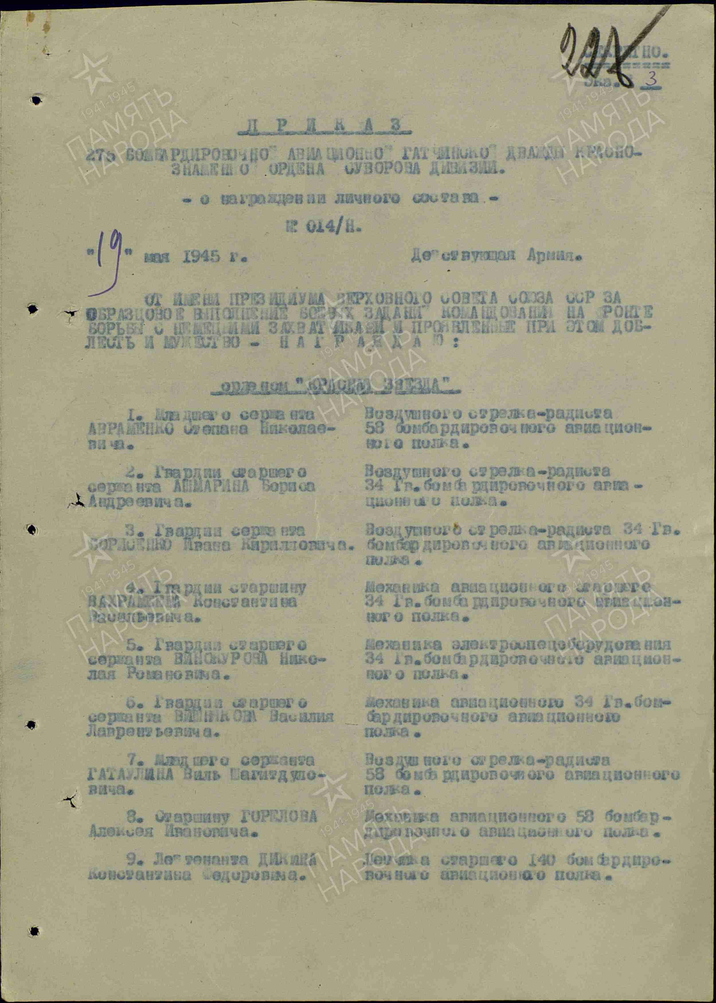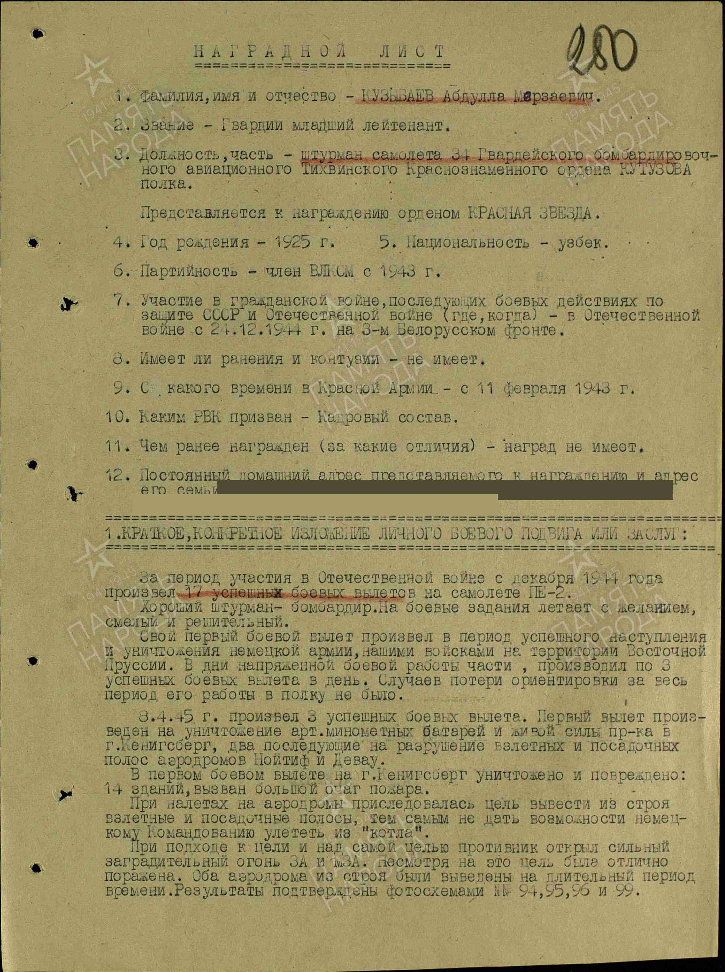 За период участия в Отечественной войне с декабря 1944 года произвел 17 успешных боевых вылетов на самолете ПЕ-2. Хороший штурман- бомбардир. На боевые задания летает с желанием, смелый и решительный. Свой первый боевой вылет произвел в период успешного наступления и уничтожения немецкой армии, нашими войсками на территории Восточной Пруссии. дни напряженной боевой работы части, производил по 3 успешных боевых вылета в день. Случаев потери ориентировки за весь период его работы в полку не было. 8.4.45 г. произвел 3 успешных боевых вылета. Первый вылет произведен на уничтожение арт. минометных батарей и живой силы пр-ка в г Кенигсберг, два последующие на разрушение взлетных и посадочных полос аэродромов Нойтиф и Девау. В первом боевом вылете на г. Кенигсберг уничтожено и повреждено: 14 зданий, вызван большой очаг пожара. При налетах на аэродромы преследовалась цель вывести из строя взлетные и посадочные полосы, тем самым не дать возможности немецкому Командованию улететь из "котла". При подходе к цели и над самой целью противник открыл сильный заградительный огонь ЗА и МЗА. Несмотря на это цель была отлично поражена. Оба аэродрома из строя были выведены на длительный период времени Результаты подтверждены фотосхемами №№ 94,95,96 и 99. 16.4.45 г. в составе группы ПЕ-2 с 2-х заходов бомбардировал живую силу и технику пр-ка в г. Фишхаузен. в результате бомбометания уничтожено: 4 здания,5 автомашин, 3 ж.д. вагона, разрушено 25 мт. ж.д. полотна, отмечено 5 прямых попаданий по траншеям и вызвано 14 очагов пожара. Результат бомбометания подтвержден фотосхемой № 121. 24.4.45 г. дважды вылетал на уничтожение живой силы и техники пр-ка в г. Пиллау и р-не стрельбища. в результате бомбометания в г. Пиллау разрушено и повреждено: 61 здание, возникло 11 очагов пожара, уничтожено 2 орудия зенитной батареи поврежден пирс сожжено 10 автомашин уничтожено 5 ж.д. вагонов, разрушено 50 мт. ж.д. полотна и отмечено 9 прямых попаданий по траншеям и огневым точкам