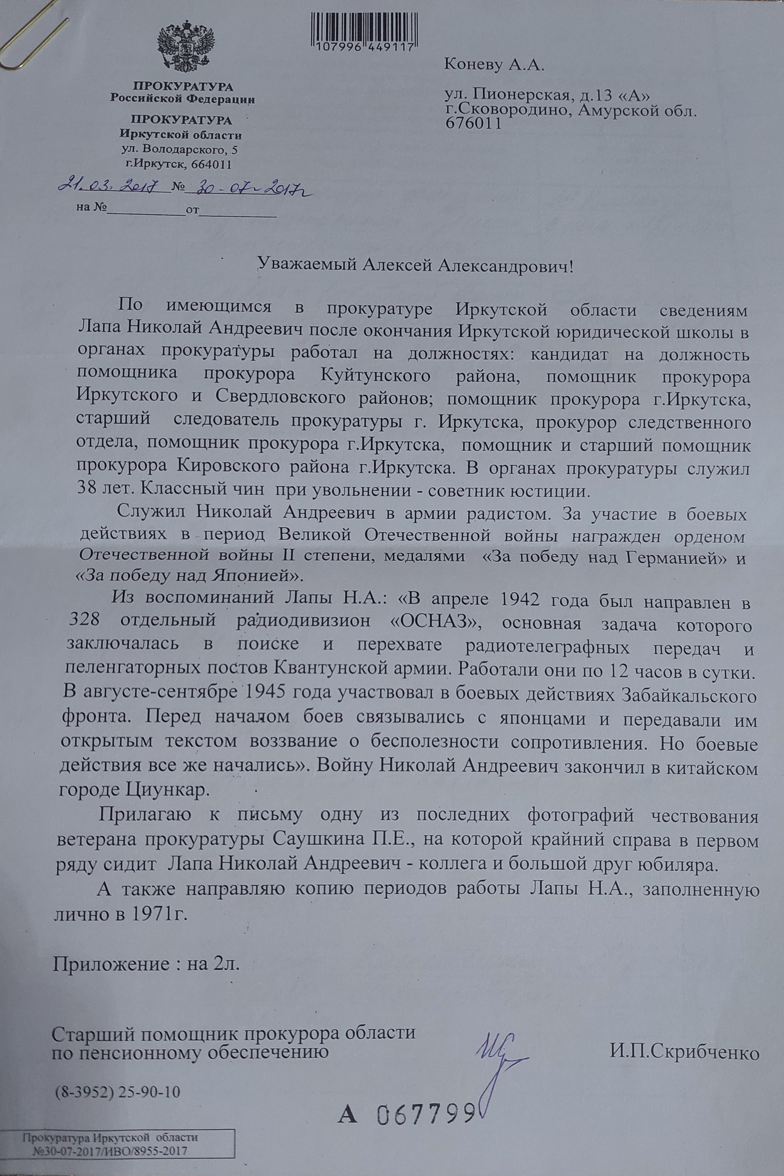 Служил Николай Андреевич в армии радистом. За участие в боевых действиях в период ВОВ награжден орденом Отечественной войны II степени, медалями "За победу над Германией" и "За победу над Японией". Из воспоминаний Лапы Н.А.: "В апреле 1942 был направлен в 328 отделеный радиодивизион "ОСНАЗ", основная задача которого заключалась в поиске и перехвате радиотелеграфных передач и пеленгаторных постов Квантунской армии. Работали по 12 часов в сутки. В августе-сентябре 1945 года участвовал в боевых действиях Забайкальского фронта. Перед началом боёв связывались с японцами и передавали им открытым текстом воззвание о бесполезности сопротивления. Но боевые действия всё же начались. Войну Николай Андреевич закончил в китайском городе Циункар. Окончил Иркутскую юридическую школу. Работал в органах прокуратуры на должностях: кандидат на должность помощника прокурора Куйтунского района, помощник прокурора Иркутского и Свердловского районов г. Иркутска, помощник прокурора г. Иркутска, прокурор следственного отдела, помощник и старший помощник прокурора Кировского района г. Иркутска. В органах прокуратуры служил 38 лет. Класный чин при увольнении - советник юстиции.