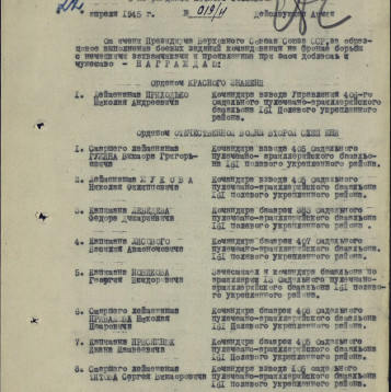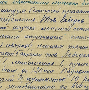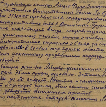 Лебедев Федор Дмитриевич родился в 1916 году в г. Мензелинске Татарской АССР, был призван на службу в РККА в июне 1941 года. В начале войны закончил артиллерийские командные курсы. Воевал в звании капитана на I и II Белорусском фронте, командовал 2-ой арт батареей (383 отдельного пулеметно-артиллерийского батальона 161 полевого укрепленного района). Участвовал в боях на Орлово-курской дуге, при взятии Кенигсберга, в боях на Восточной Пруссии, при Взятии Берлина и освобождении Праги.