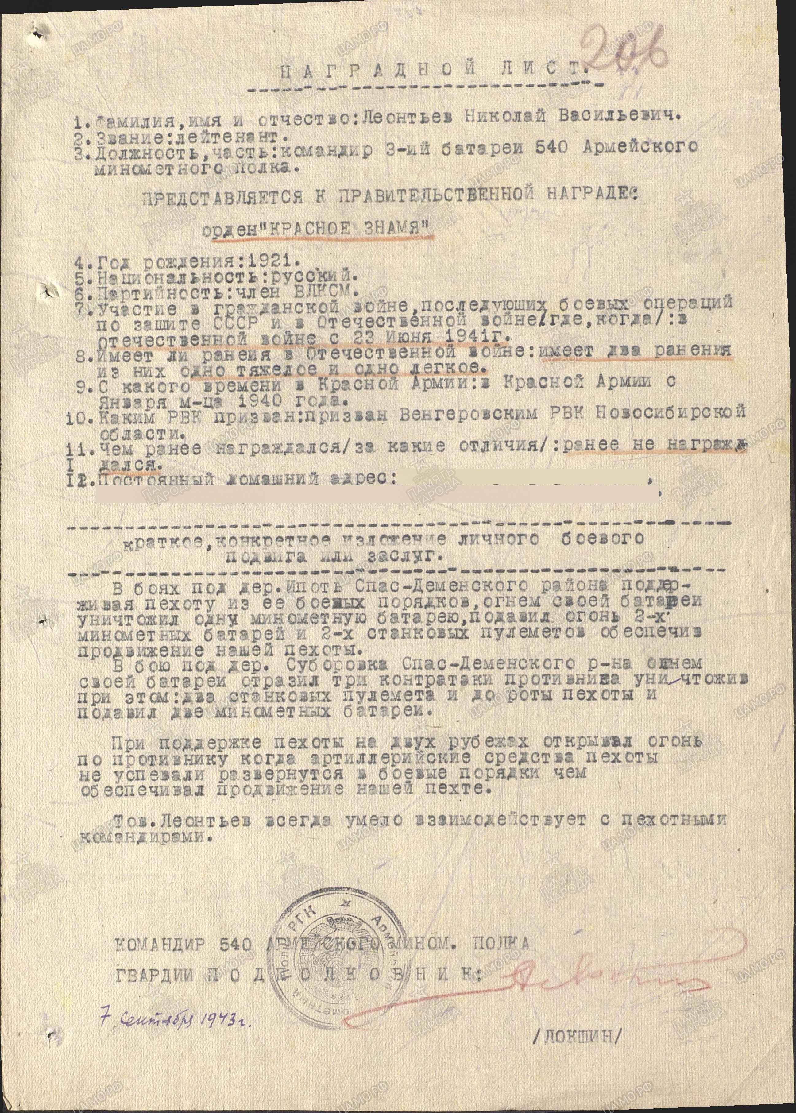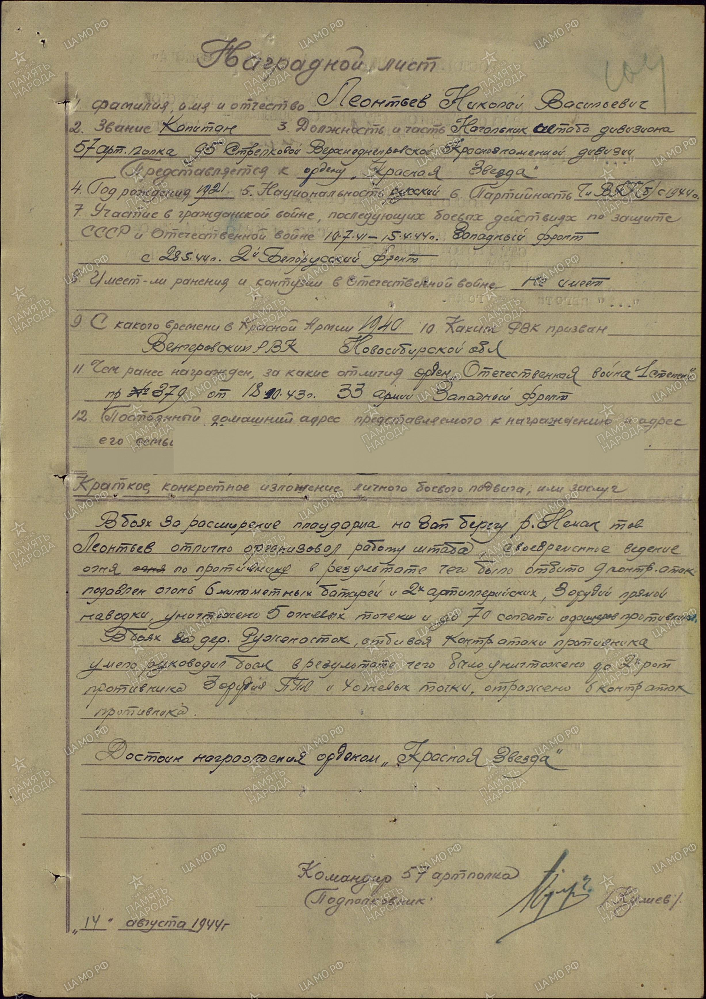 Леонтьев Николай Васильевич, майор, родился 15 августа 1921 года.