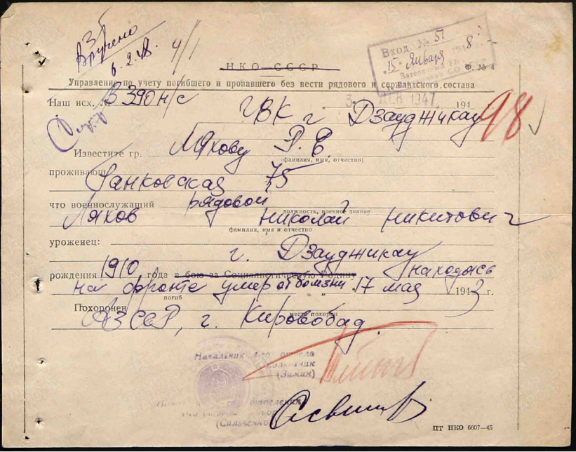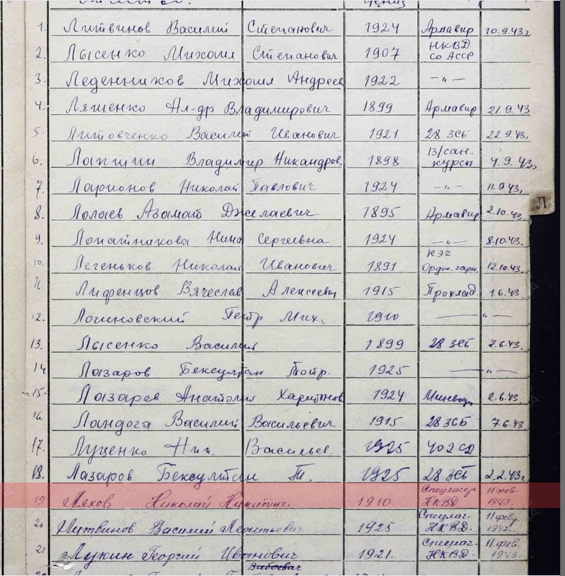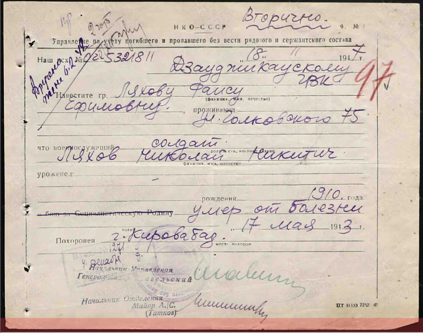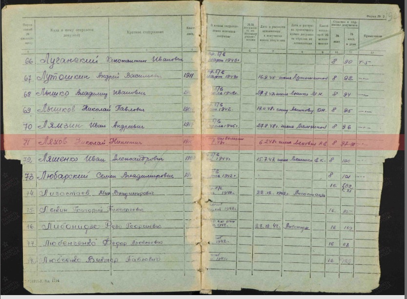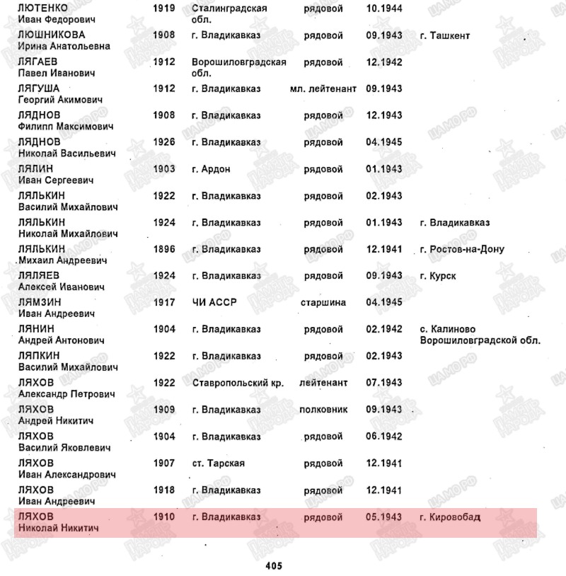 Мой прадед Николай Никитич родился в 1910 году. Дата и месяц не известны мне. Жил в г. Орджоникидзе на улице Галковского 75. У него была жена Раиса Ефимовна 25.07.1910 года рождения и сыновья. В 11.02.1943 прадед был призван рядовым в спец лагерь НКВД. Находясь на фронте, умер от болезни 17.05.1943 года. Я застала свою про бабушку Раису, которая умерла 10.11.1989 года и была похоронена во Владикавказе и ее сына, моего деда Николая Николаевича Ляхова 07.12.1934-31.08.1992 гг. Похоронен рядом с матерью.