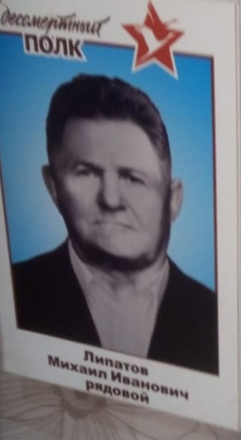 Мы склоняем головы перед памятью миллионов погибших защитников Отечества, чей подвиг привёл к победе над врагом. Вечная им слава! Вечная память! Давайте соприкоснёмся с внутренним миром человека, солдата-воина. Ведь прежде всего – это чей-то отец, сын, брат, у которого война отняла возможность мирно жить, учиться, работать и находиться рядом со своими близкими. Неугасима память поколений . Вот одним из защитников Отечества был мой дед Липатов Михаил Иванович - ветеран Великой Отечественной воны. Родился он 1 января 1910 года в Стерлитамакском районе поселке Ново-Николаевка. В 1941 году был призван Стерлитамакским районвоенкоматом на военную службу. Всю войну с 1941-1945 года он прошел рядовым и был награжден медалями "За отвагу", за боевые и заслуги" и множество других медалей и наград ... После войны он всю оставшуюся жизнь проработал в родном поселке Ново-Николаевка.
