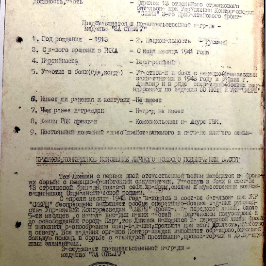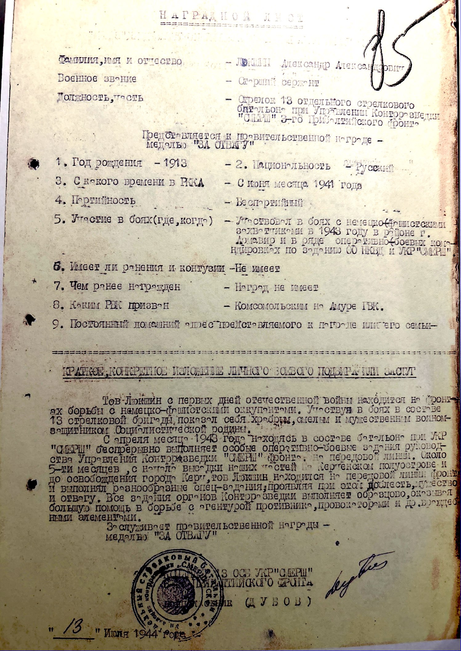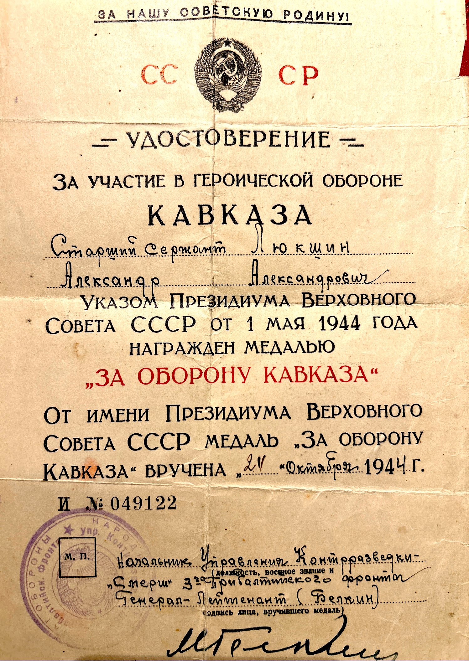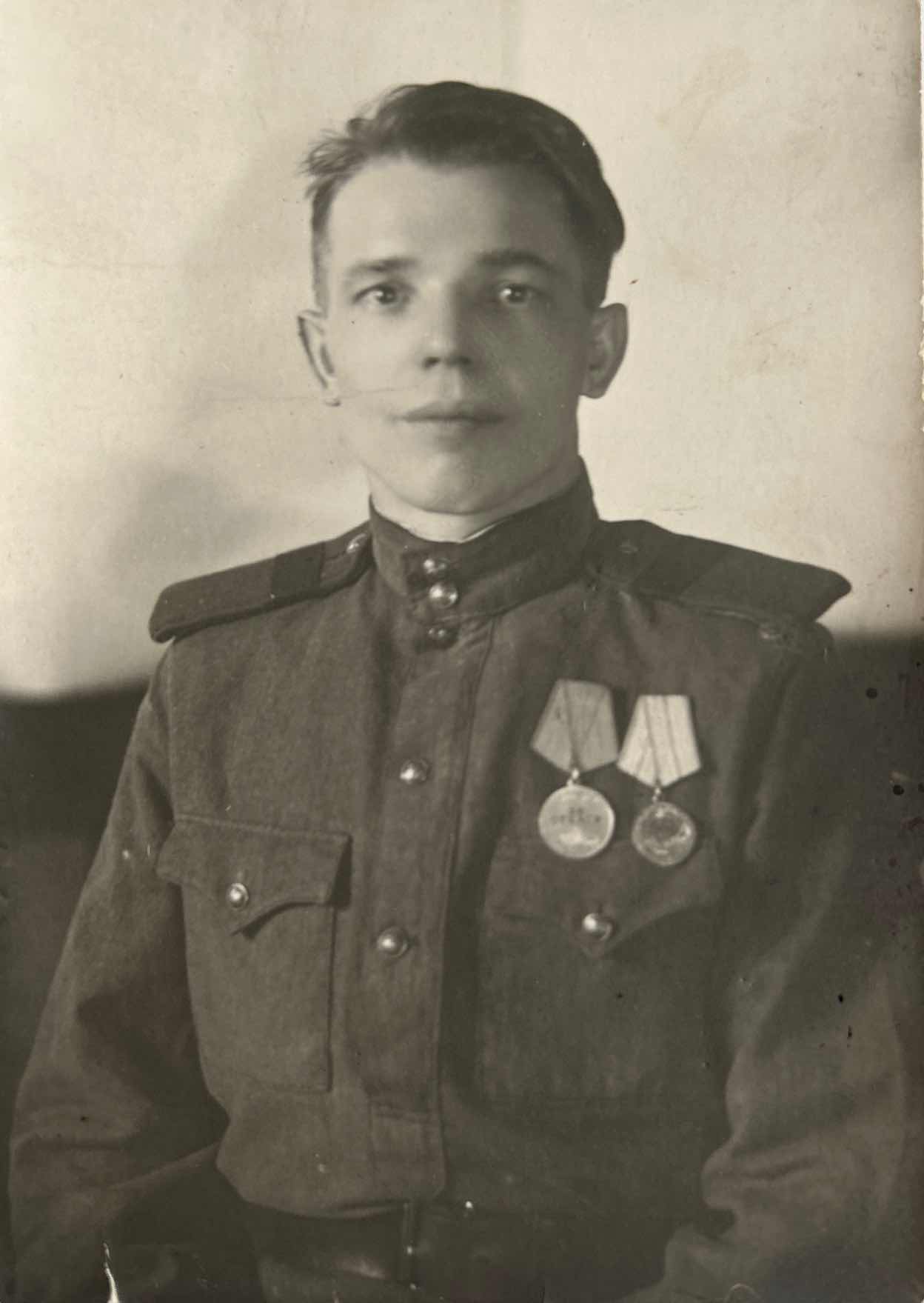 Июнь 1941 года-Призван по мобилизации Комсомольск- на - Амуре, прожекторная рота, прожекторист Февраль 1942- 113 отдельная стрелковая бригада- разведчик Август 1942- 13 отдельный стрелковый батальон при Управлении Контрразведки фронта Сев. Кавказа- связной Выполнял особые оперативно-боевые задания руководства УКР «СМЕРШ» на передовой линии фронта, с начала высадки наших частей на Керченском полуострове и до полного освобождения города Керчь. Награжден правительственной наградой - медалью «За отвагу», « За оборону Кавказа» В 1945 участвовал в боях за взятие Будапешта. Закончил войну в Вене, продолжал службу до 1950 г. После войны работал инкассатором в Госбанке СССР