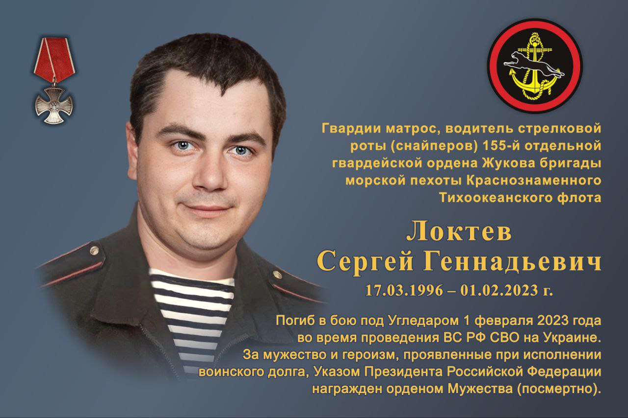 Сергей Геннадьевич Локтев родился 17 марта 1996 года в городе Миллерово, Ростовская область. Рос и жил в слободе Криворожье, Миллеровского района, Ростовской области. Учился в МБОУ Криворожской СОШ. После окончания 9 класса поступил в Государственное бюджетное учреждение начального профессионального образования Ростовской области Миллеровское казачье кадетское профессиональное училище г. Миллерово. Получил диплом по профессии слесарь по ремонту автомобилей 4 разряда. В 2015 году был призван на военную службу ОВК Ростовской области по г. Миллерово, Миллеровскому и Тарасовскому районам. За время прохождения службы в роте РХБ защиты войсковой части на должности водителя-химика взвода РХБ разведки роты РХБ защиты зарекомендовал себя грамотным, дисциплинированным, исполнительным военнослужащим. После прохождения военной службы вернулся в слободу Криворожье, где проживал и работал в ООО «Дон Агро» водителем. В 2019 году женился на Анастасии Андреевне с города Магадана. 07 марта 2020 года родился сын Михаил. В 2021 году переехали в город Магадан. 8 сентября 2022 года был призван по мобилизации в город Владивосток, откуда в последующем был отправлен на СВО. Был приписан к военной части 30926, 155 ОГВБРМП, ДШБ, 4 ДШР, 4 отделение, позывной: Козак. Рядовой, водитель стрелкового взвода (снайперов) 155-й отдельной бригады морской пехоты Краснознаменного Тихоокеанского флота. Погиб 01 февраля 2023 года на Угледарском направлении в районе Дач. Награжден орденом Мужества за мужество и героизм, проявленные при исполнении воинского долга (посмертно).