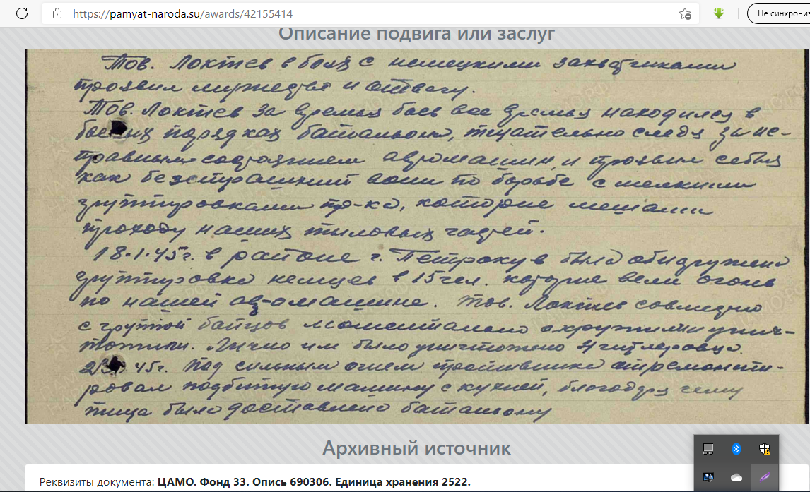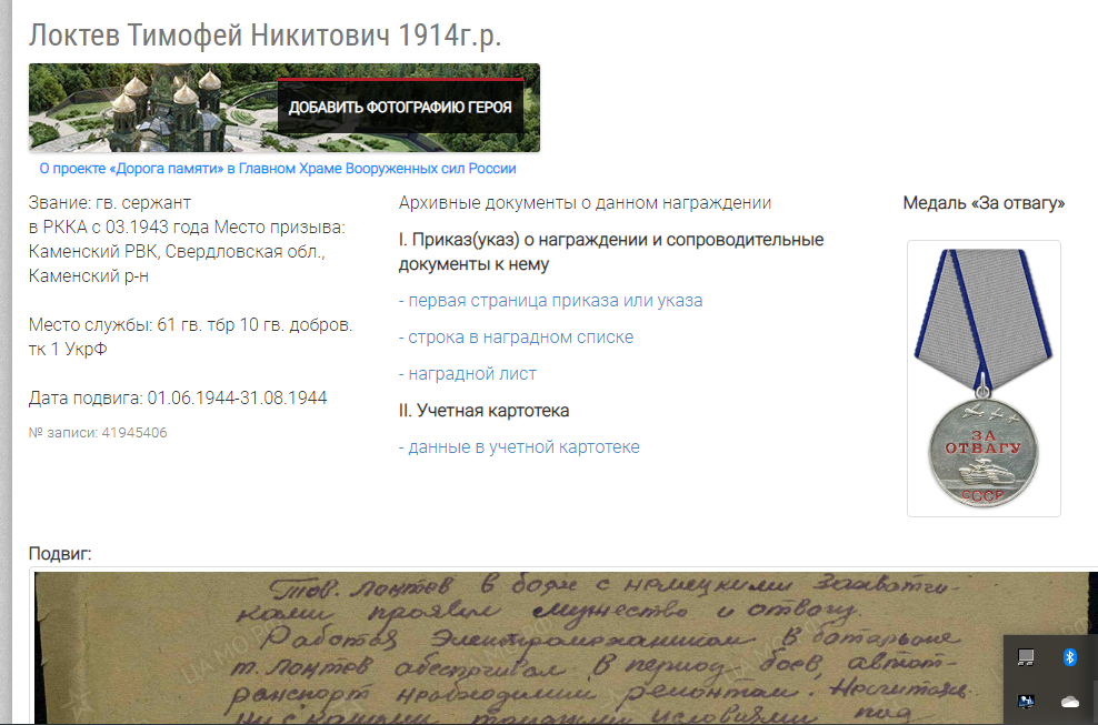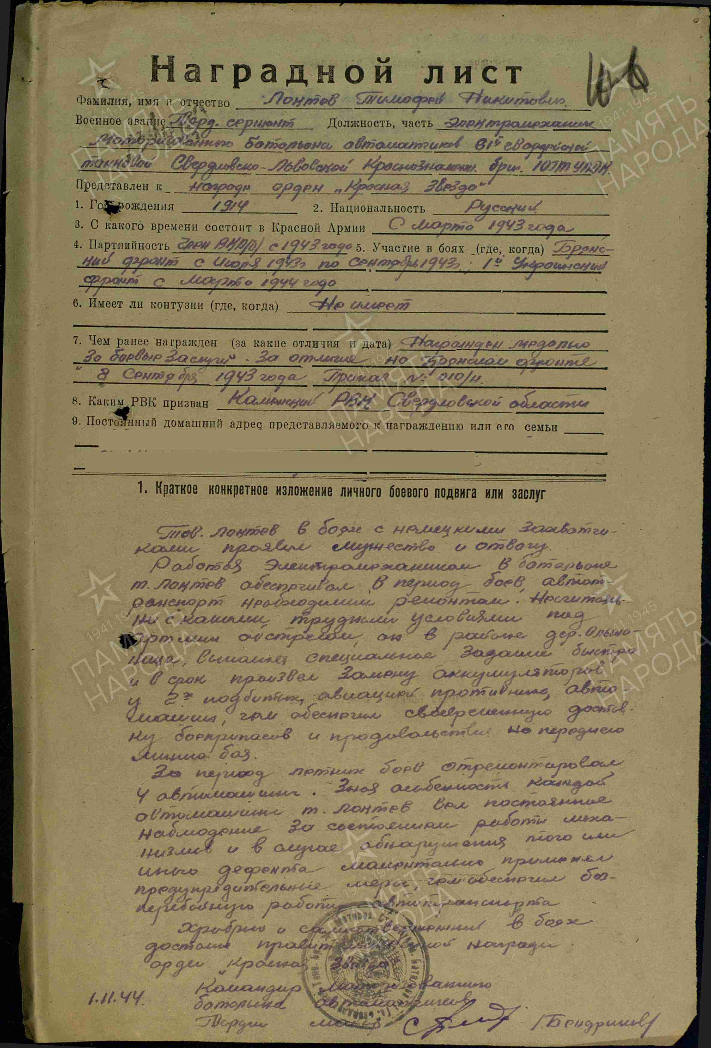 На службу поступил в марте 1943 г. Место призыва: Каменский РВК, Свердловской области, Каменского района. Награждён многочисленными медалями за отвагу, за боевые заслуги, за отличие на Брянском фронте, Орденом Красной звезды; и др. Имел ранения и контузию. Вернулся с Победой. Жил в Кустанае. Умер в мирное время.