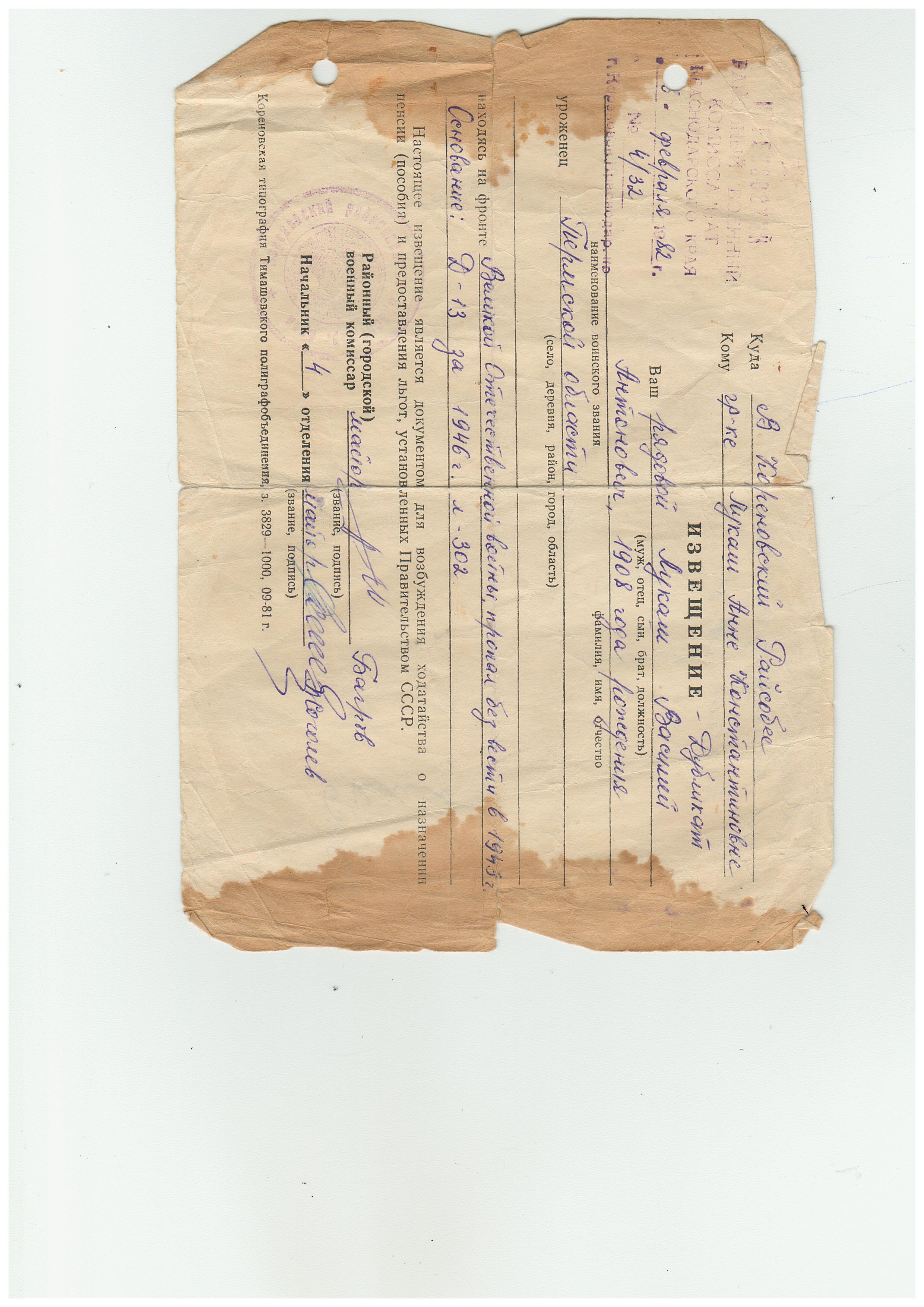 Пропал без вести 1943 году. Основания д-13 за 1946 г. л.302